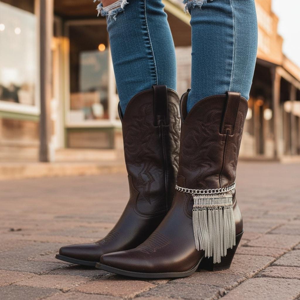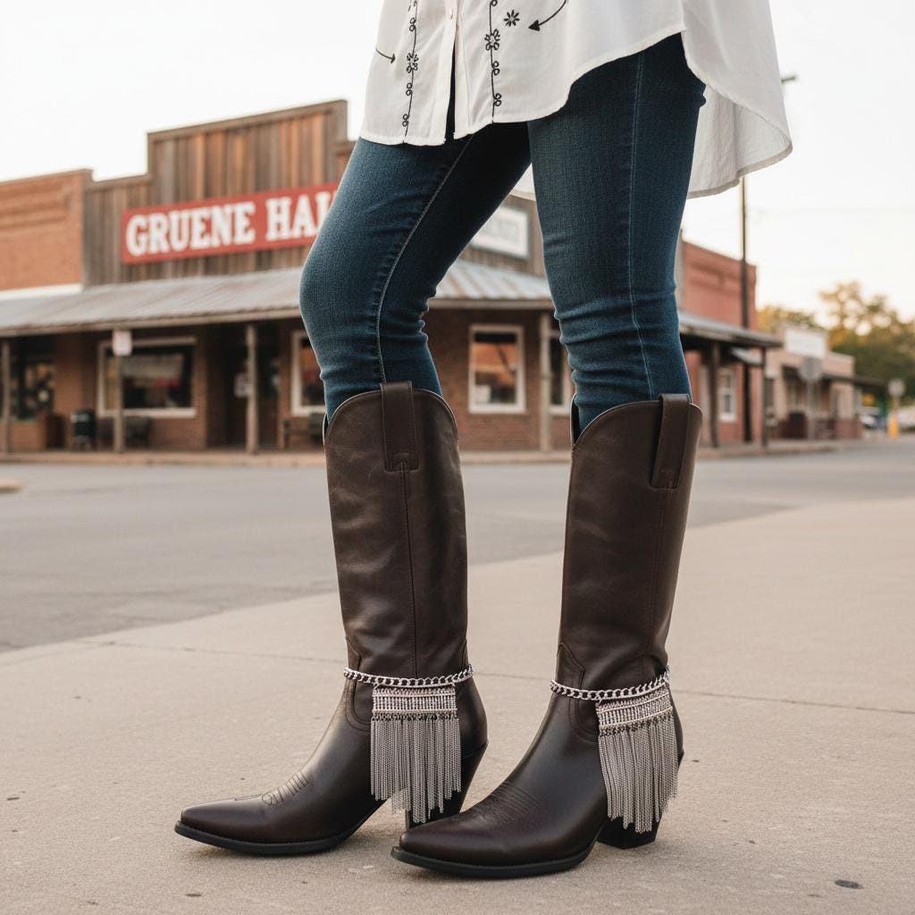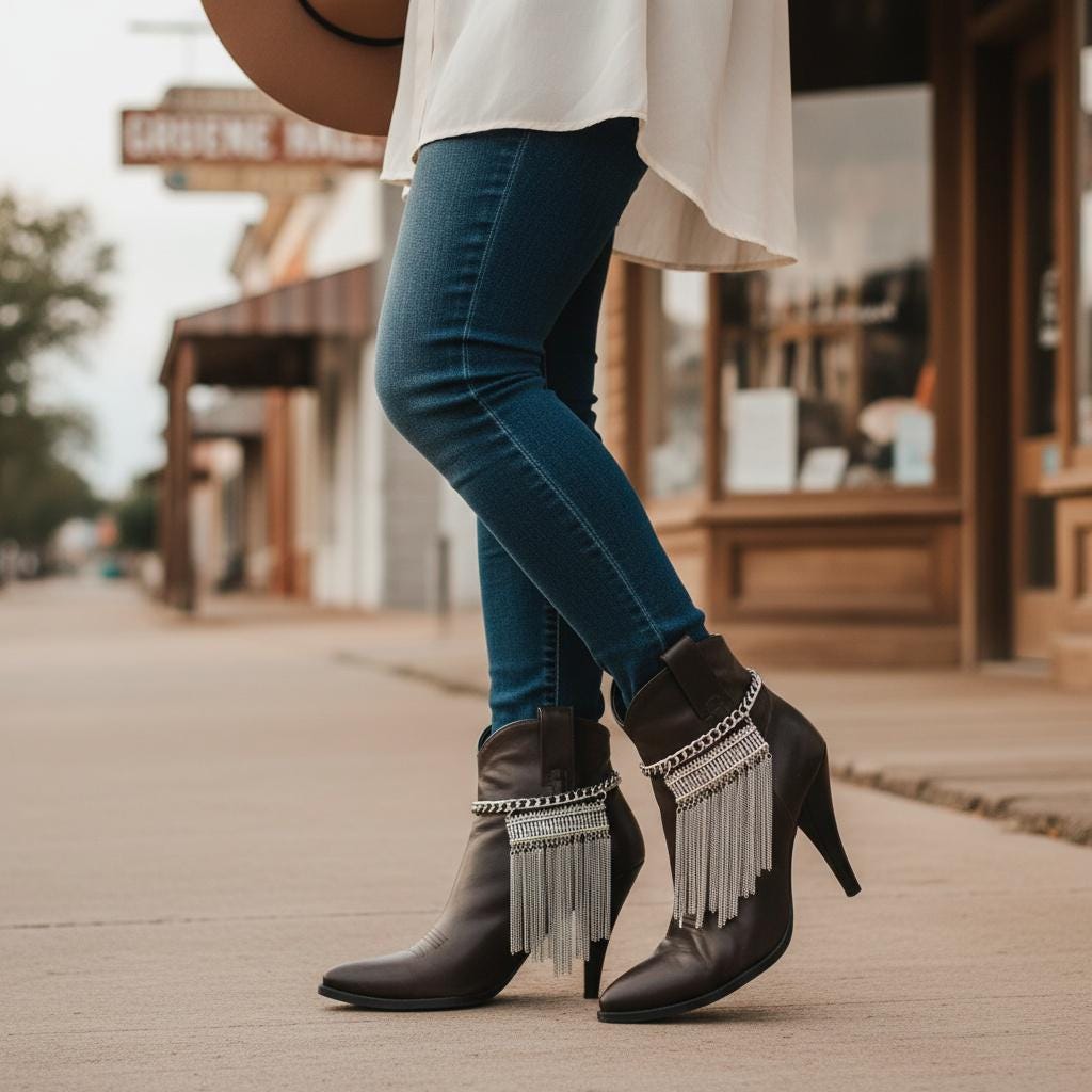 Want your boots to look styled in one step? This pair of silver-tone boot chain bracelets features a wide beaded fringe panel with long tassel strands that move when you walk (and really show off when you dance). It’s western-inspired, boho-friendly, and built to turn plain boots into a statement without needing a full outfit overhaul.