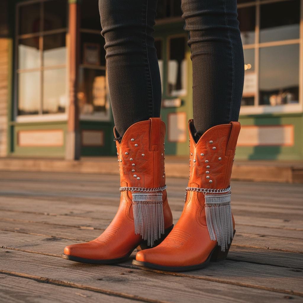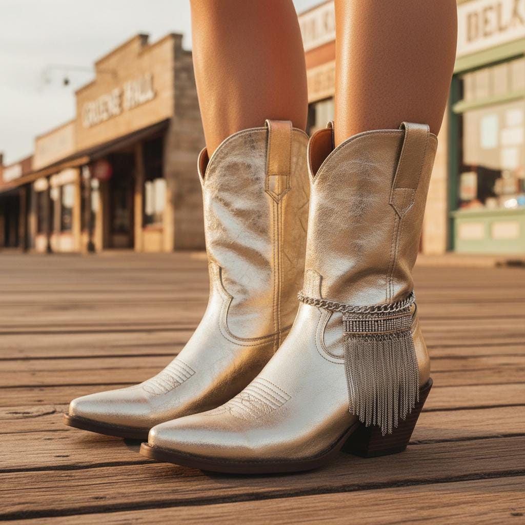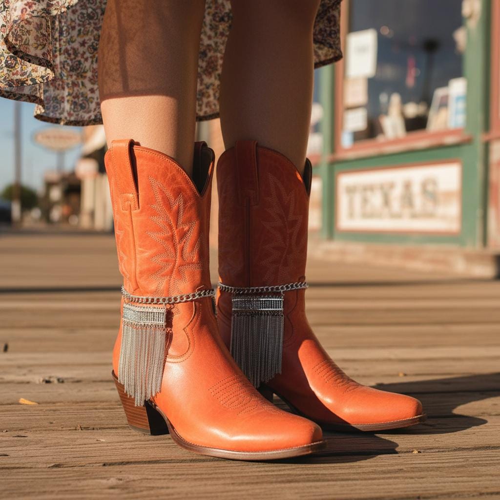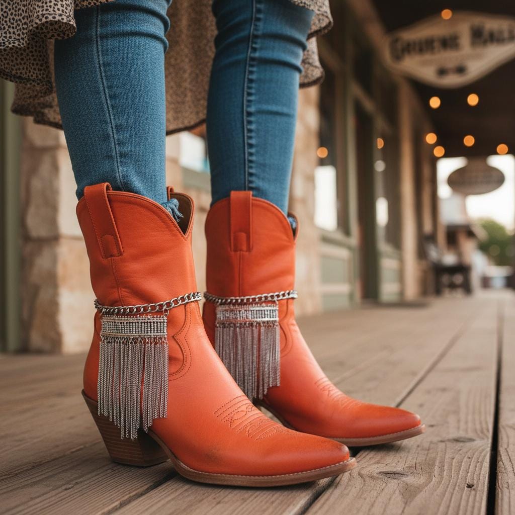 Want your boots to look styled in one step? This pair of silver-tone boot chain bracelets features a wide beaded fringe panel with long tassel strands that move when you walk (and really show off when you dance). It’s western-inspired, boho-friendly, and built to turn plain boots into a statement without needing a full outfit overhaul.