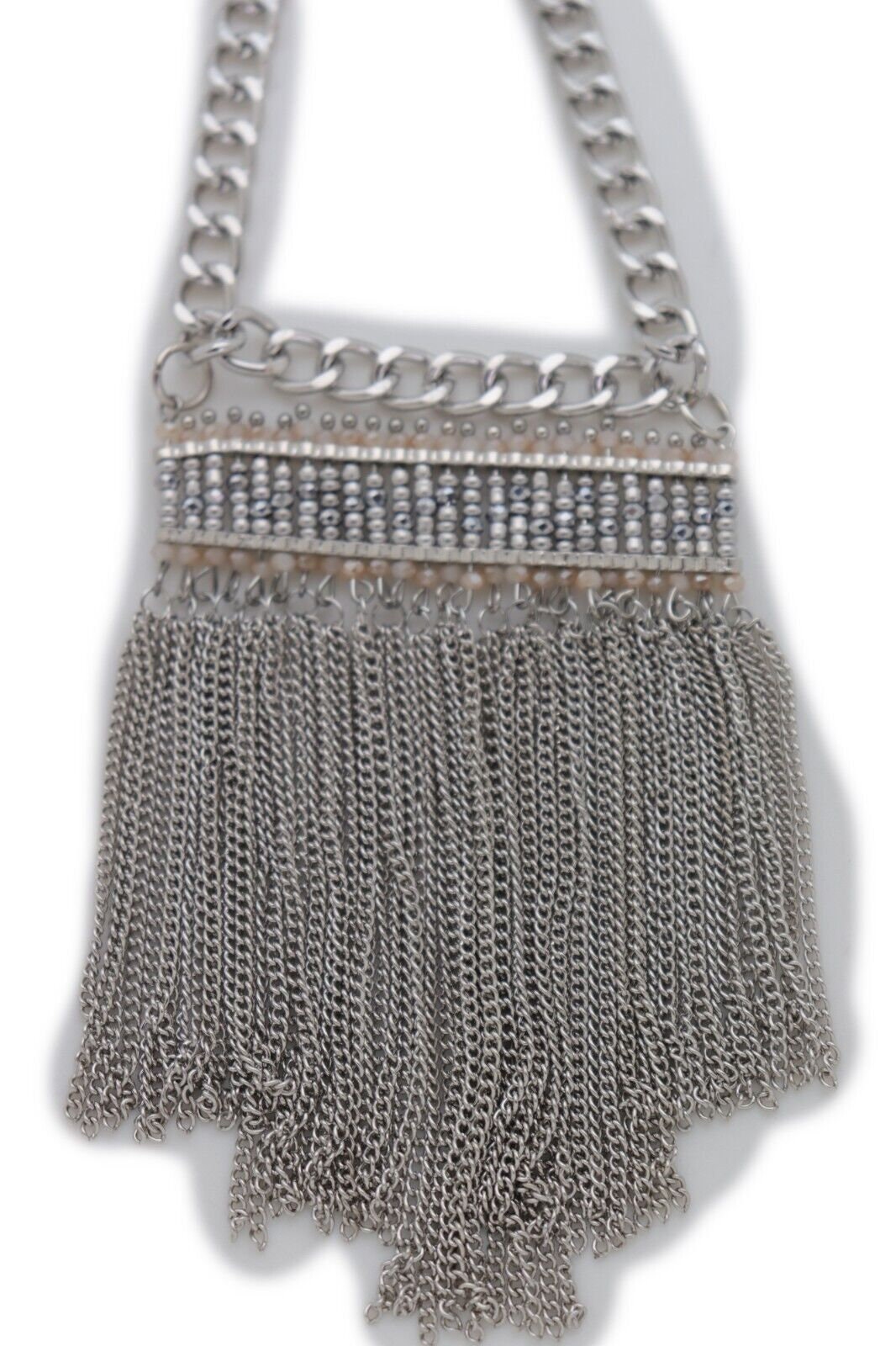 Color: Silver metal chain links and charm + silver tassel chain links + silver and white beads
