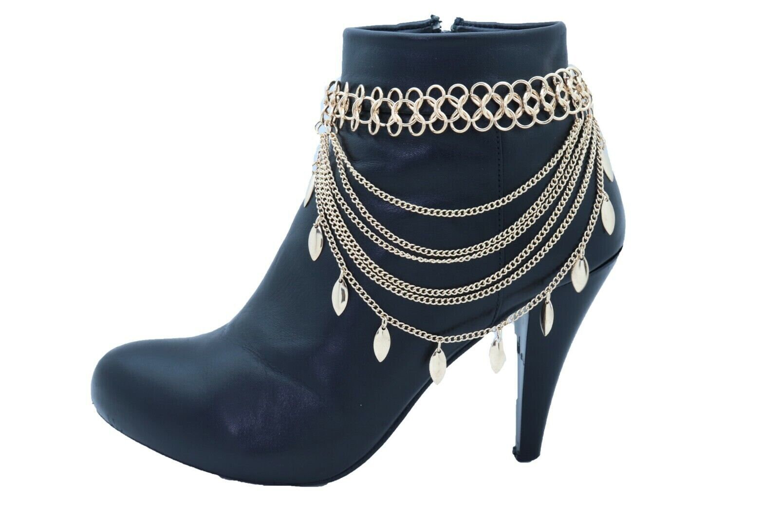 Gold Tone Boot Chain Bracelets Pair, Multi Strand Leaf Charm Shoe Jewelry BC158