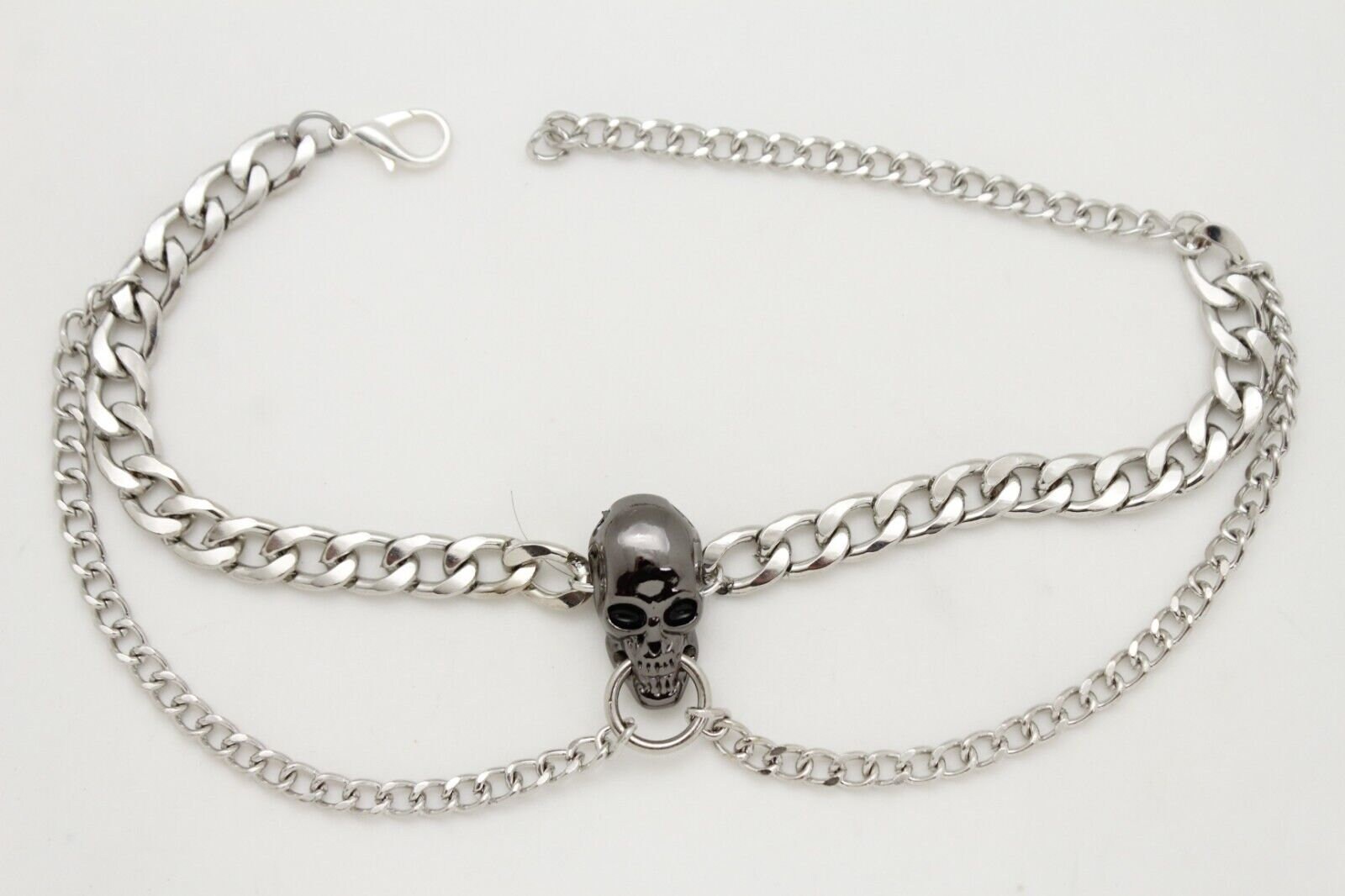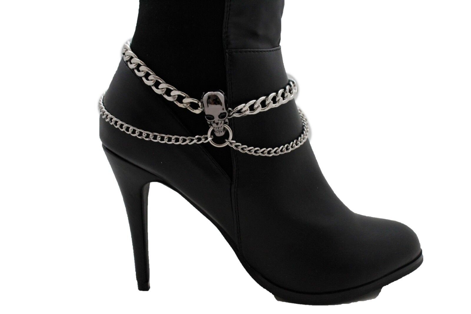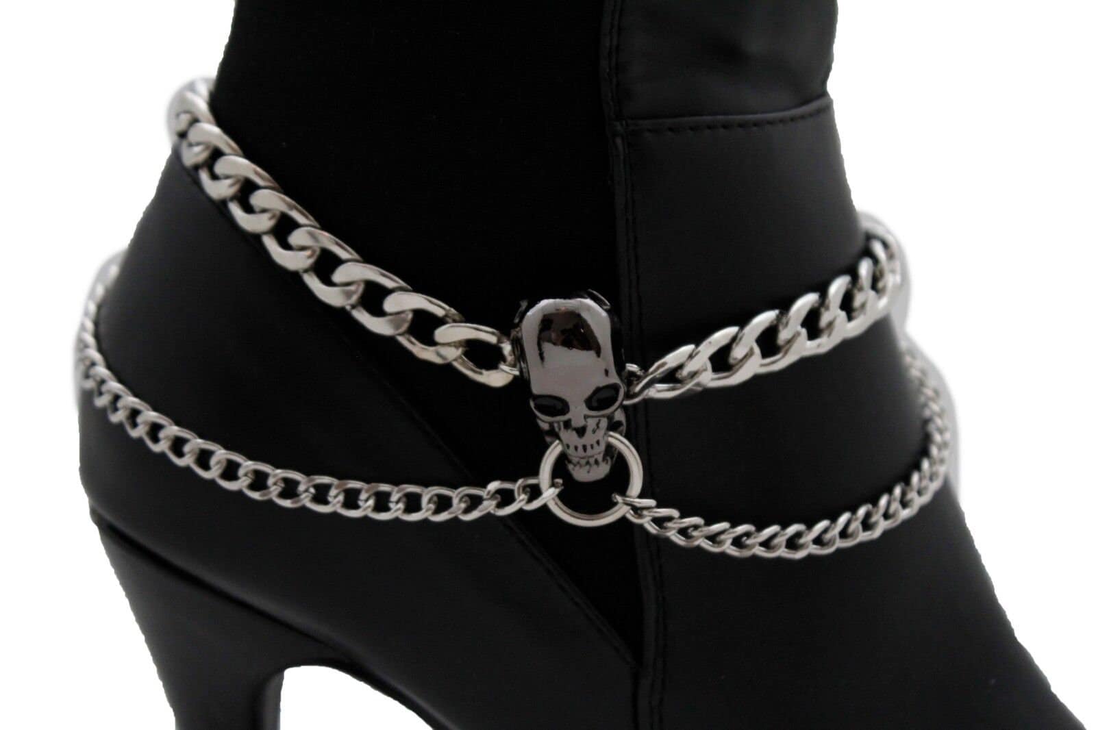 Give your boots the kind of accessory that gets noticed before you even say hello. This listing is for BC146, a handmade pair of boot chain bracelets featuring silver-tone layered chains and a bold pewter/gunmetal skull charm centerpiece. The design uses a thicker curb chain on top with a slimmer drape chain below, creating a stacked, styled look that works with ankle boots, booties, and taller boots.