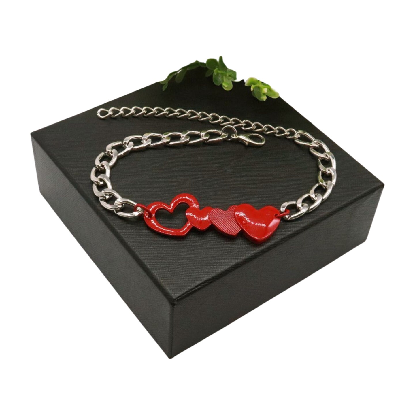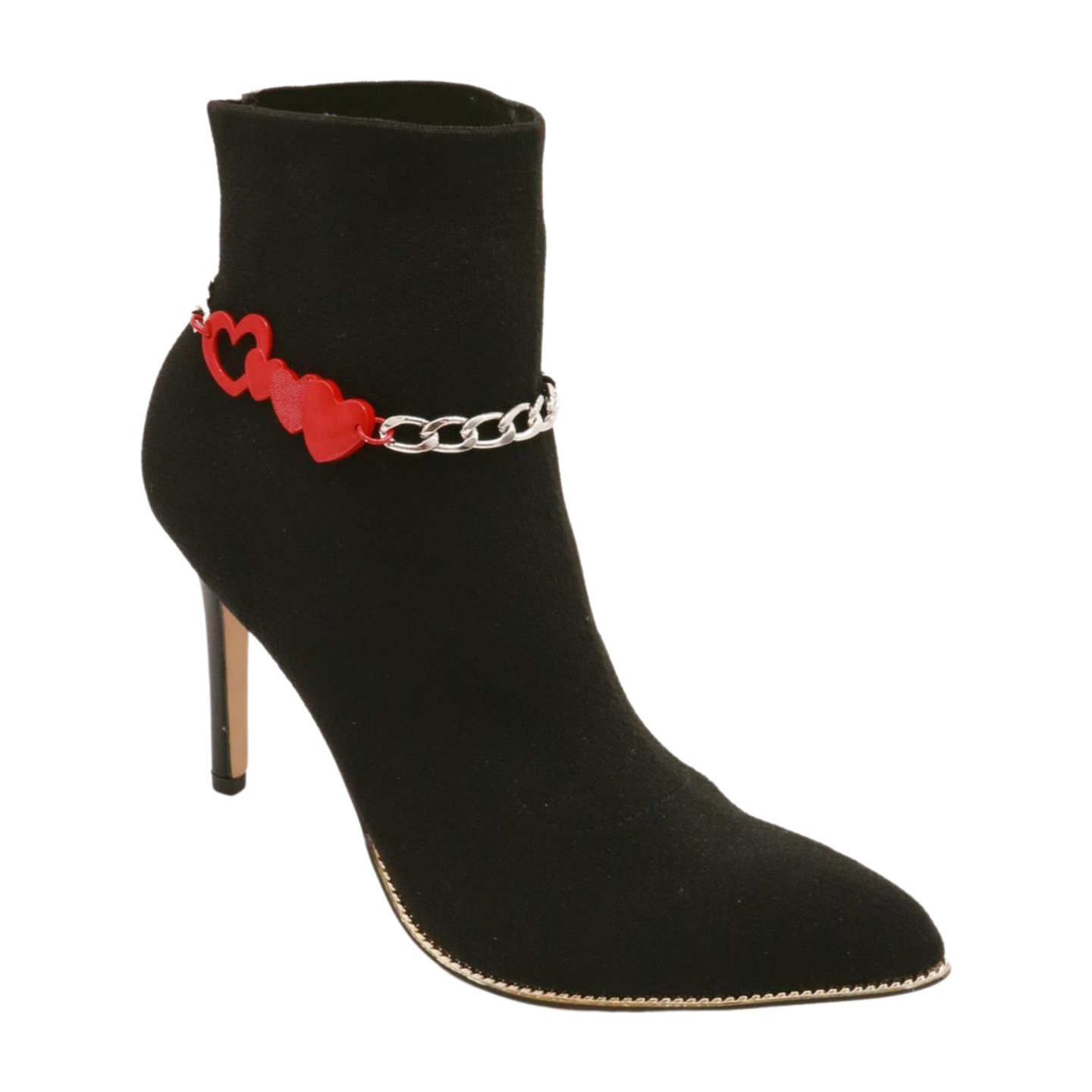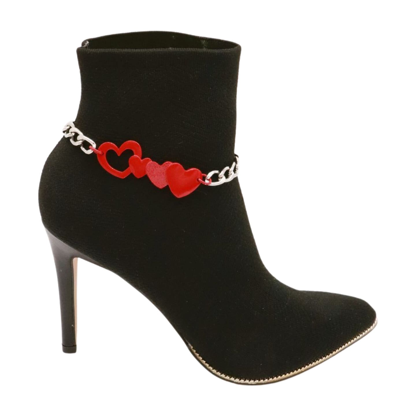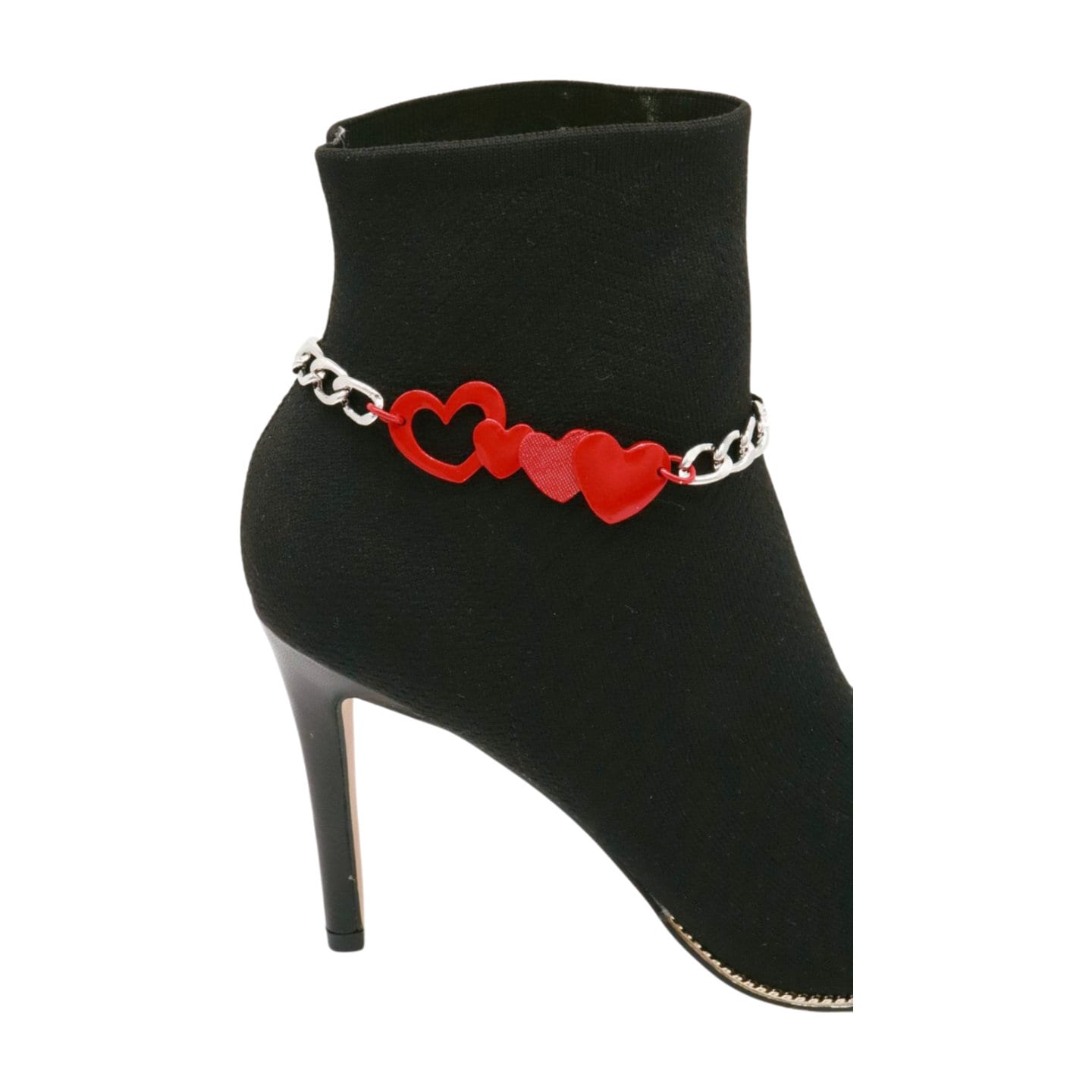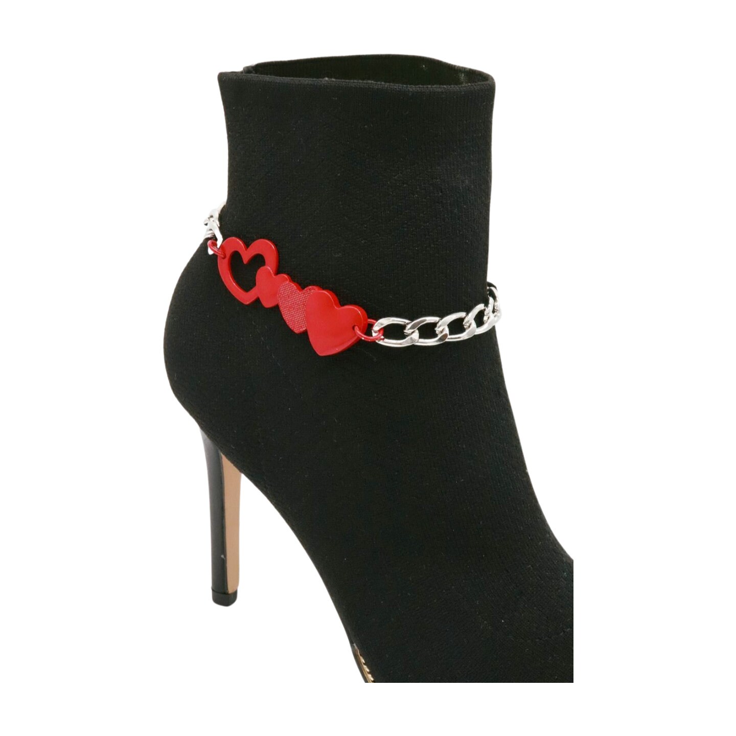Add a bold pop of red to your boots with this handmade silver-tone boot chain bracelet pair. Each set includes two adjustable boot chains (one for each side) featuring silver chain links and red heart charm accents. Designed for adult fashion styling, this piece is easy to dress up or down—western looks, night-out outfits, denim days, or romantic plans.