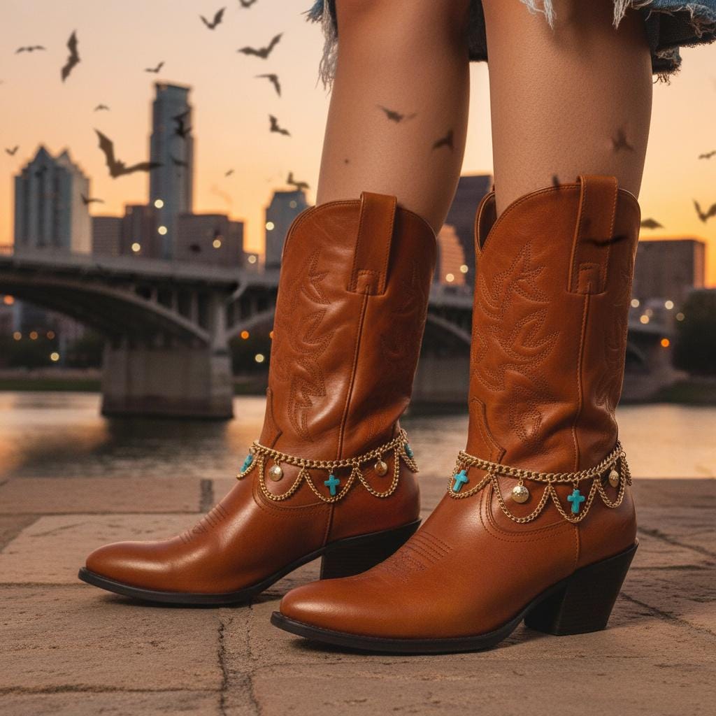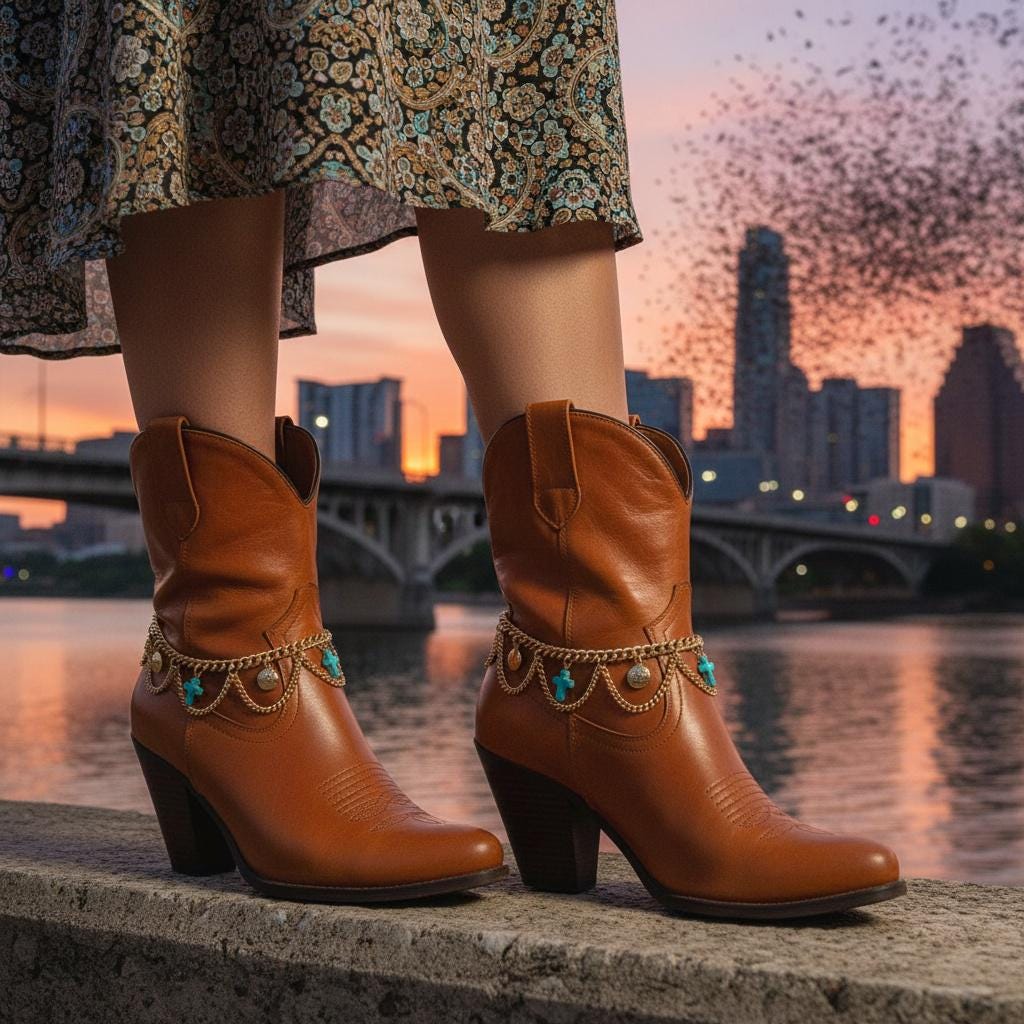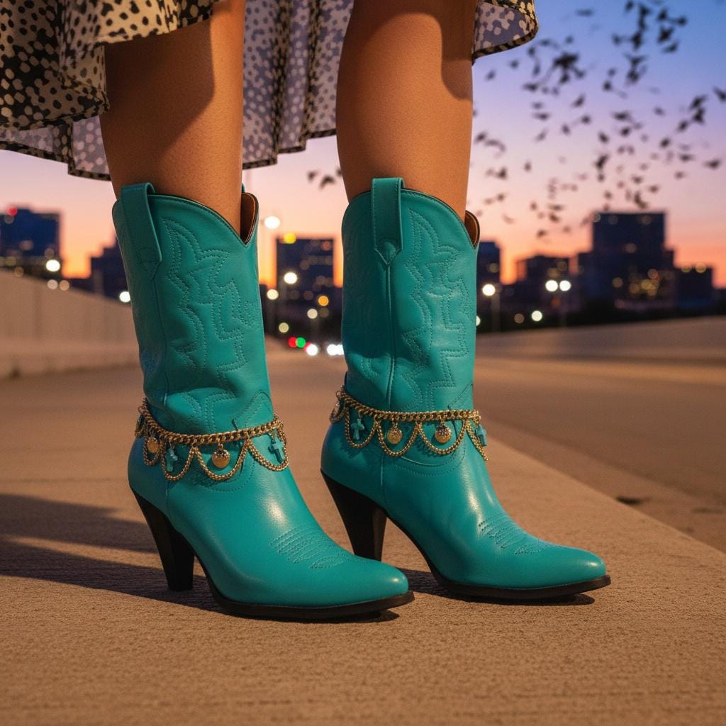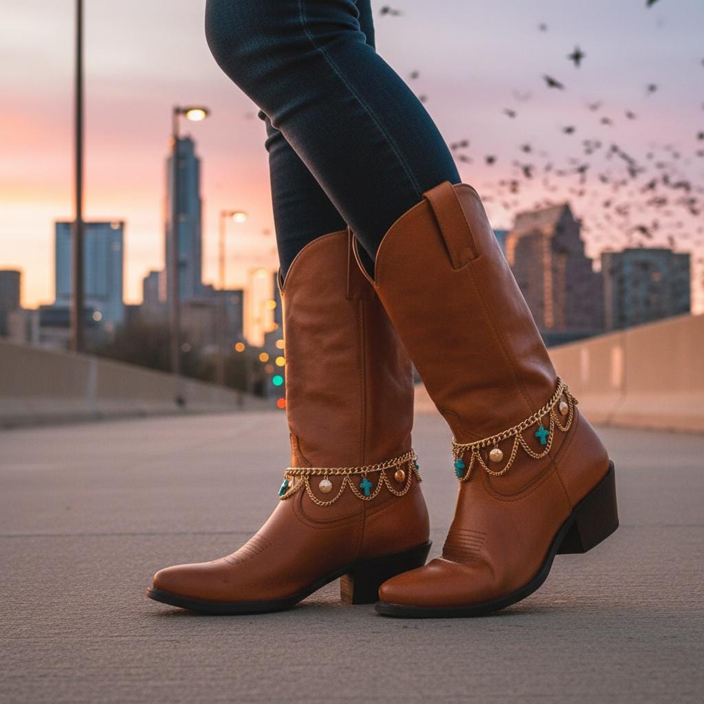 This set is made for the “I want a statement, but I still want to walk normally” crowd. The draped chain detail gives that western-boho vibe—perfect for rodeo nights, line dancing, Nashville trips, festivals, concerts, or just giving your everyday boots a little personality.