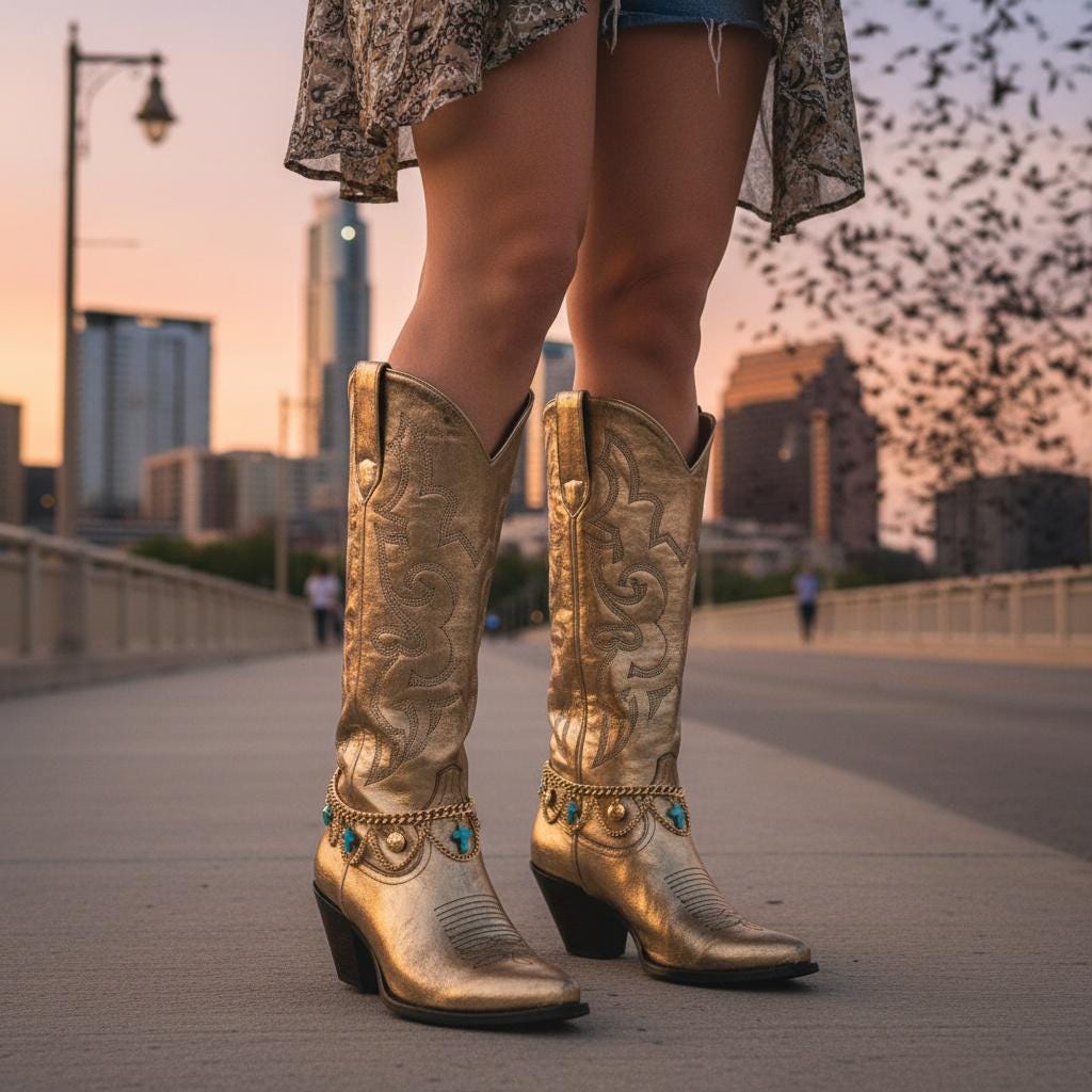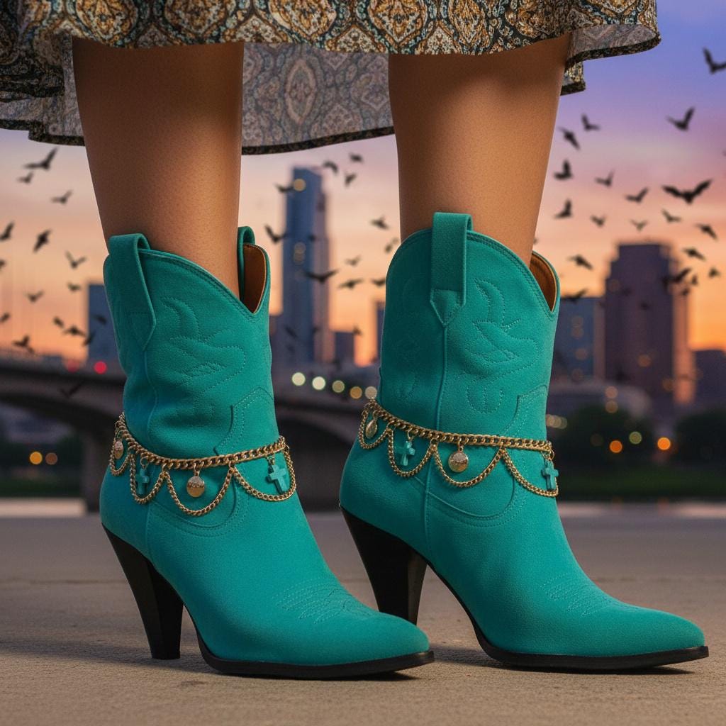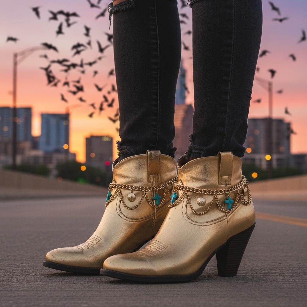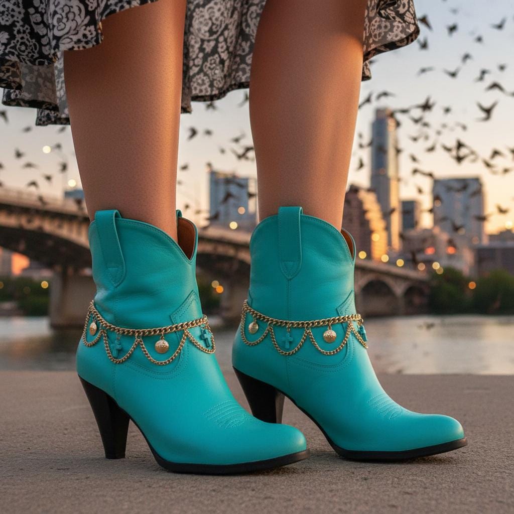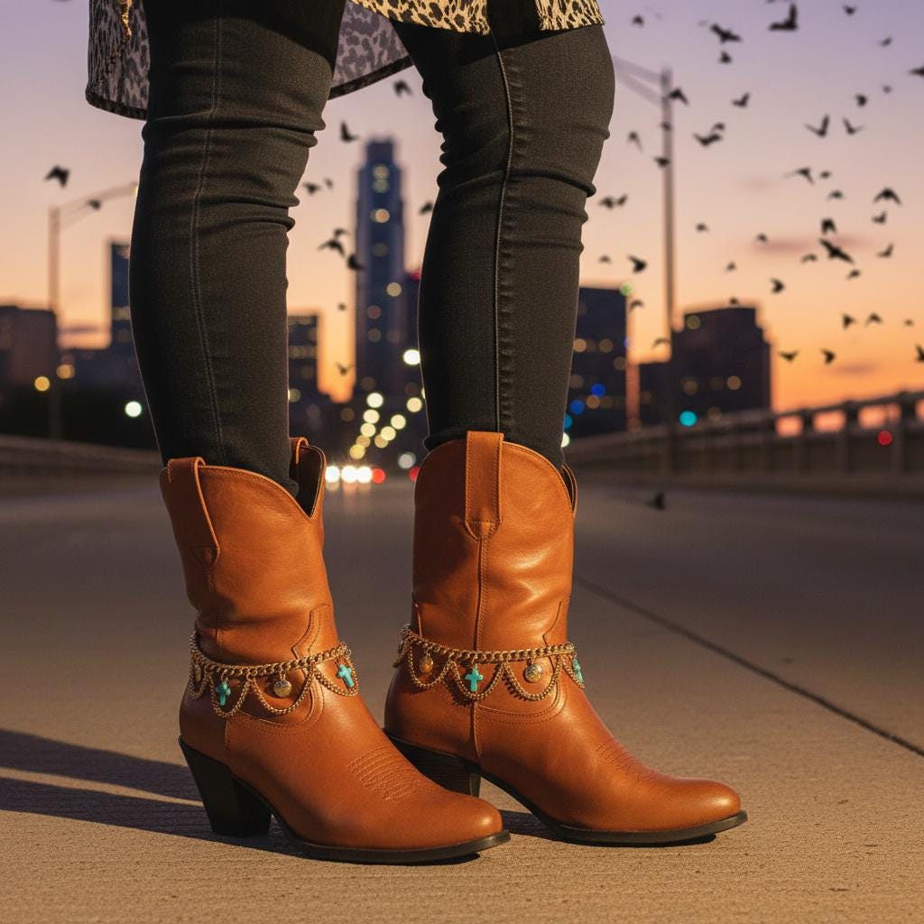 This set is made for the “I want a statement, but I still want to walk normally” crowd. The draped chain detail gives that western-boho vibe—perfect for rodeo nights, line dancing, Nashville trips, festivals, concerts, or just giving your everyday boots a little personality.