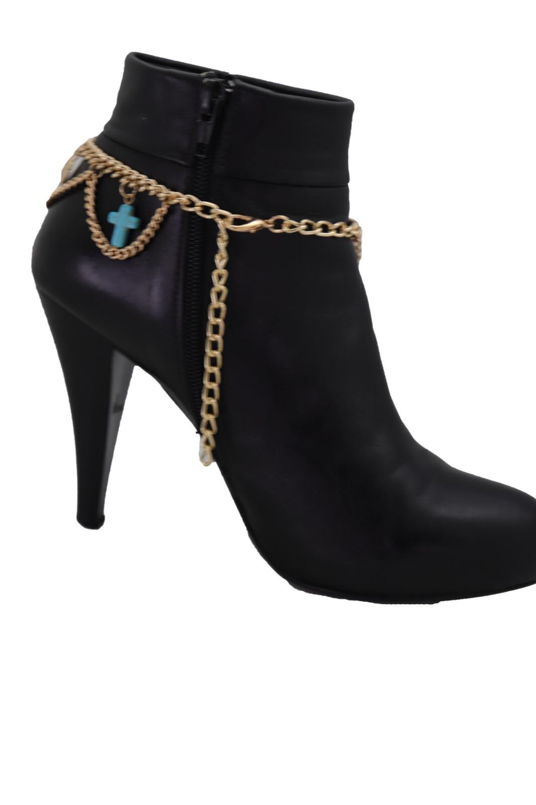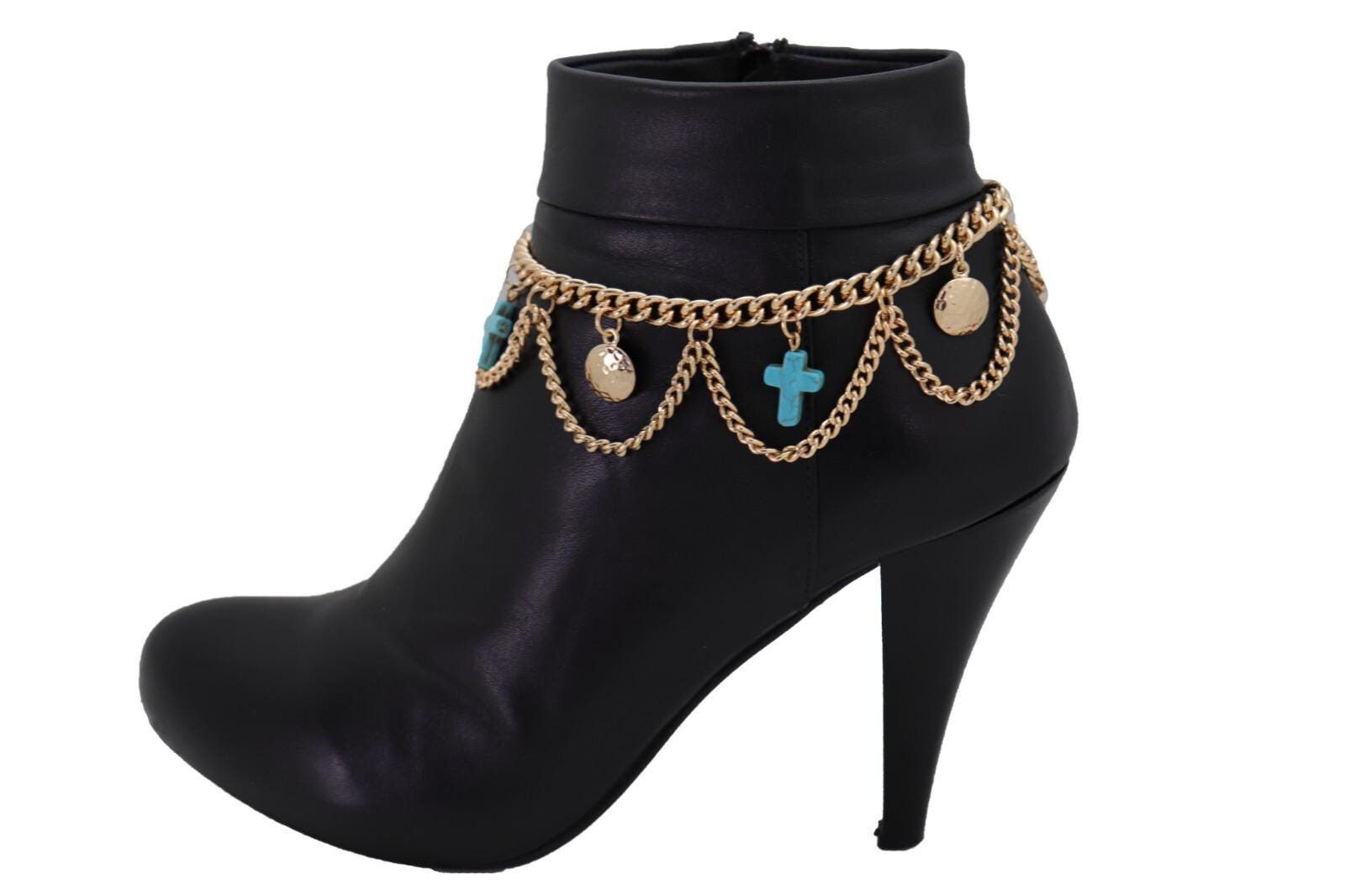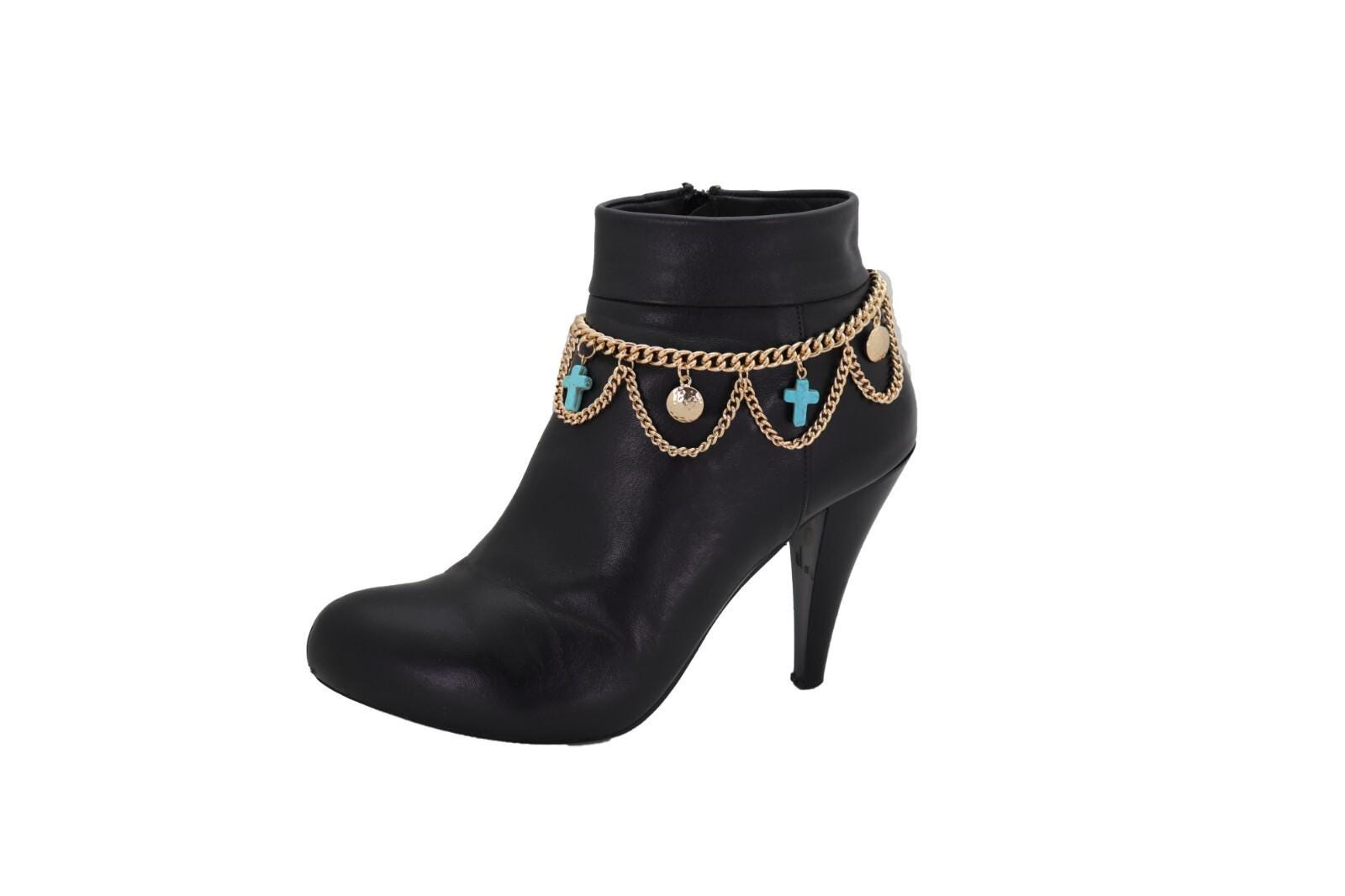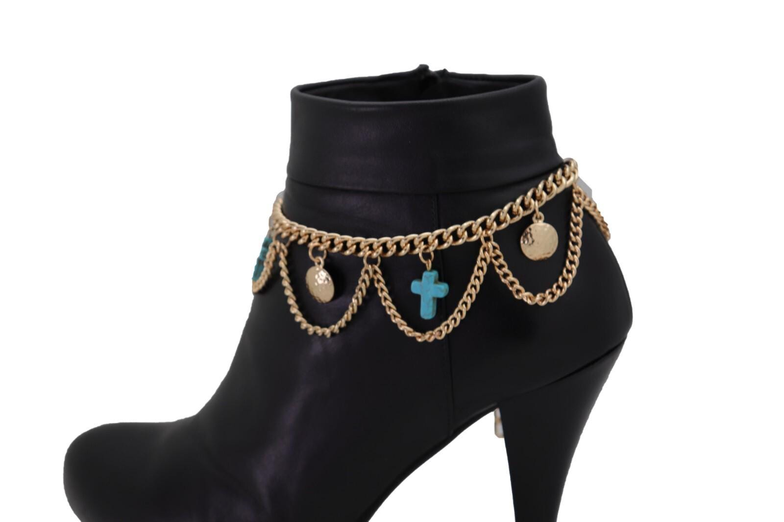 Meet BC213: a bold, wearable boot jewelry set that makes your boots look styled in seconds. This listing is for a pair (2PCS) of gold-tone boot chain bracelets featuring a layered multi-wave swag design, accented with turquoise-color cross charms and coin dangles for shine and movement.