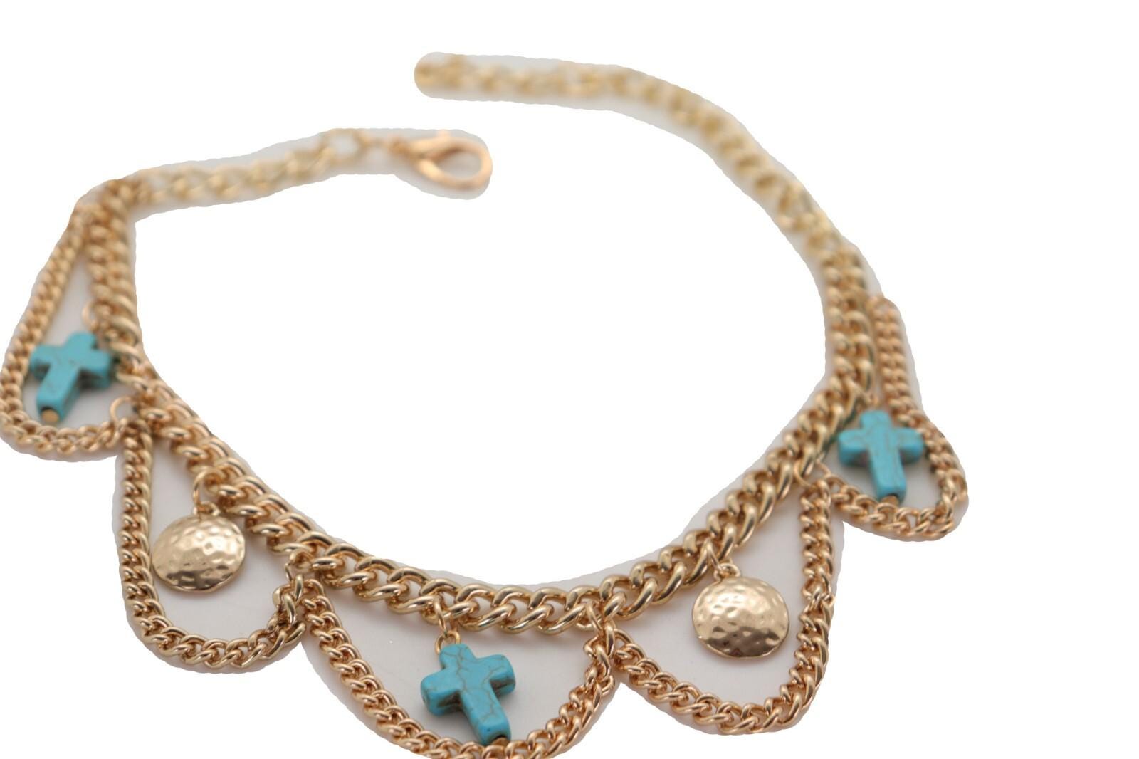 Color: Gold-tone chain; turquoise-color cross charms; coin dangles