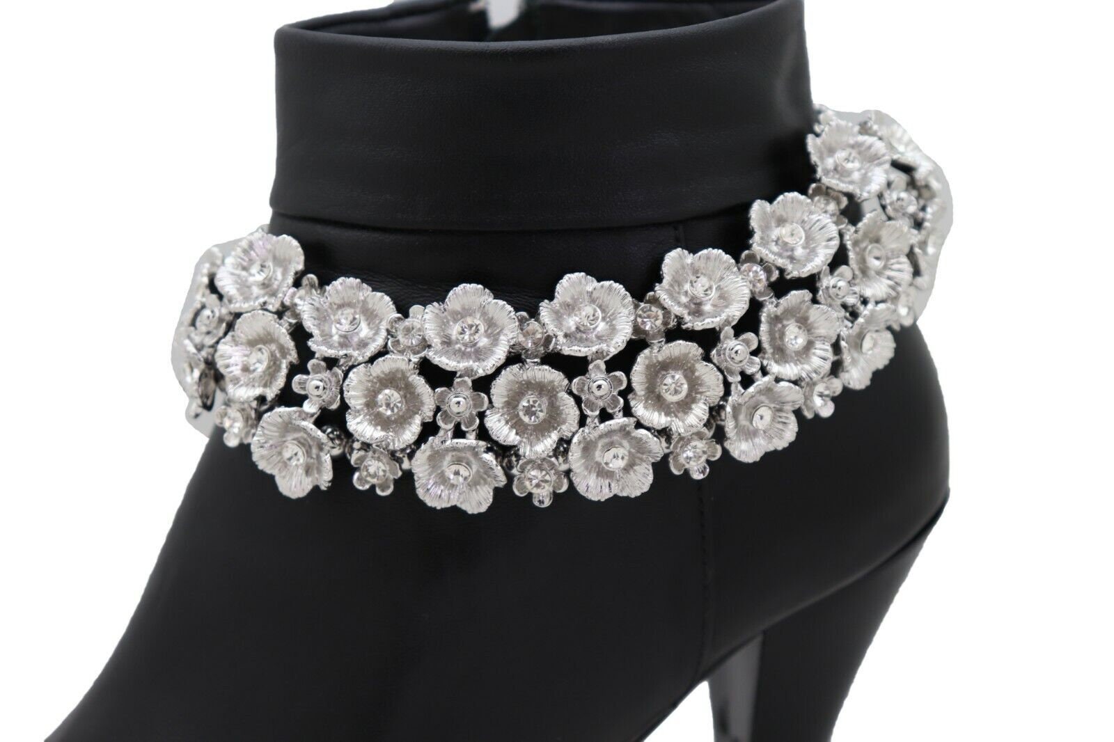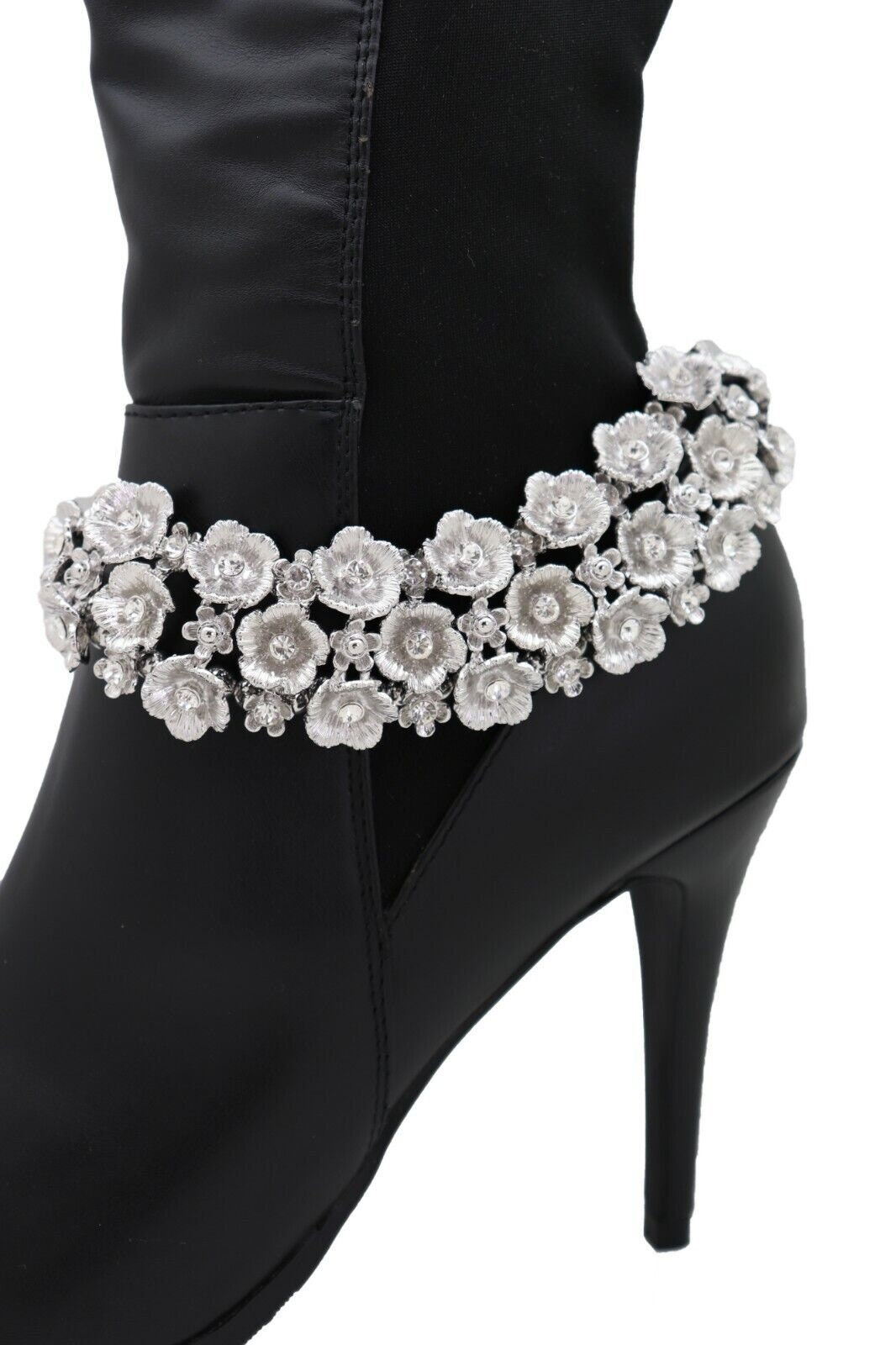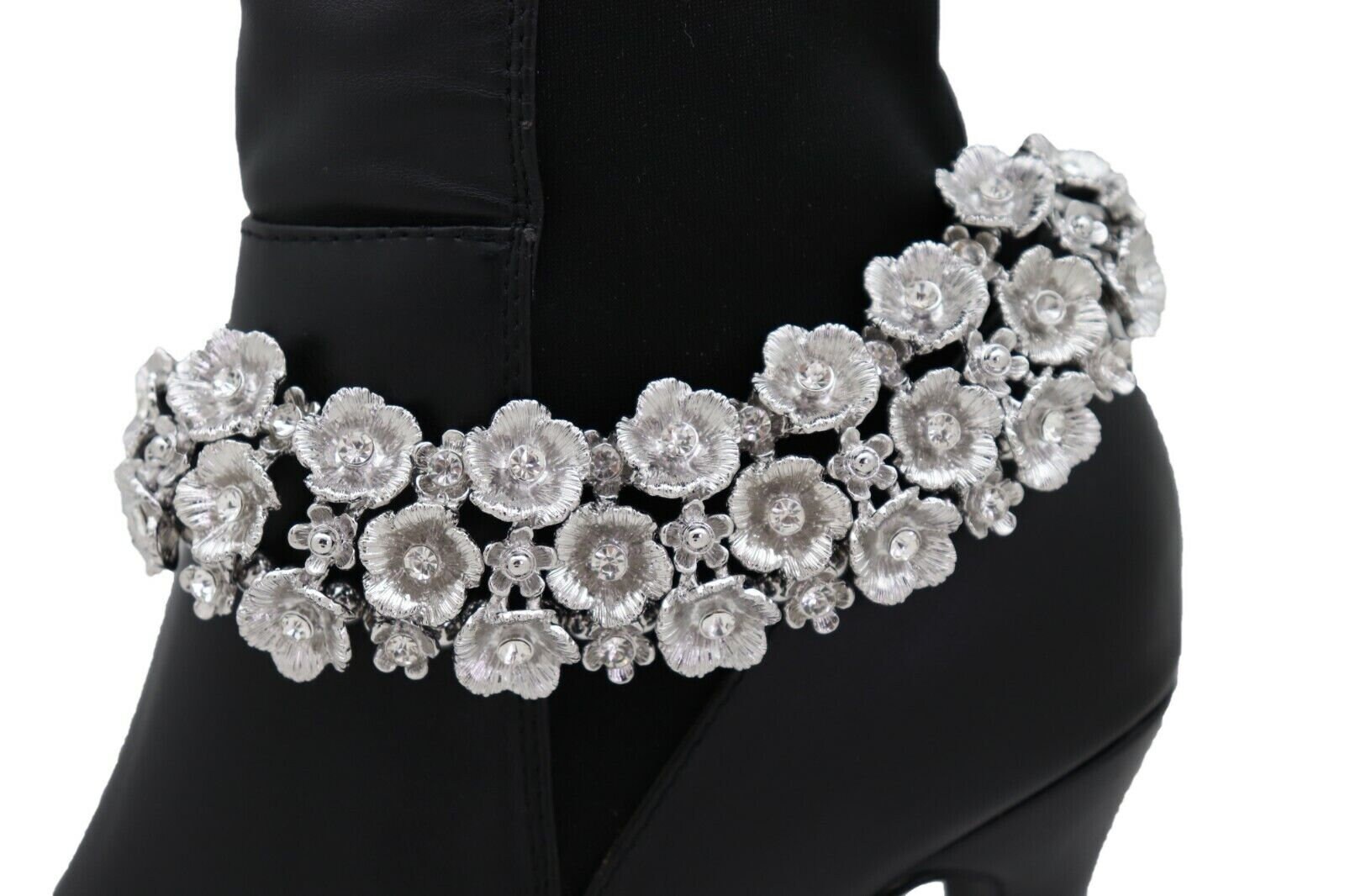 Give your boots a jewelry moment. This listing is for a matching pair (2 pieces) of silver-tone boot chain bracelets featuring a rhinestone flower wrap design. They clip on easily, adjust for fit, and instantly upgrade boots for everyday outfits, concerts, parties, or photo days.