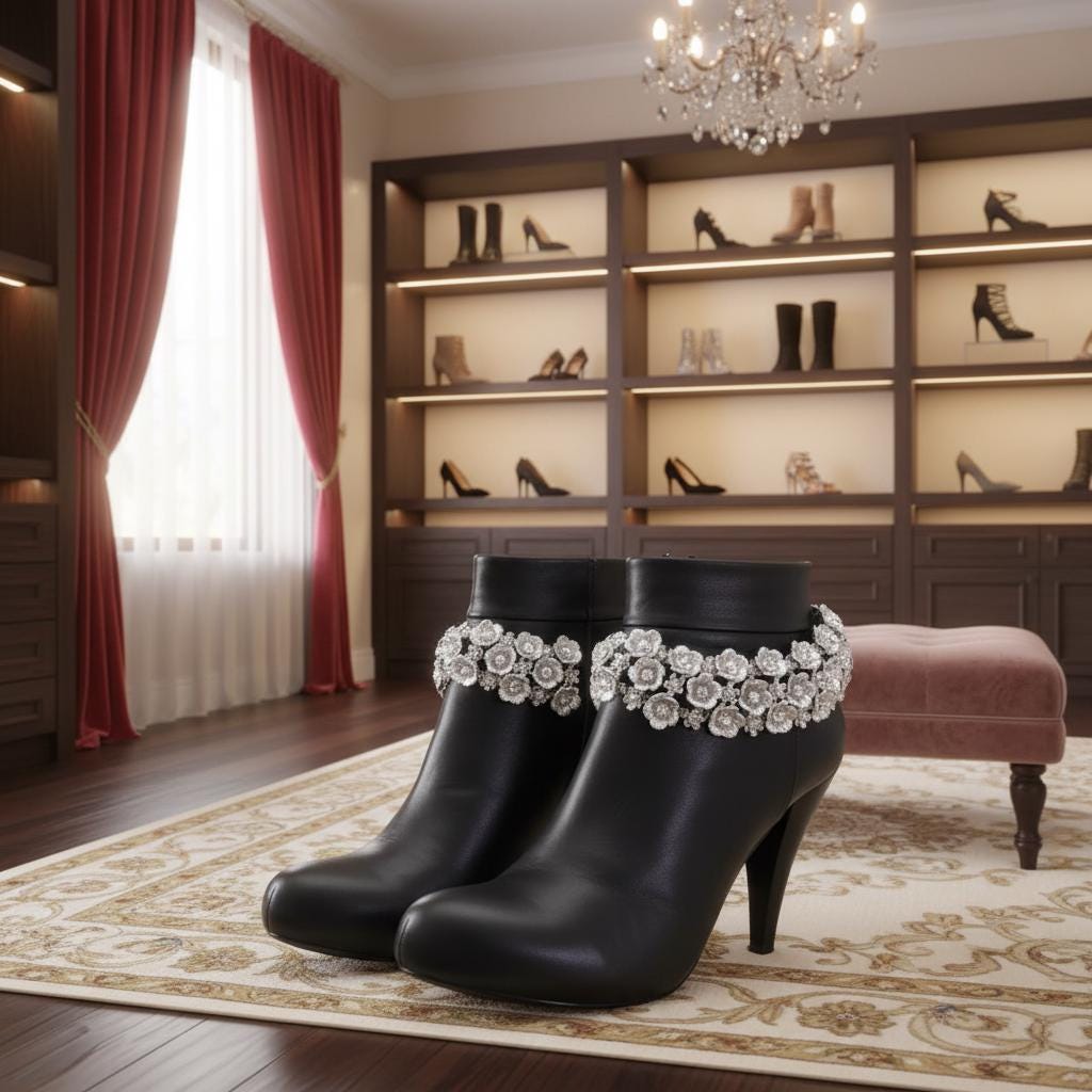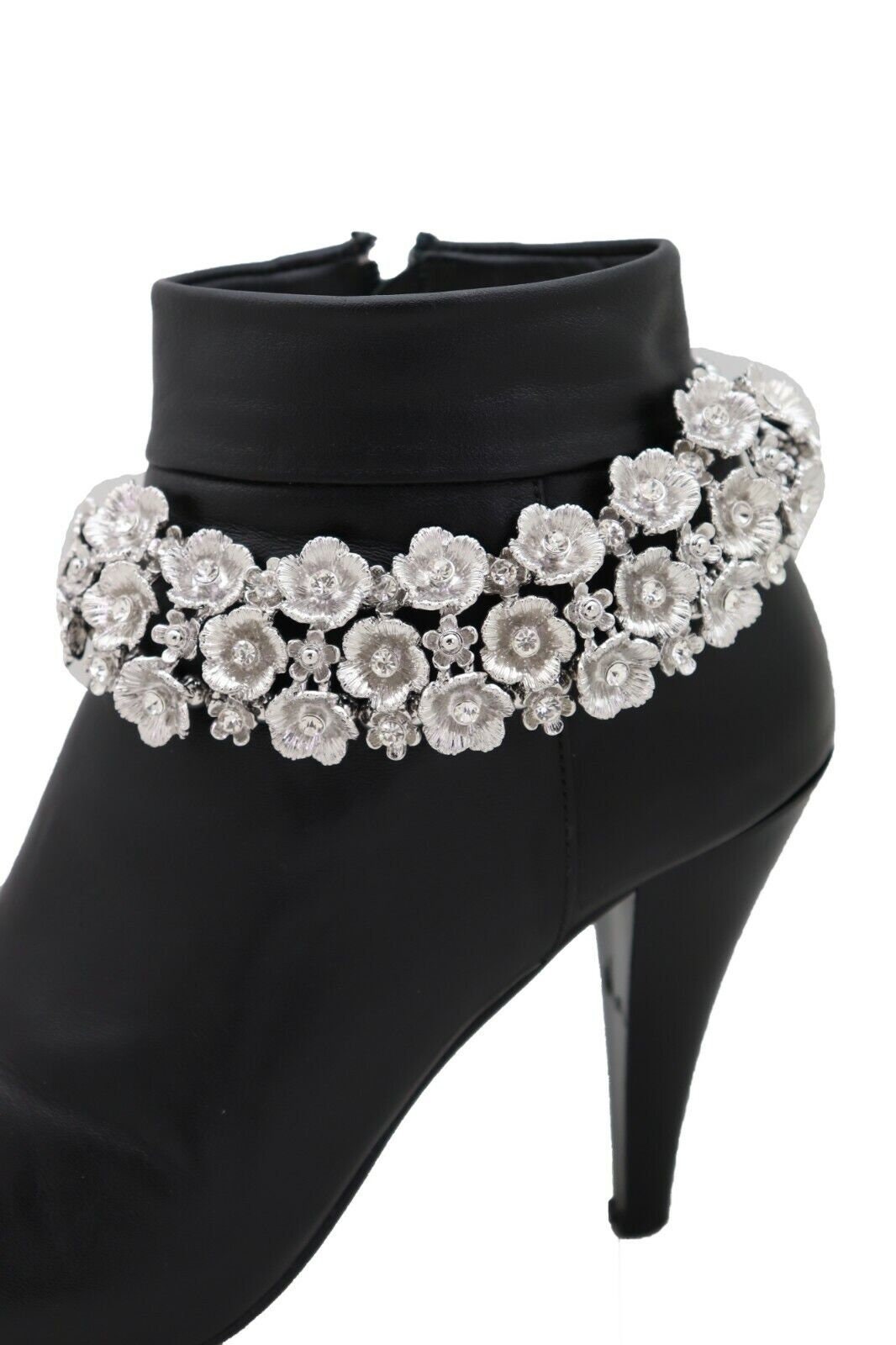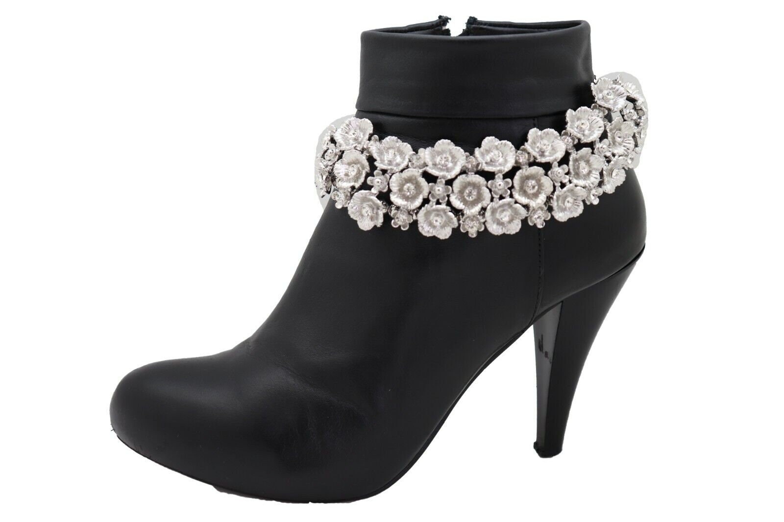 Give your boots a jewelry moment. This listing is for a matching pair (2 pieces) of silver-tone boot chain bracelets featuring a rhinestone flower wrap design. They clip on easily, adjust for fit, and instantly upgrade boots for everyday outfits, concerts, parties, or photo days.