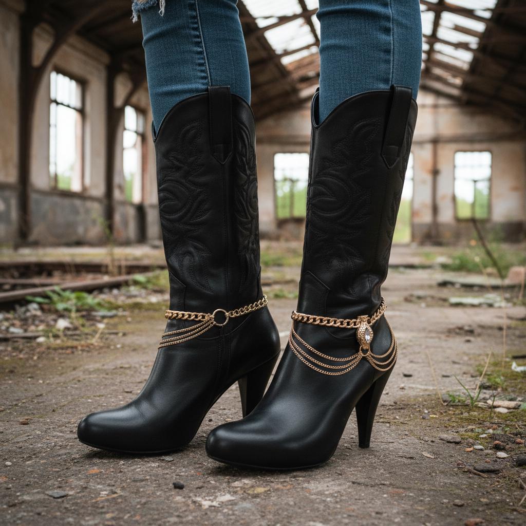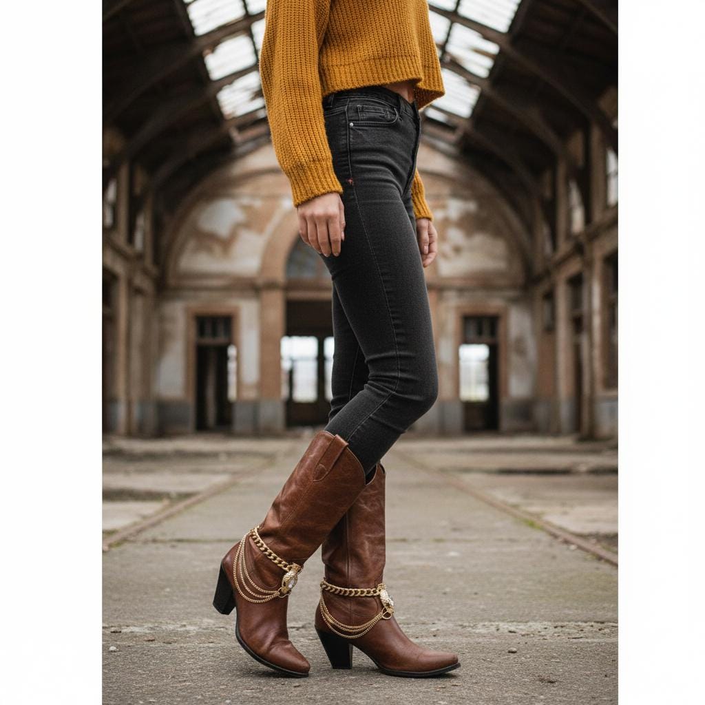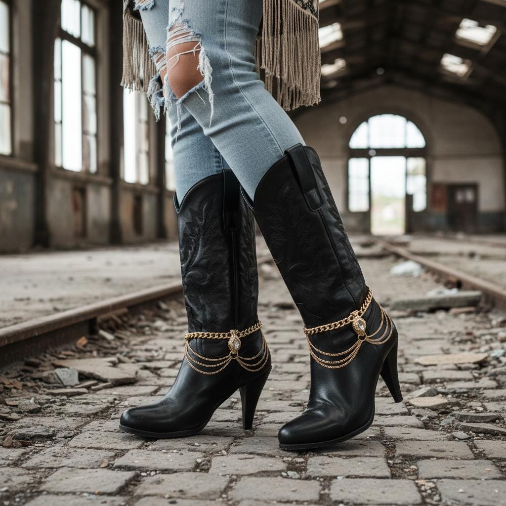 The design is built with a structured curb chain along the top and multiple drape strands below, creating that “styled, layered, boutique” look without needing extra accessories. Wear them on ankle boots, cowgirl boots, or tall boots. Adjust the length from 11–15 inches using the lobster clasp and extension chain so you can choose your preferred drape.