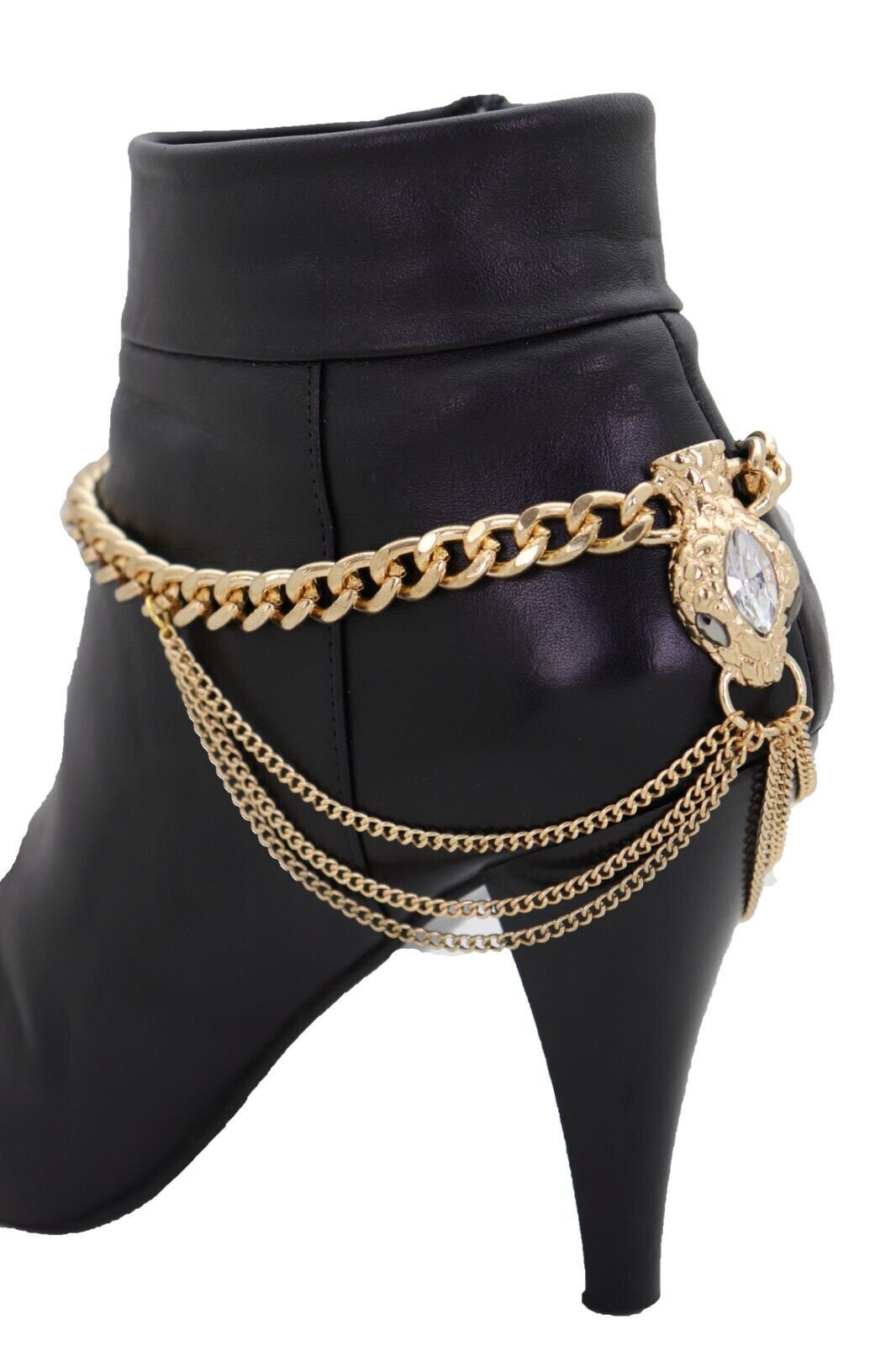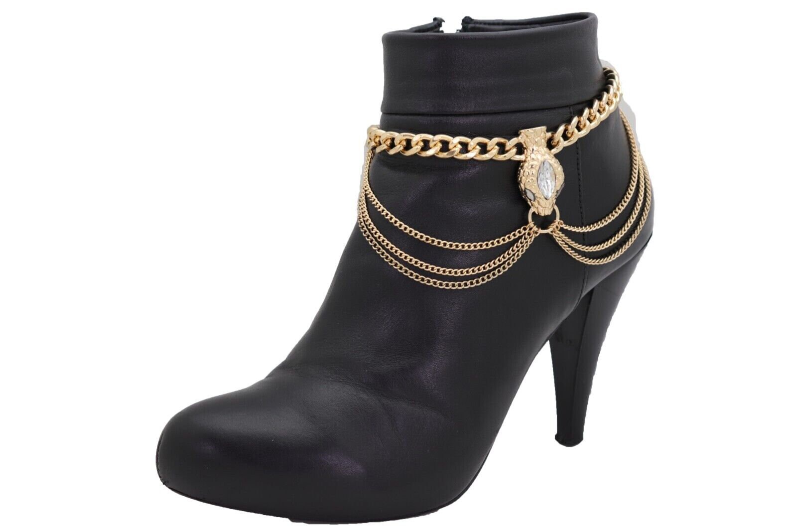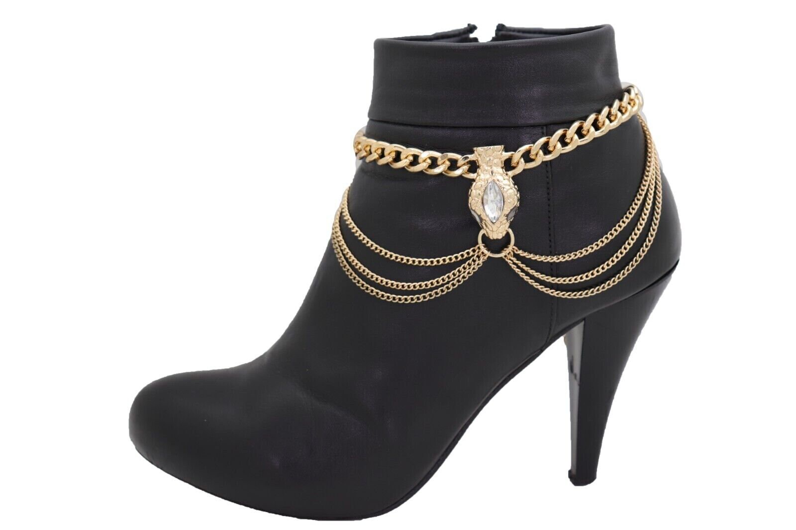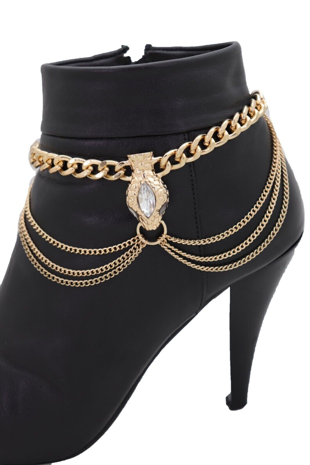 Meet BC150: boot jewelry that turns your favorite boots into a full outfit. This listing is for a pair (2PCS) of gold-tone boot chain bracelets—one for each boot—featuring a bold snake head centerpiece with rhinestone/stone-look sparkle and layered wave drape chains that move beautifully when you walk.