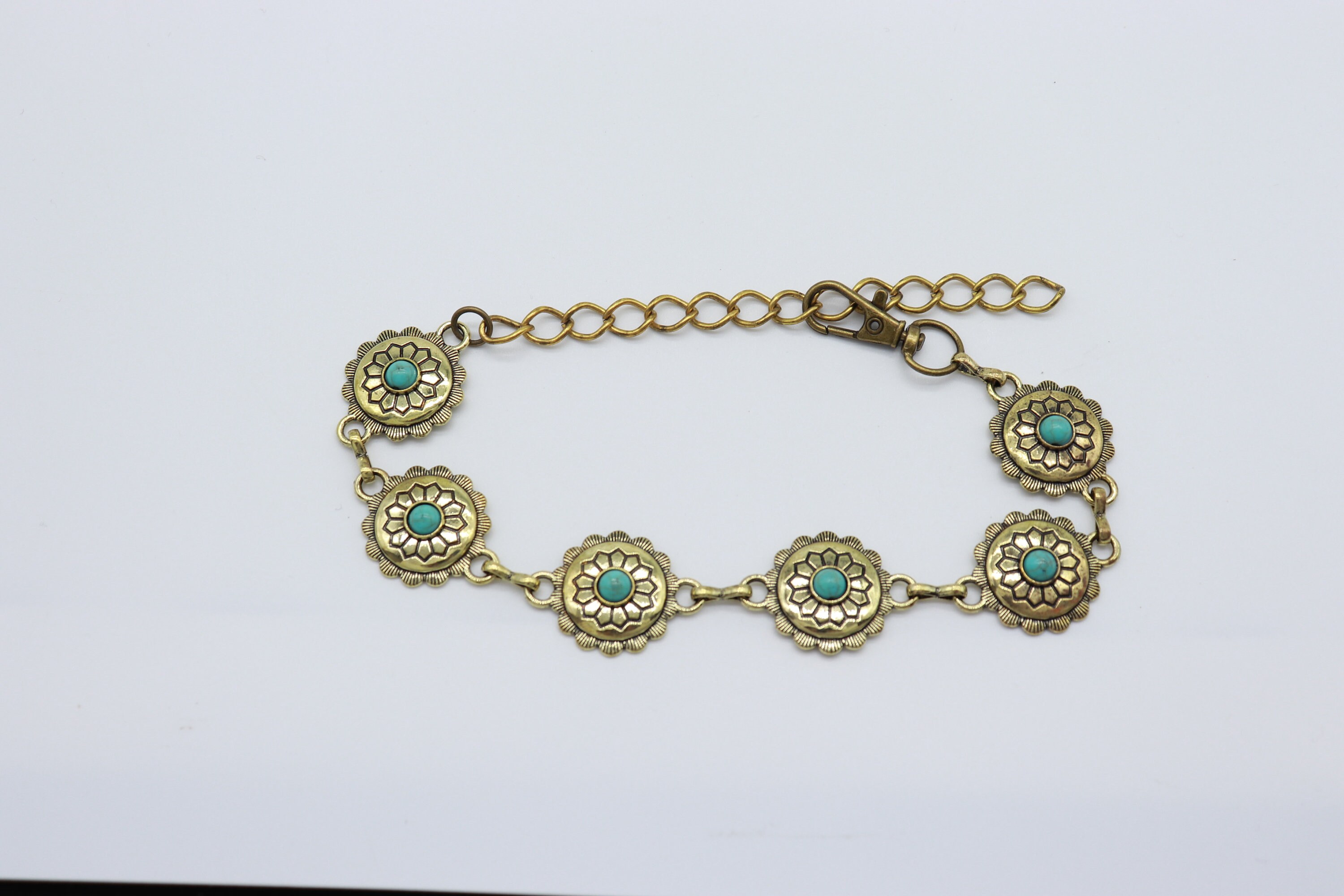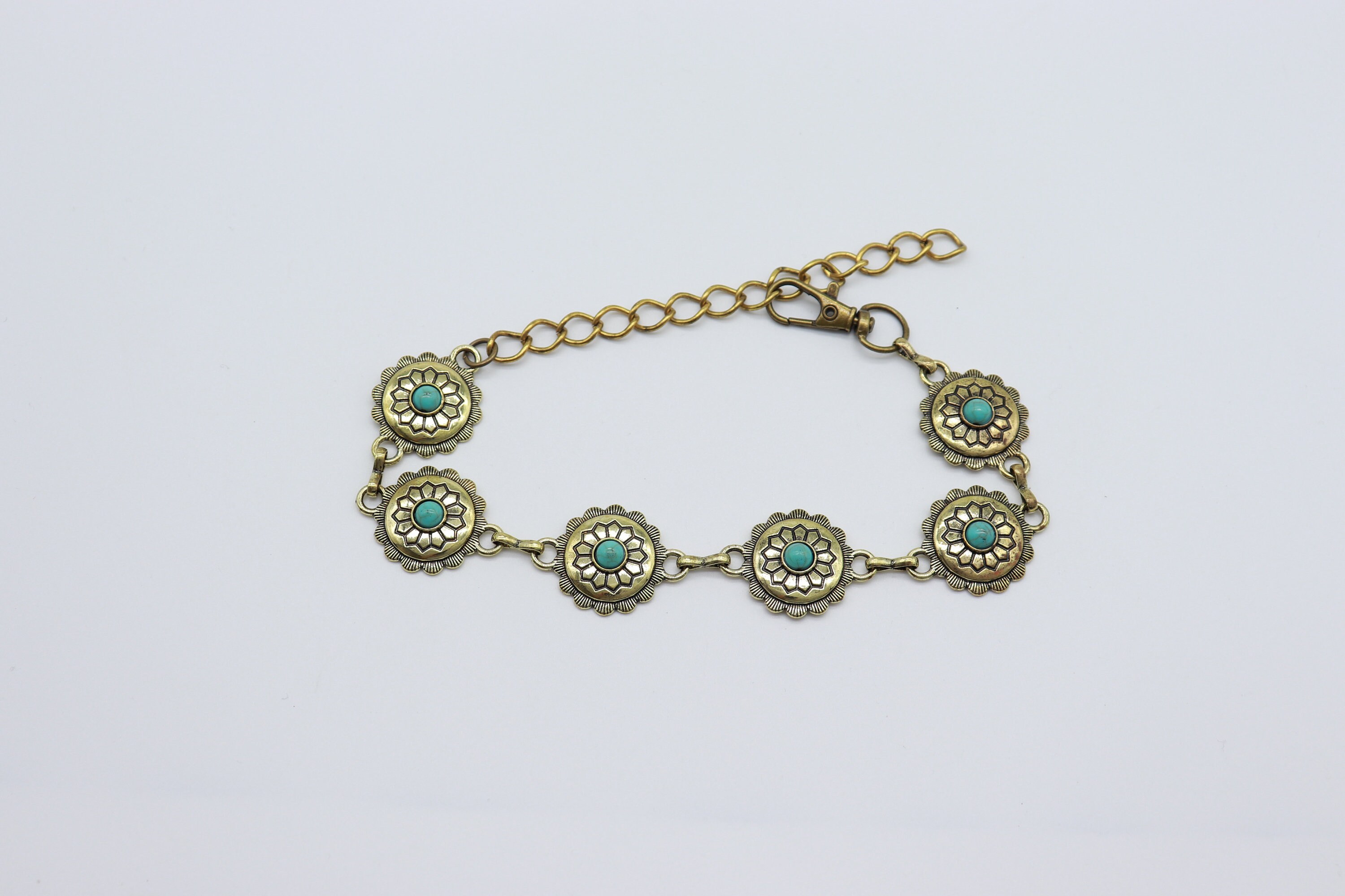 Meet BC177: a handmade-in-the-usa pair of boot chain bracelets designed to add a western-boho finish to your favorite boots. The antique gold-tone chain links and flower concho-style stations are accented with turquoise blue details that stand out beautifully against black boots, tan boots, suede textures, and classic leather.
