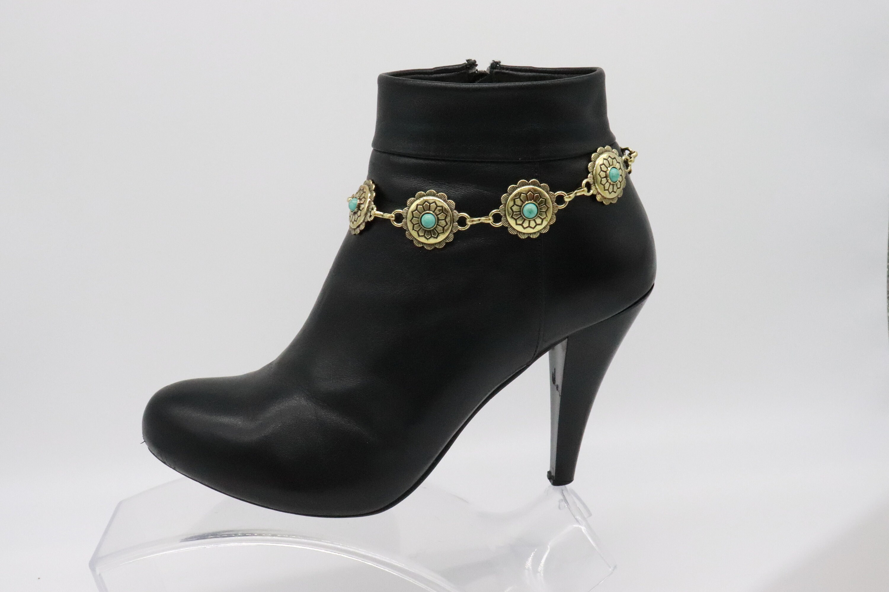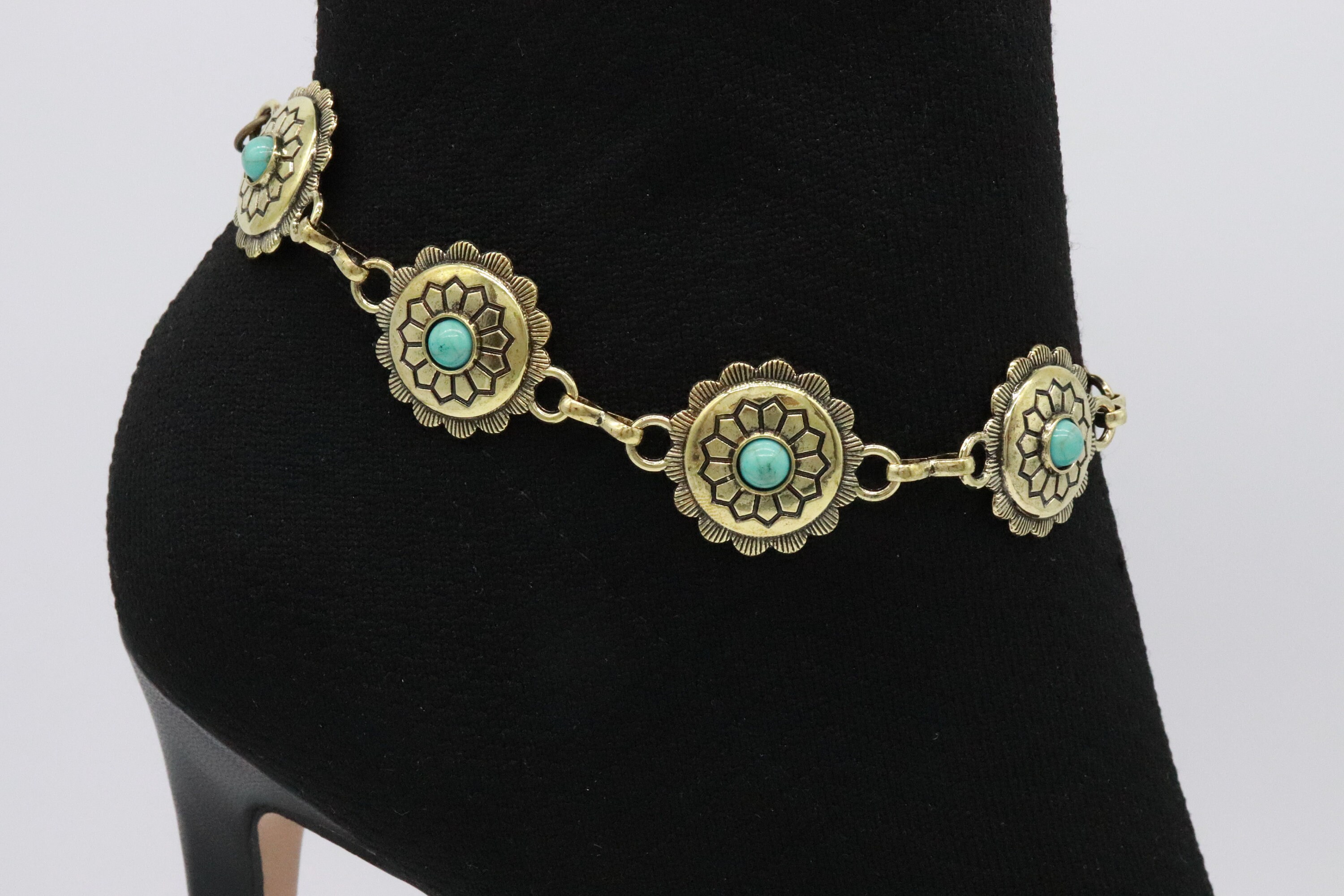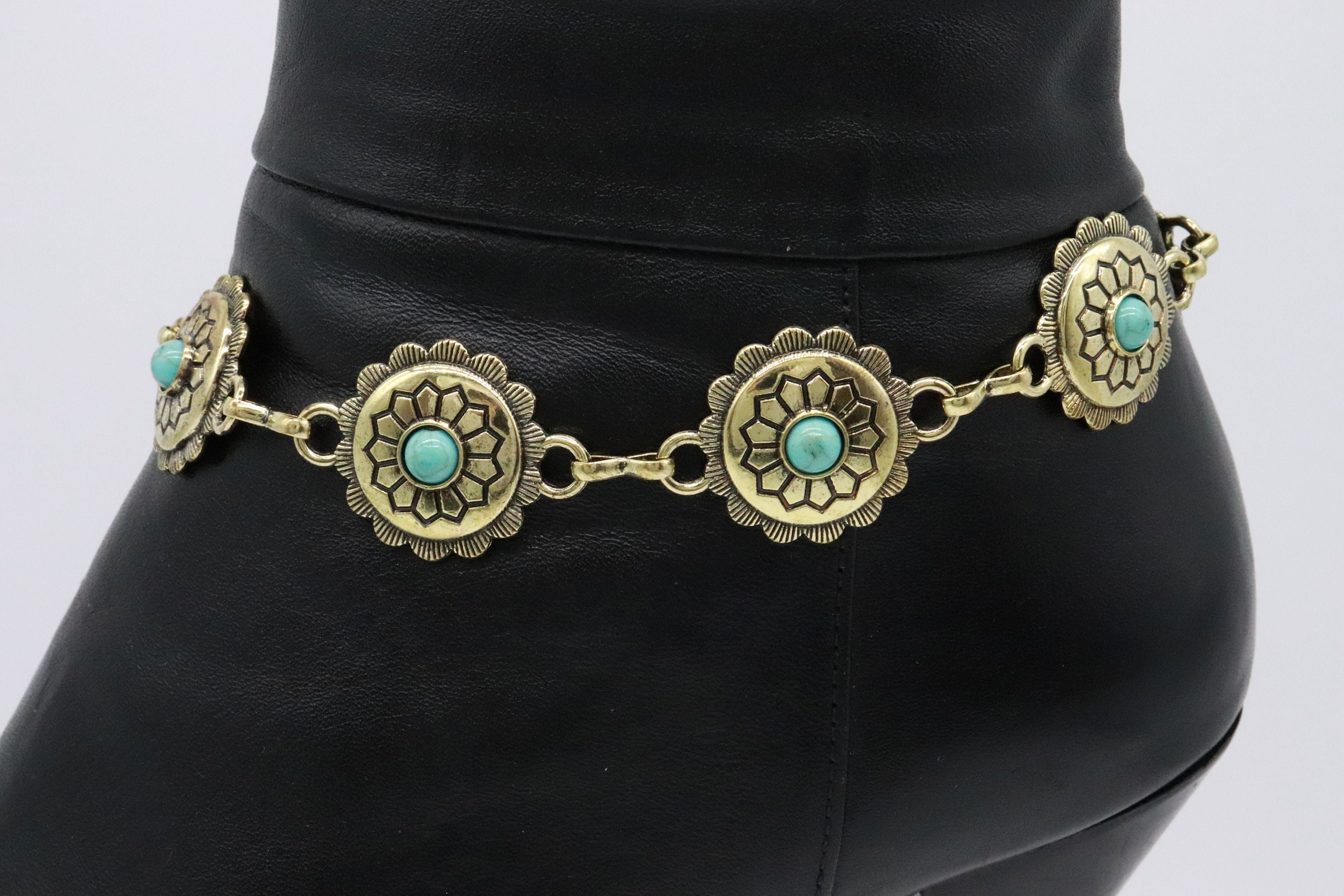 antique gold boot chain bracelets pair, turquoise blue flower concho boot jewelry, western shoe anklet straps, adjustable 11-15 inches, handmade in usa, bc177