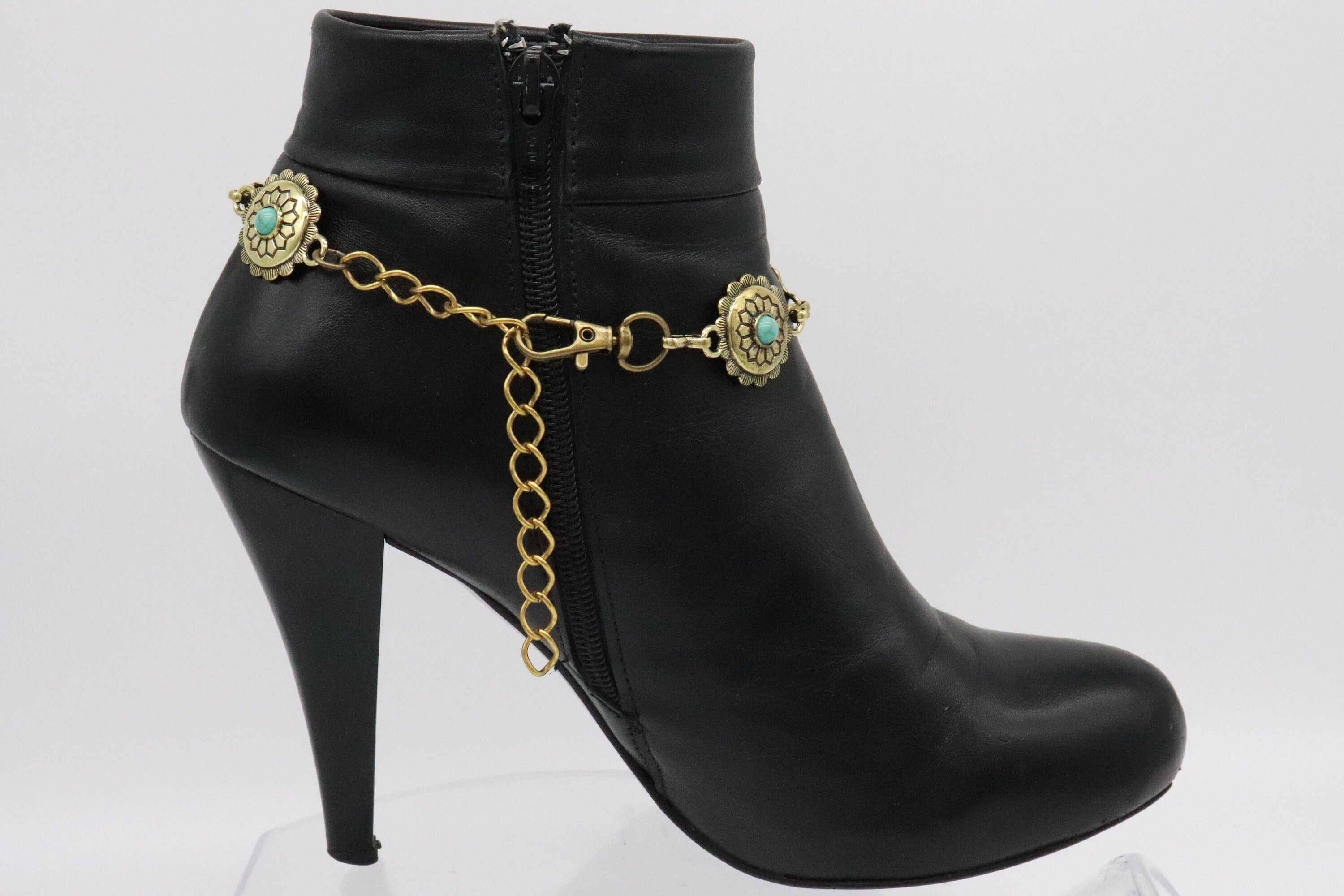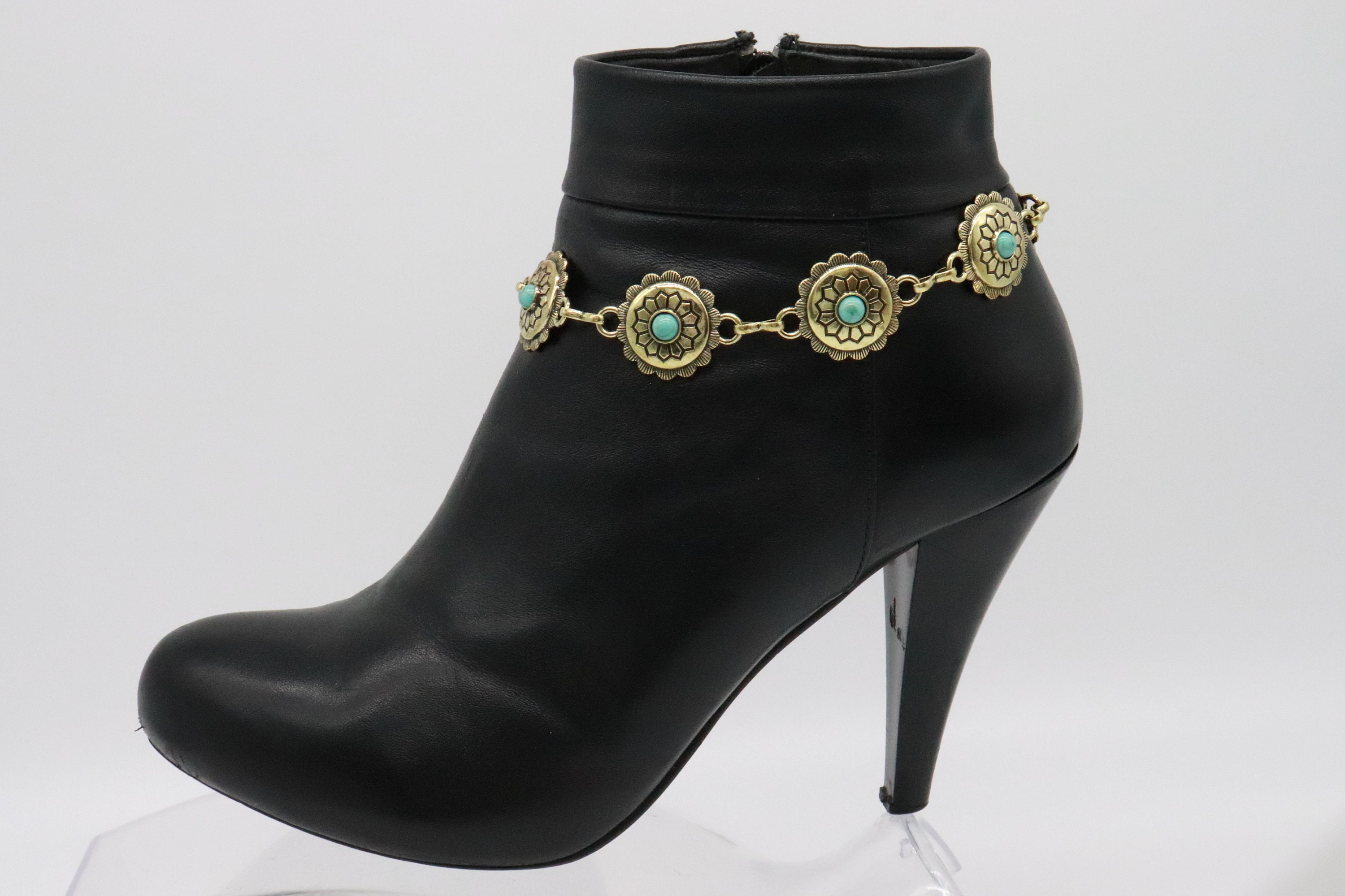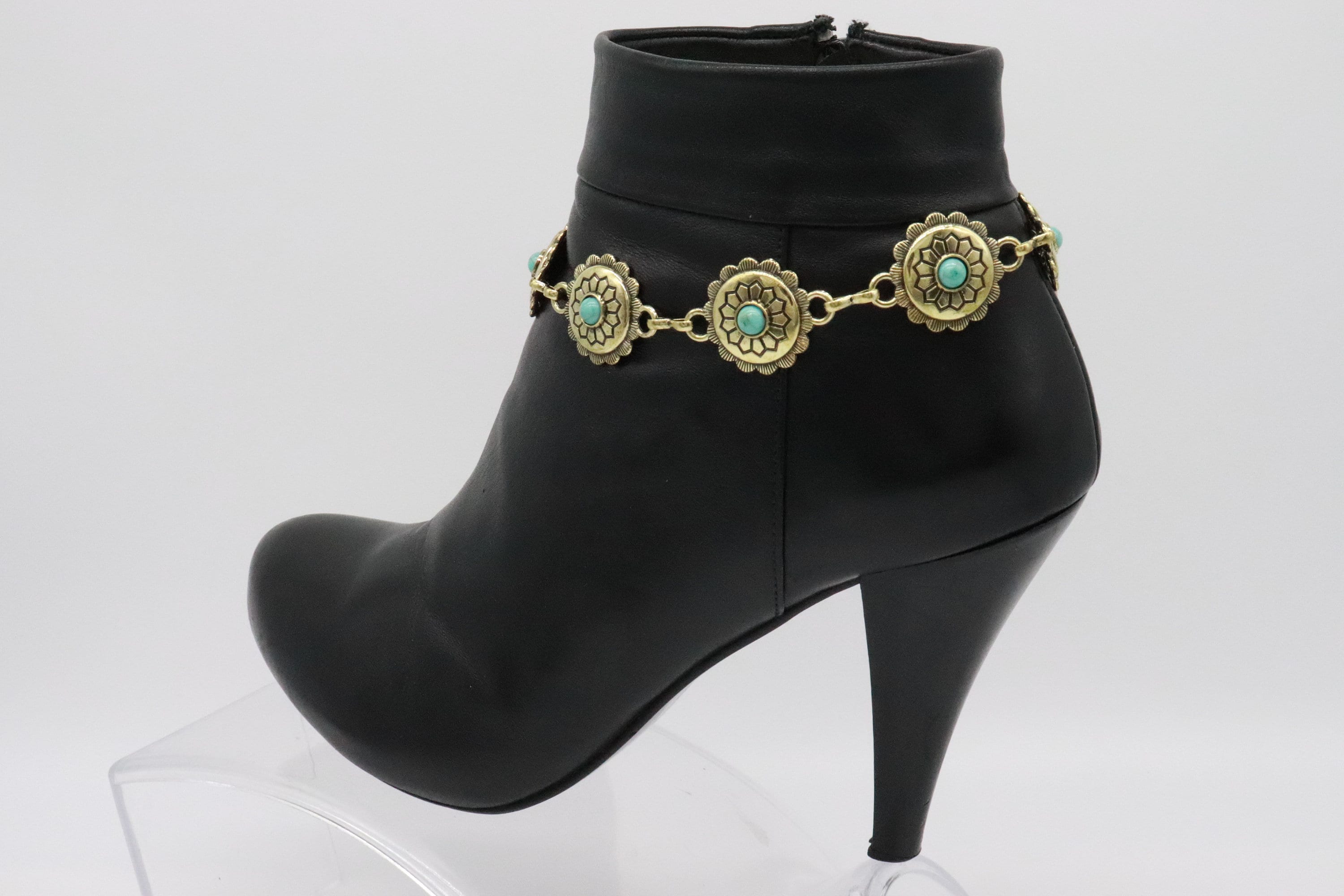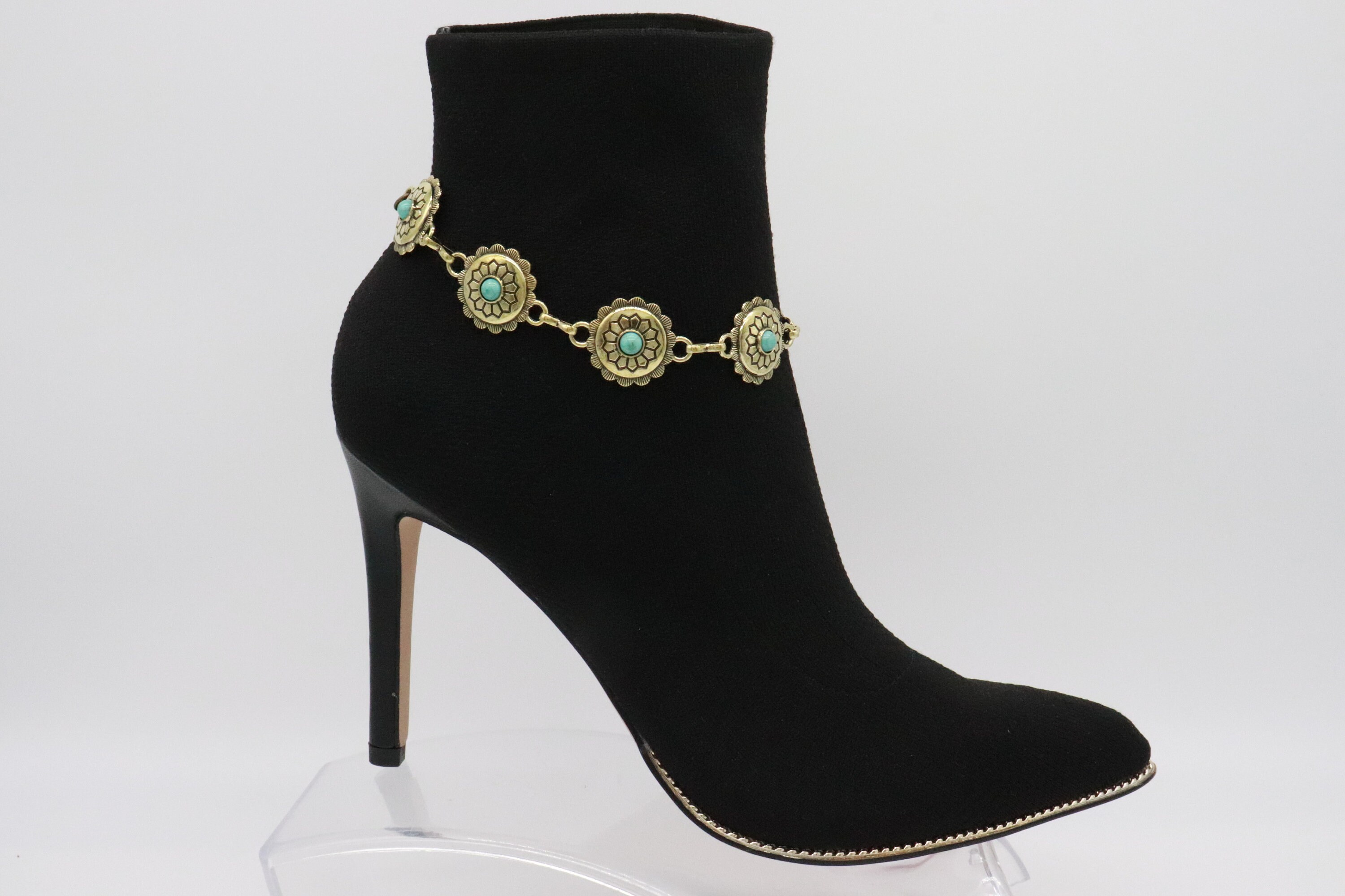 antique gold boot chain bracelets pair, turquoise blue flower concho boot jewelry, western shoe anklet straps, adjustable 11-15 inches, handmade in usa, bc177