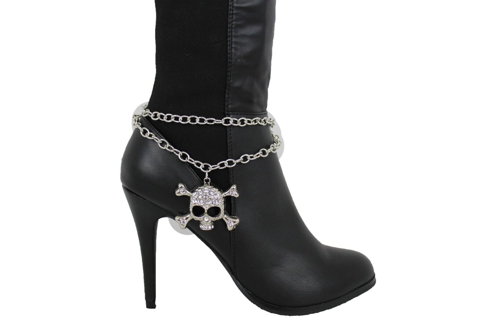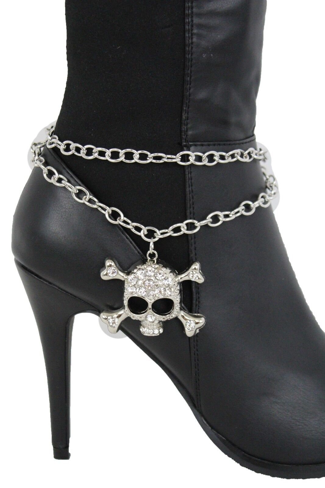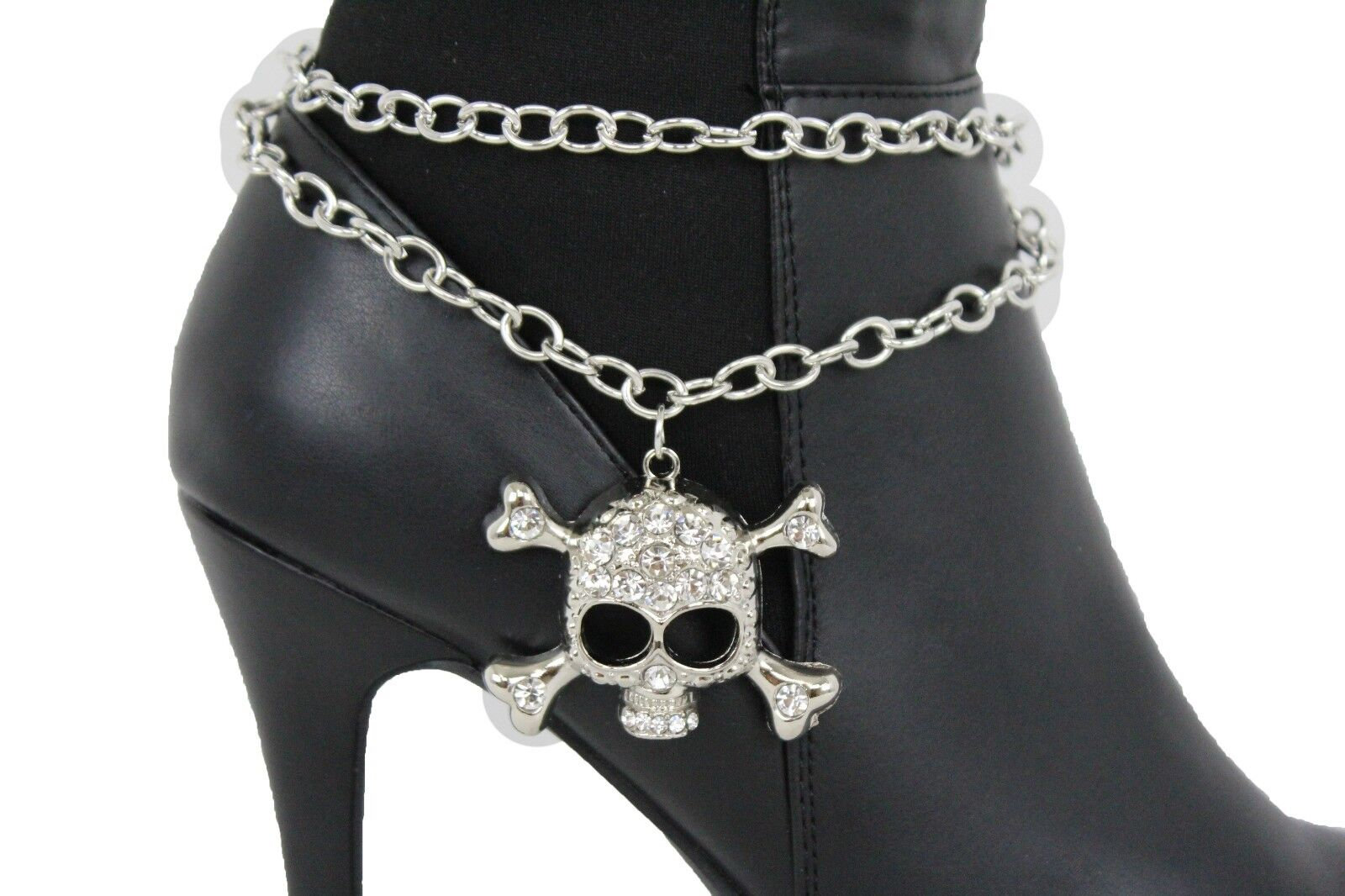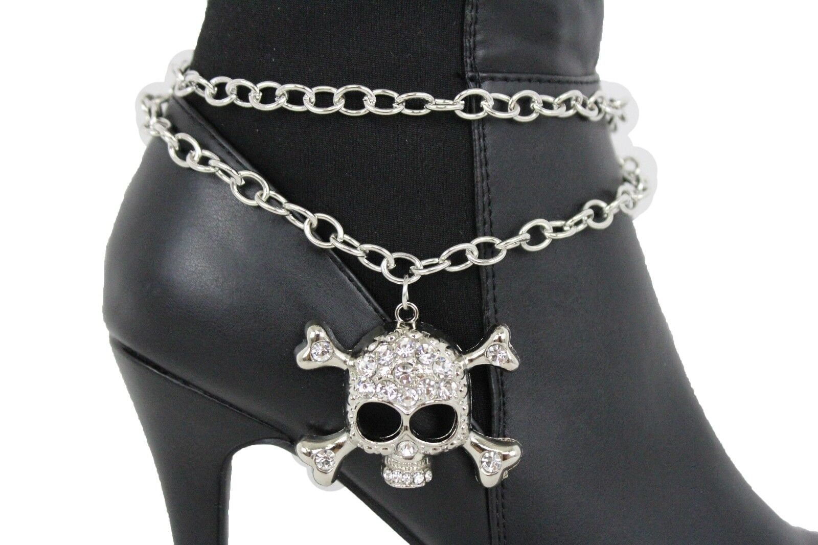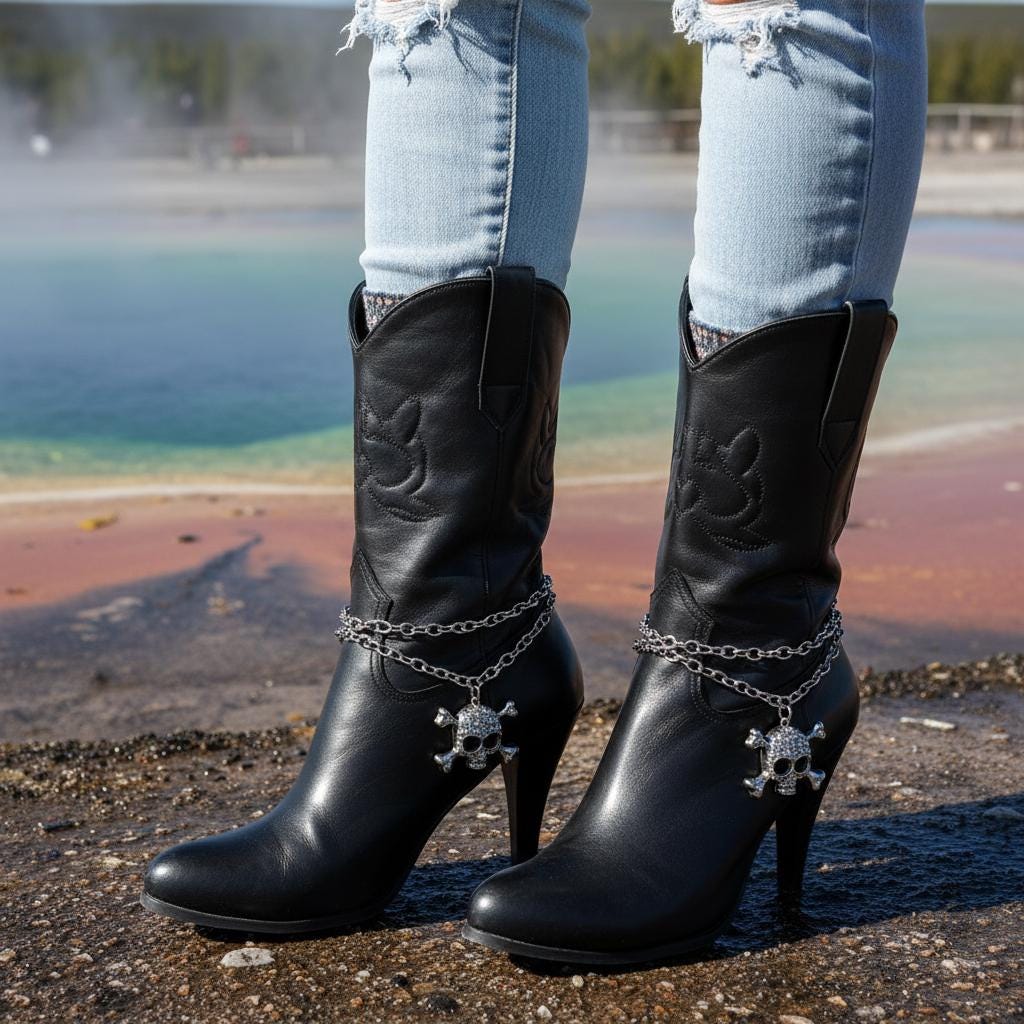 This set includes 2 boot chain bracelets—one for each boot—featuring layered silver-tone chain strands and a rhinestone skull-and-bones charm that adds sparkle with an edgy attitude. If you love western fashion, biker looks, gothic outfits, punk style, or festival-ready accessories, this is the kind of detail that makes a simple boot look styled and intentional.