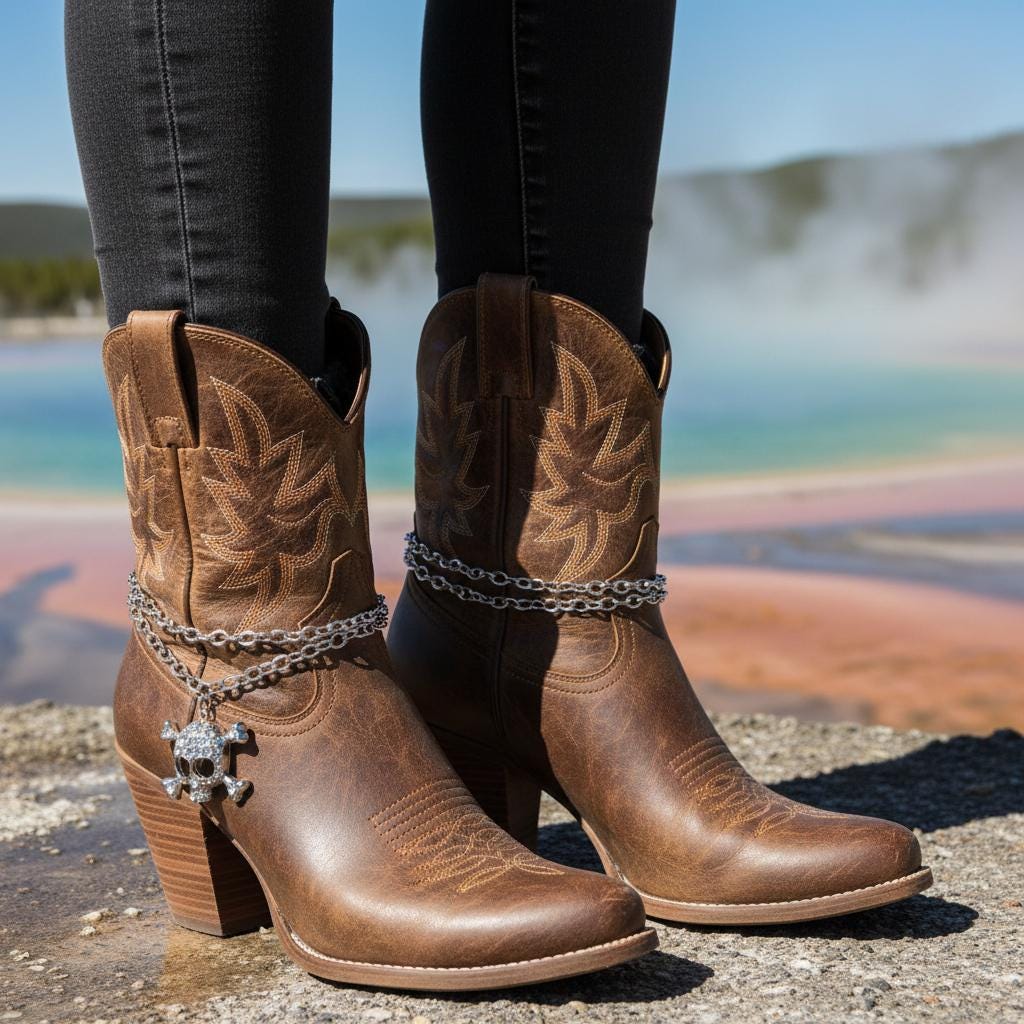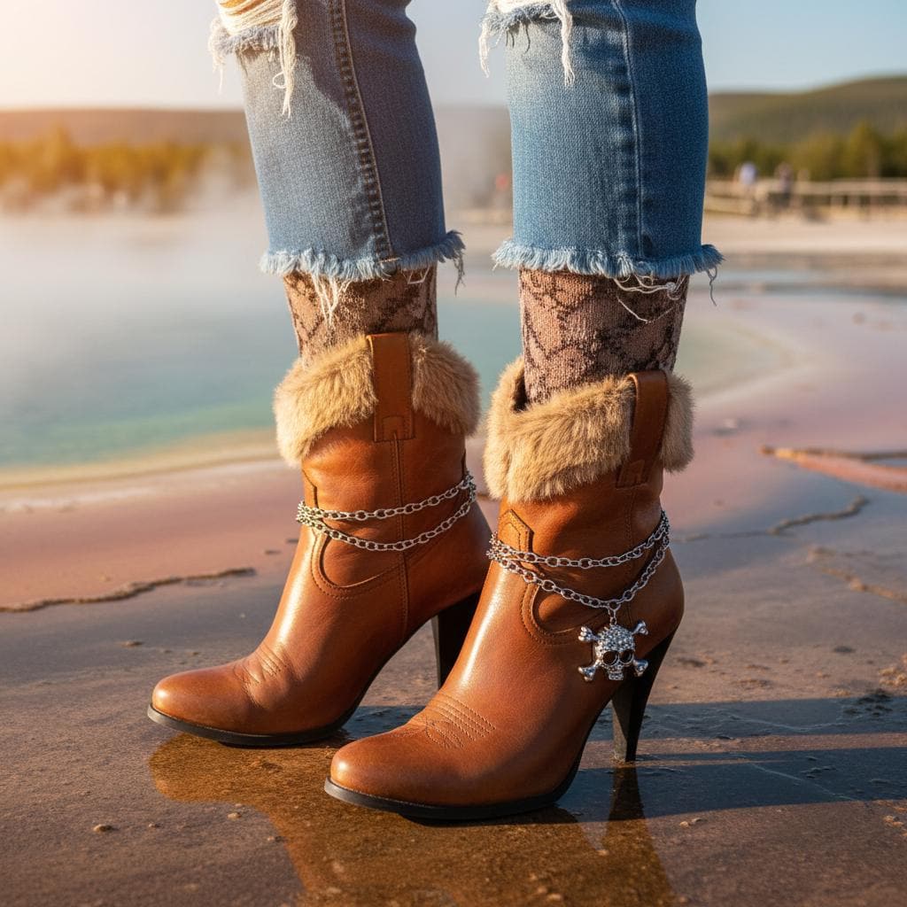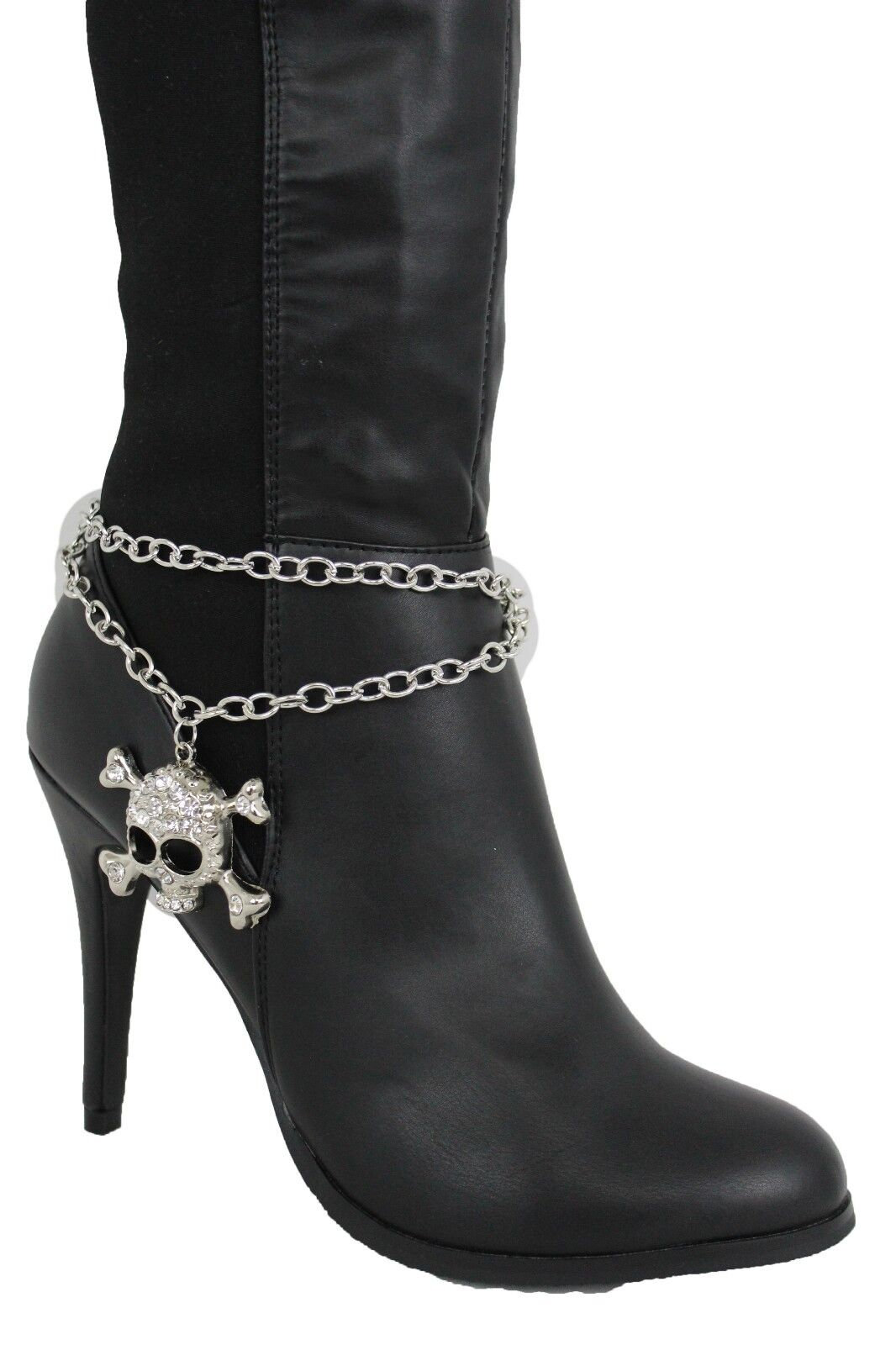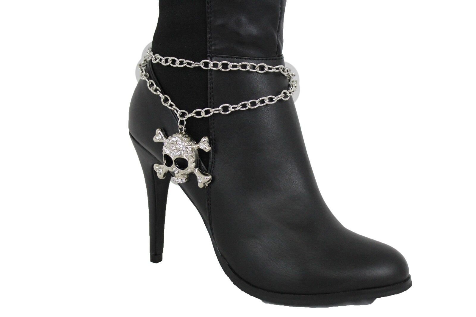 This set includes 2 boot chain bracelets—one for each boot—featuring layered silver-tone chain strands and a rhinestone skull-and-bones charm that adds sparkle with an edgy attitude. If you love western fashion, biker looks, gothic outfits, punk style, or festival-ready accessories, this is the kind of detail that makes a simple boot look styled and intentional.
