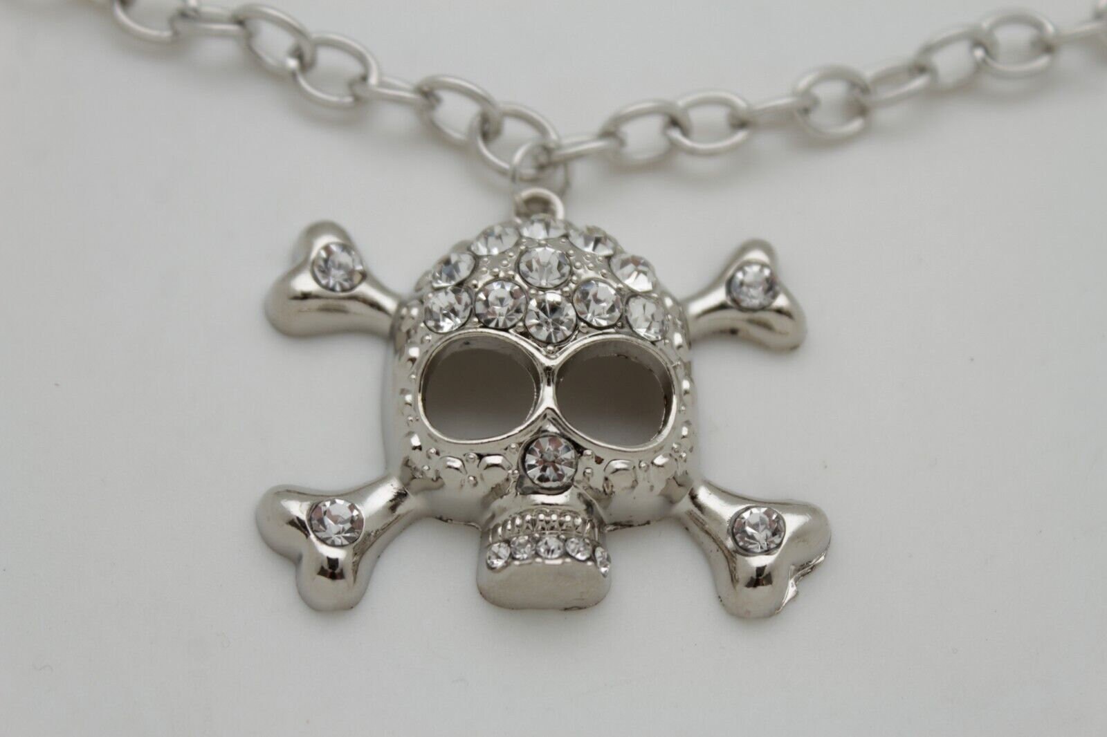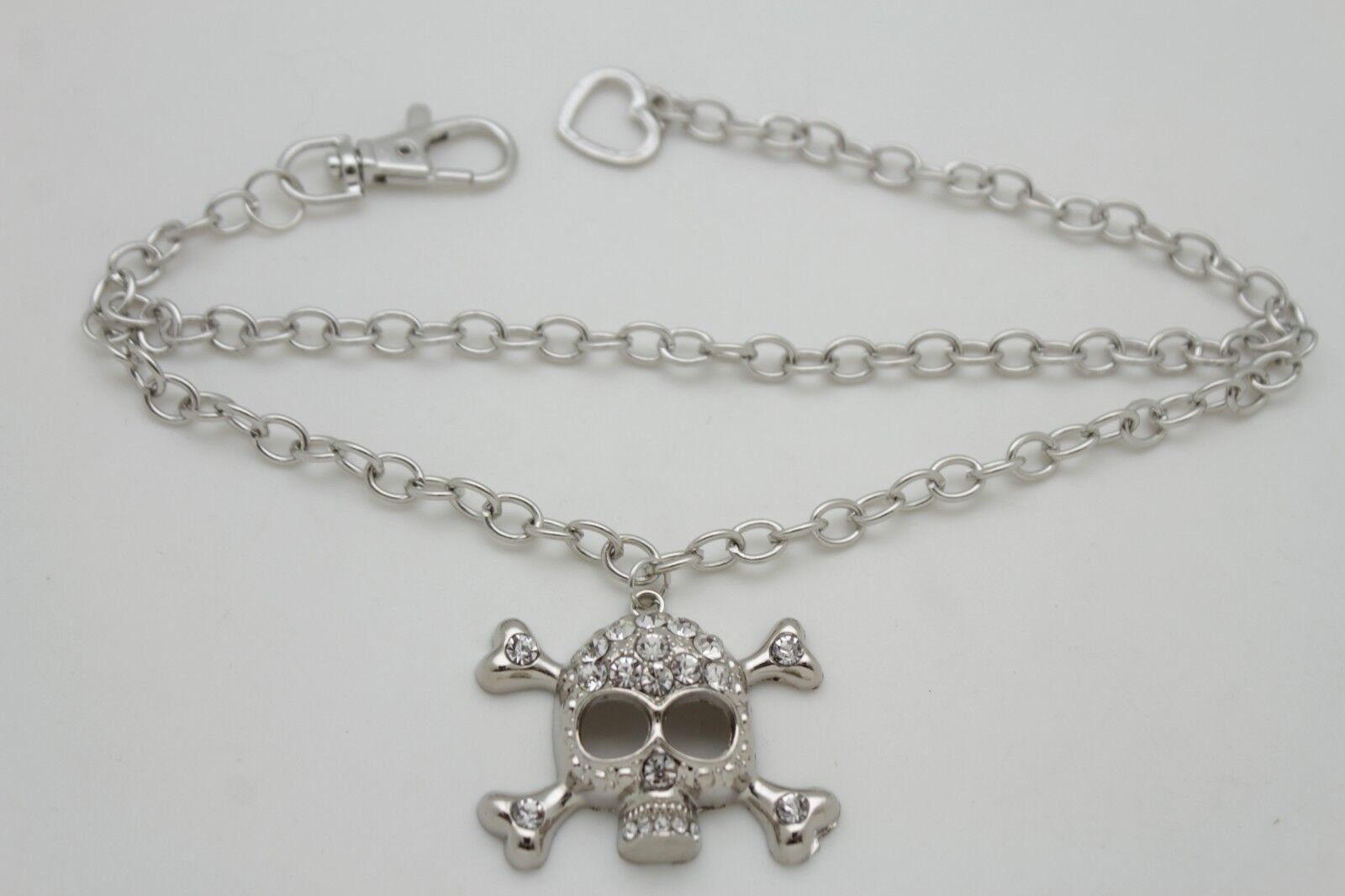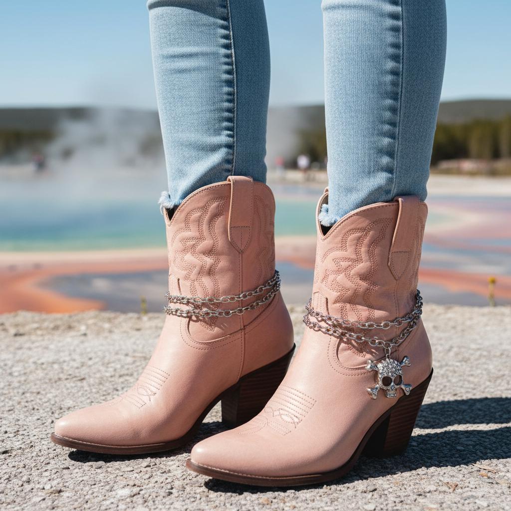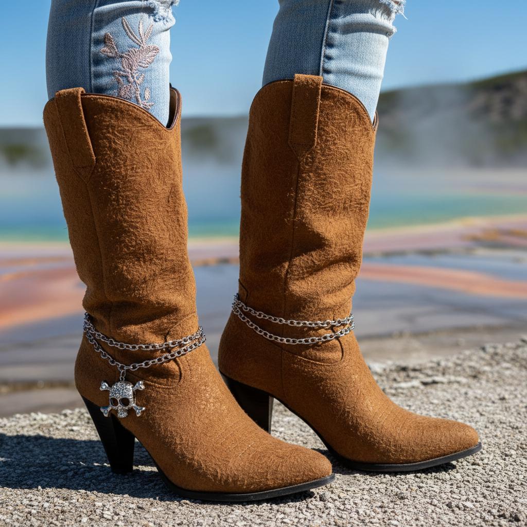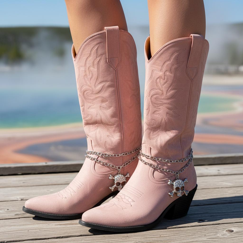 This set includes 2 boot chain bracelets—one for each boot—featuring layered silver-tone chain strands and a rhinestone skull-and-bones charm that adds sparkle with an edgy attitude. If you love western fashion, biker looks, gothic outfits, punk style, or festival-ready accessories, this is the kind of detail that makes a simple boot look styled and intentional.