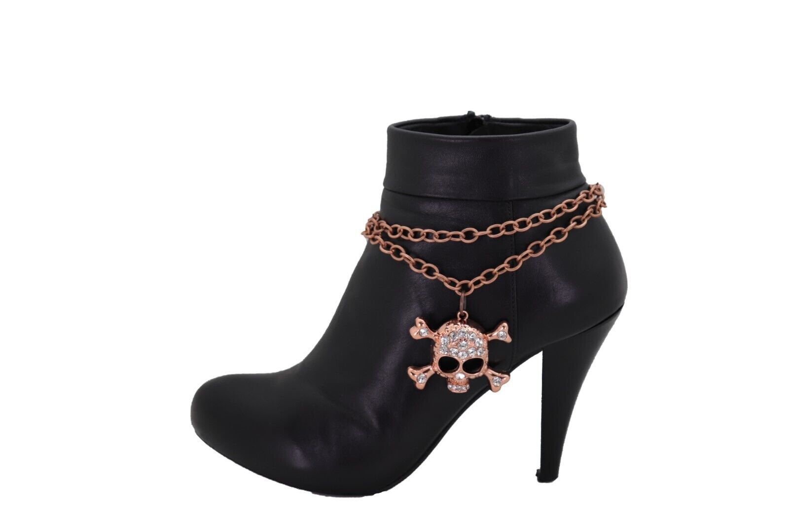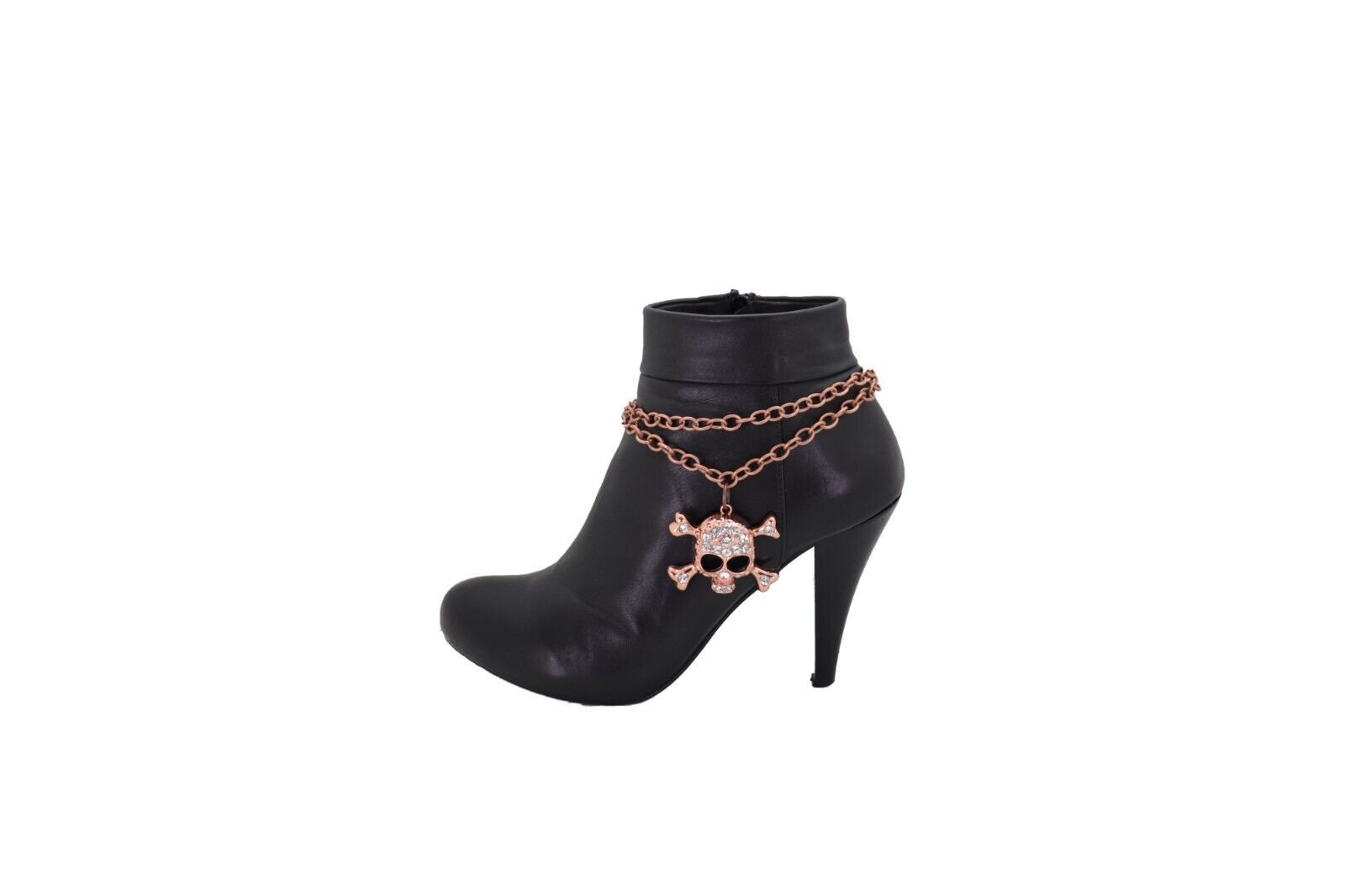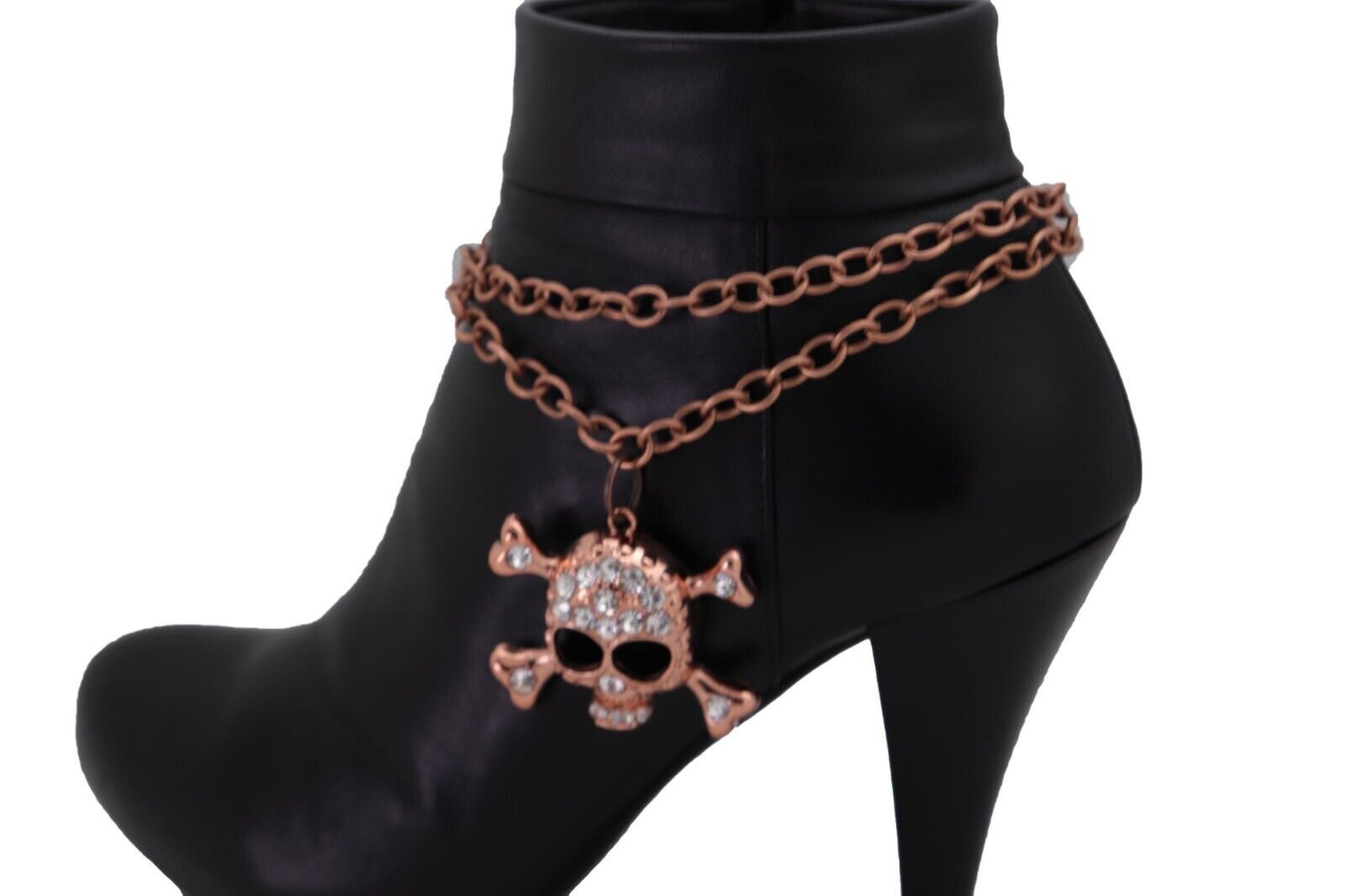 Meet your new favorite boot upgrade: rose gold/copper tone boot chain bracelets with a rhinestone skull-and-bones charm, sold as a pair (2 pcs) so both boots get the full look. These are made to add movement, shine, and a little rebellious personality—without changing your boots or your whole outfit.