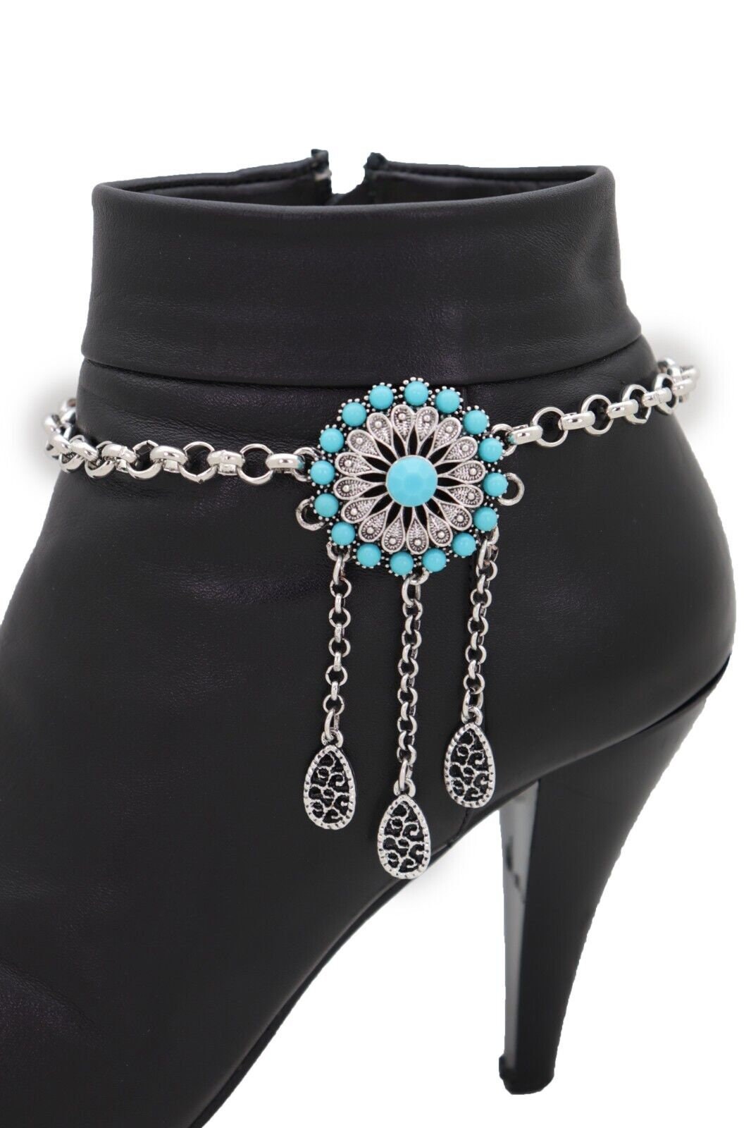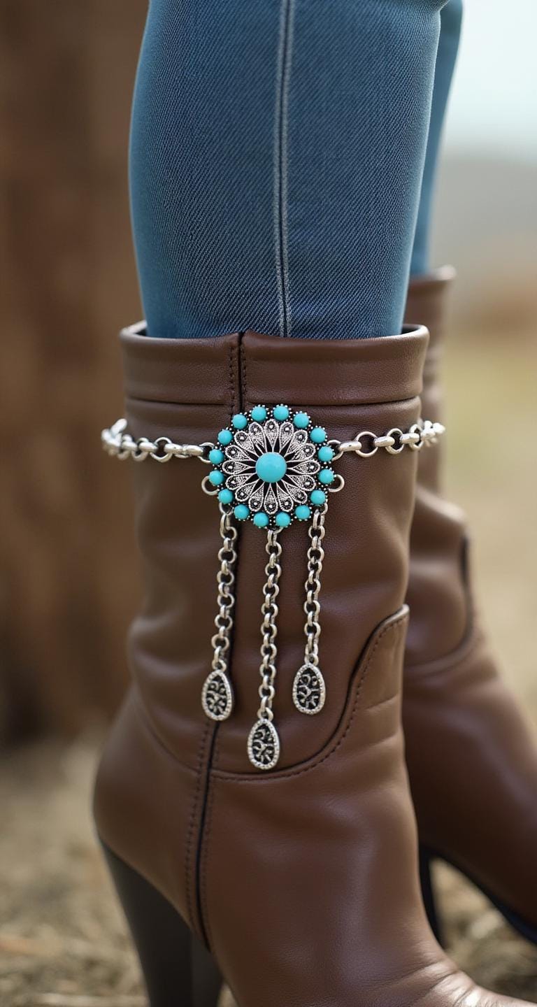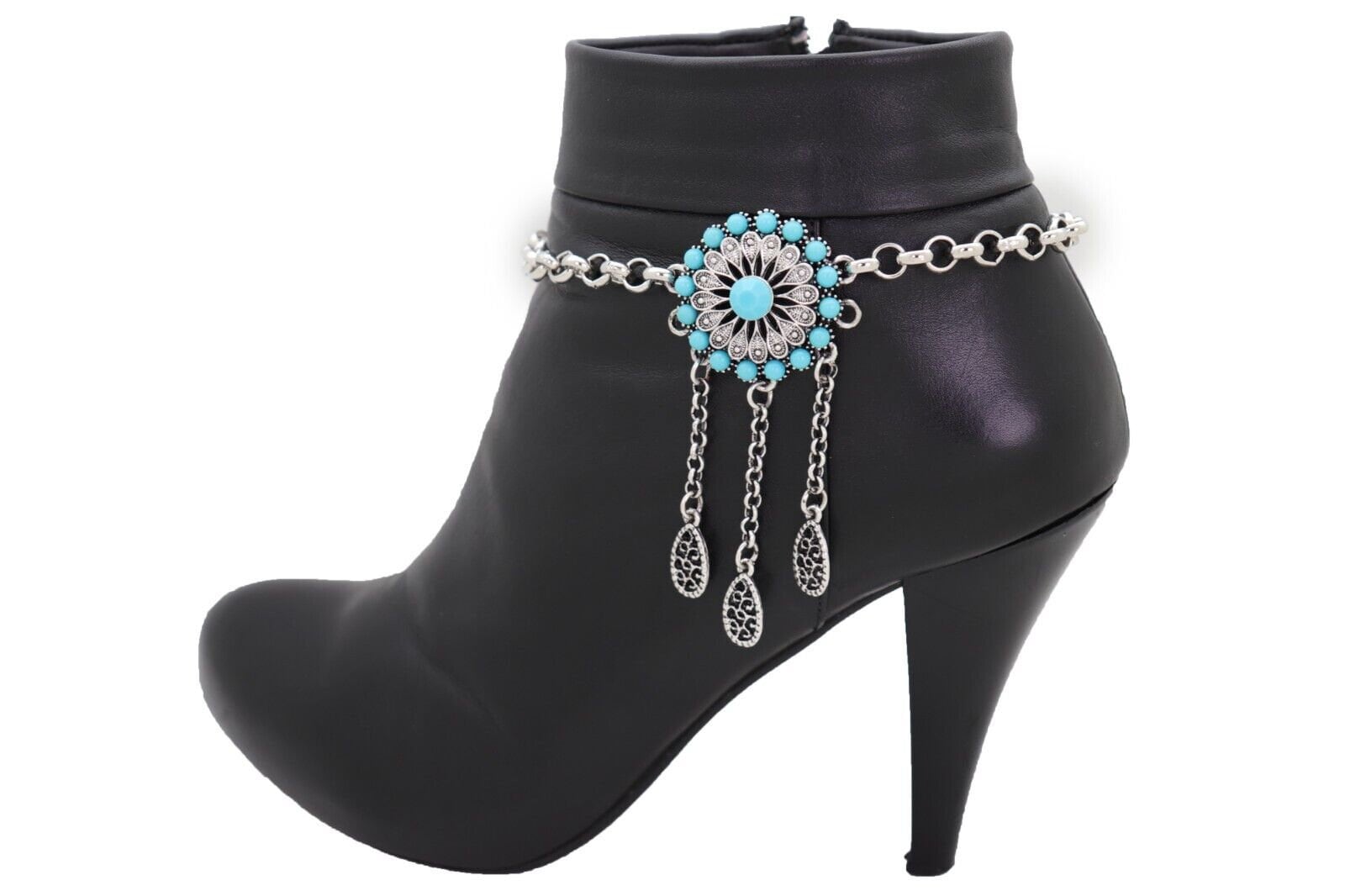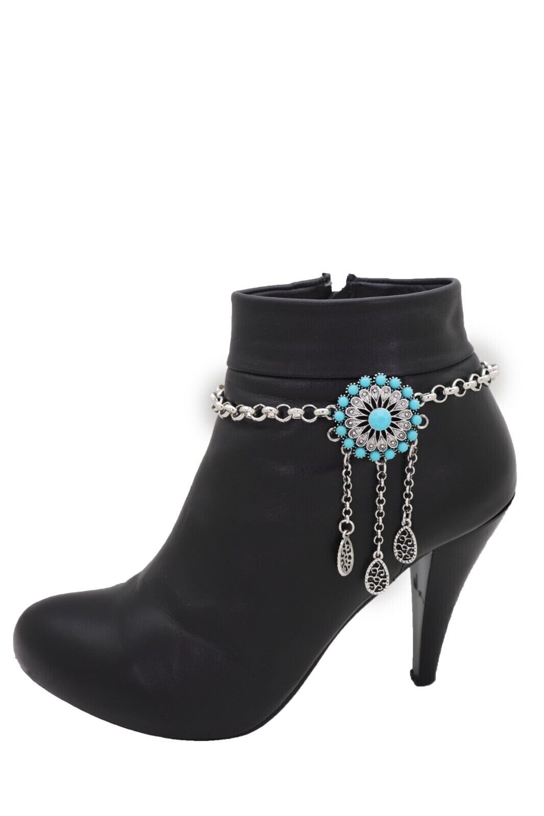 Turquoise Flower Boot Chains: Silver Cowgirl Anklets, Western Jewelry