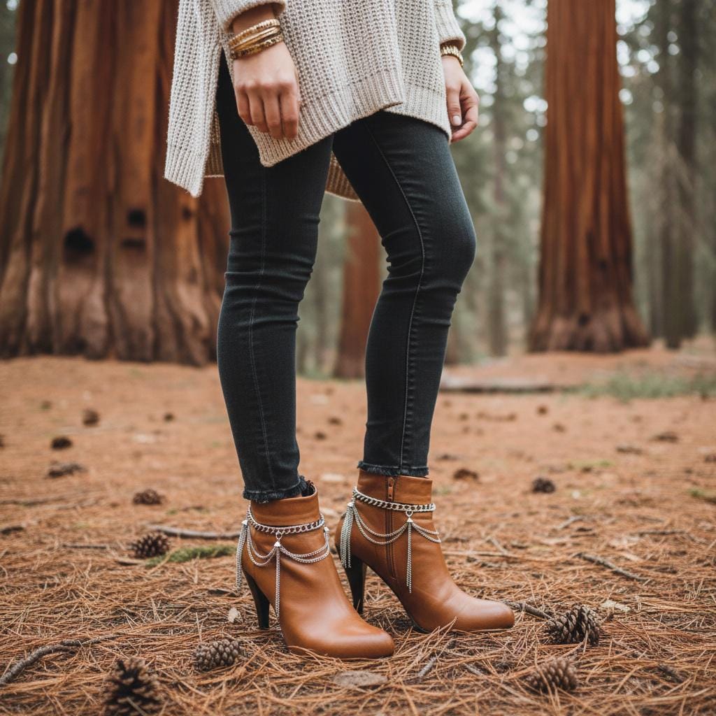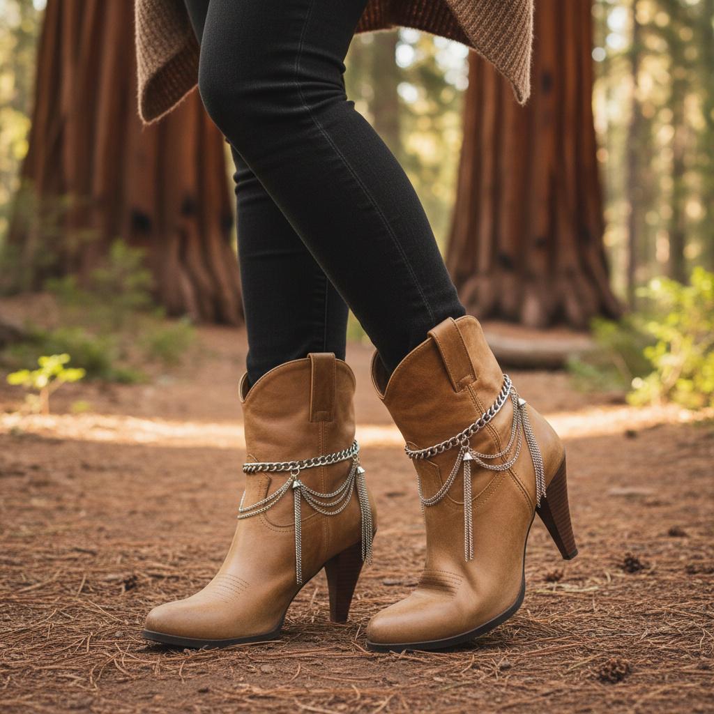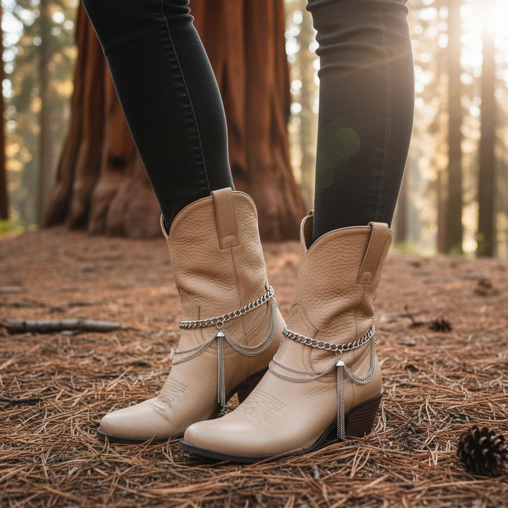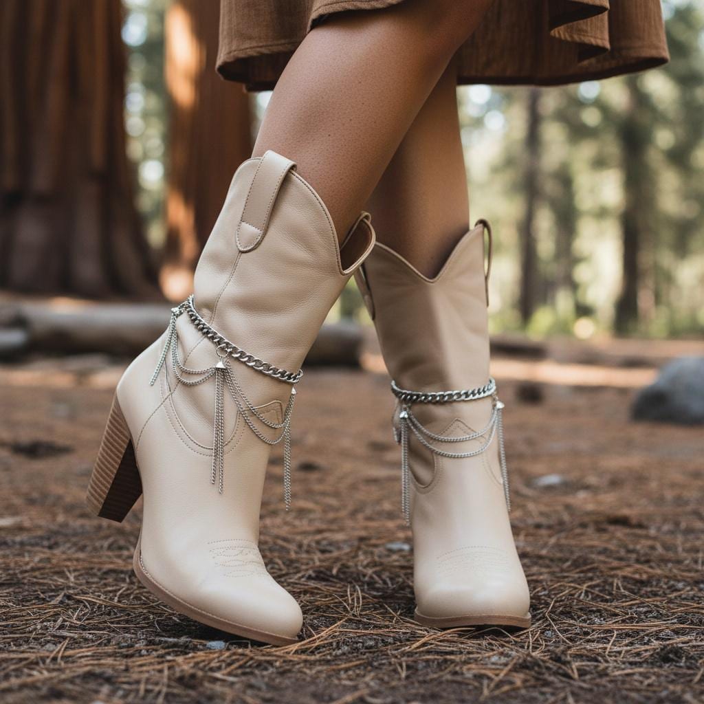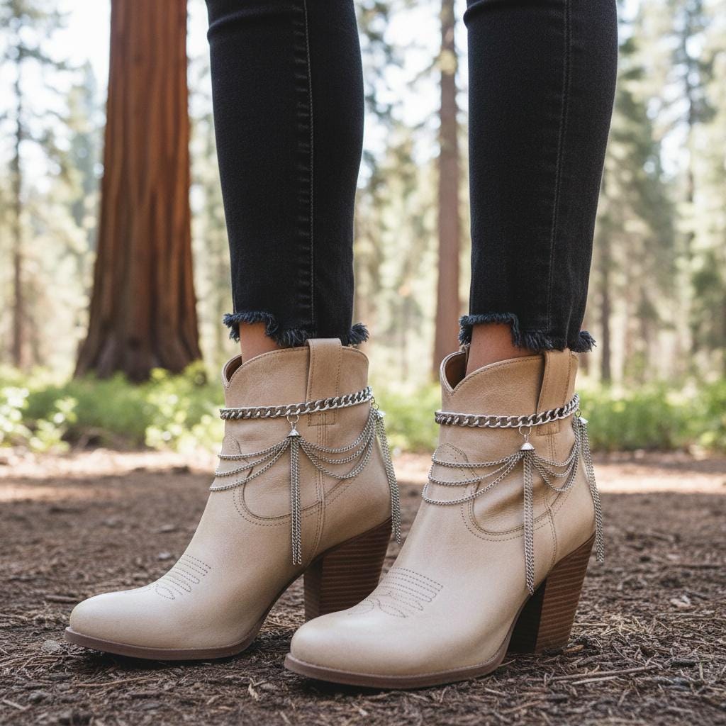 The design features a clean curb chain around the top, plus layered wave drape chains and tassel fringe for that statement swing when you walk. Style them over ankle boots, booties, or even a fashion heel for a modern western look.