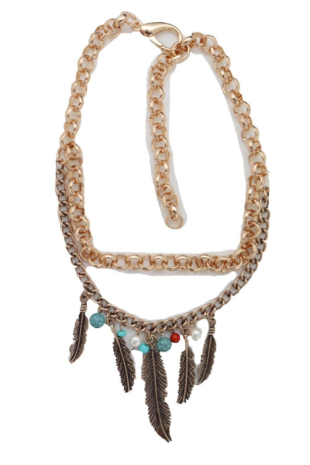 materials: antique gold tone metal chain links, feather charms, multicolor beads