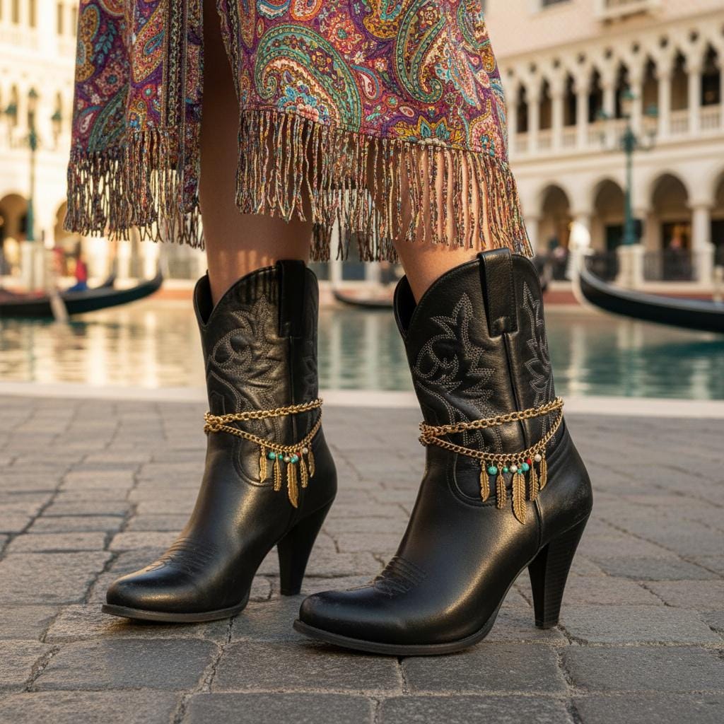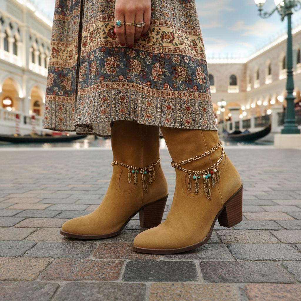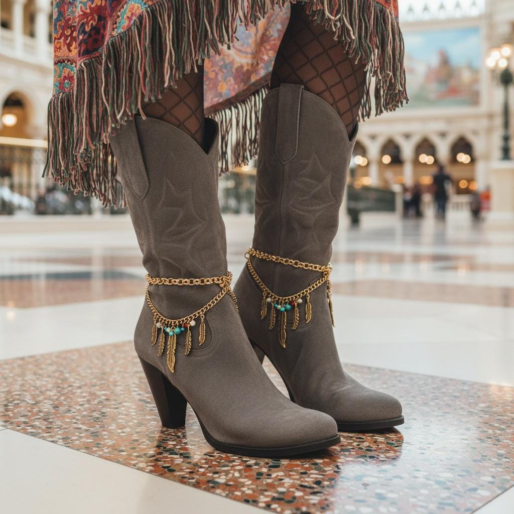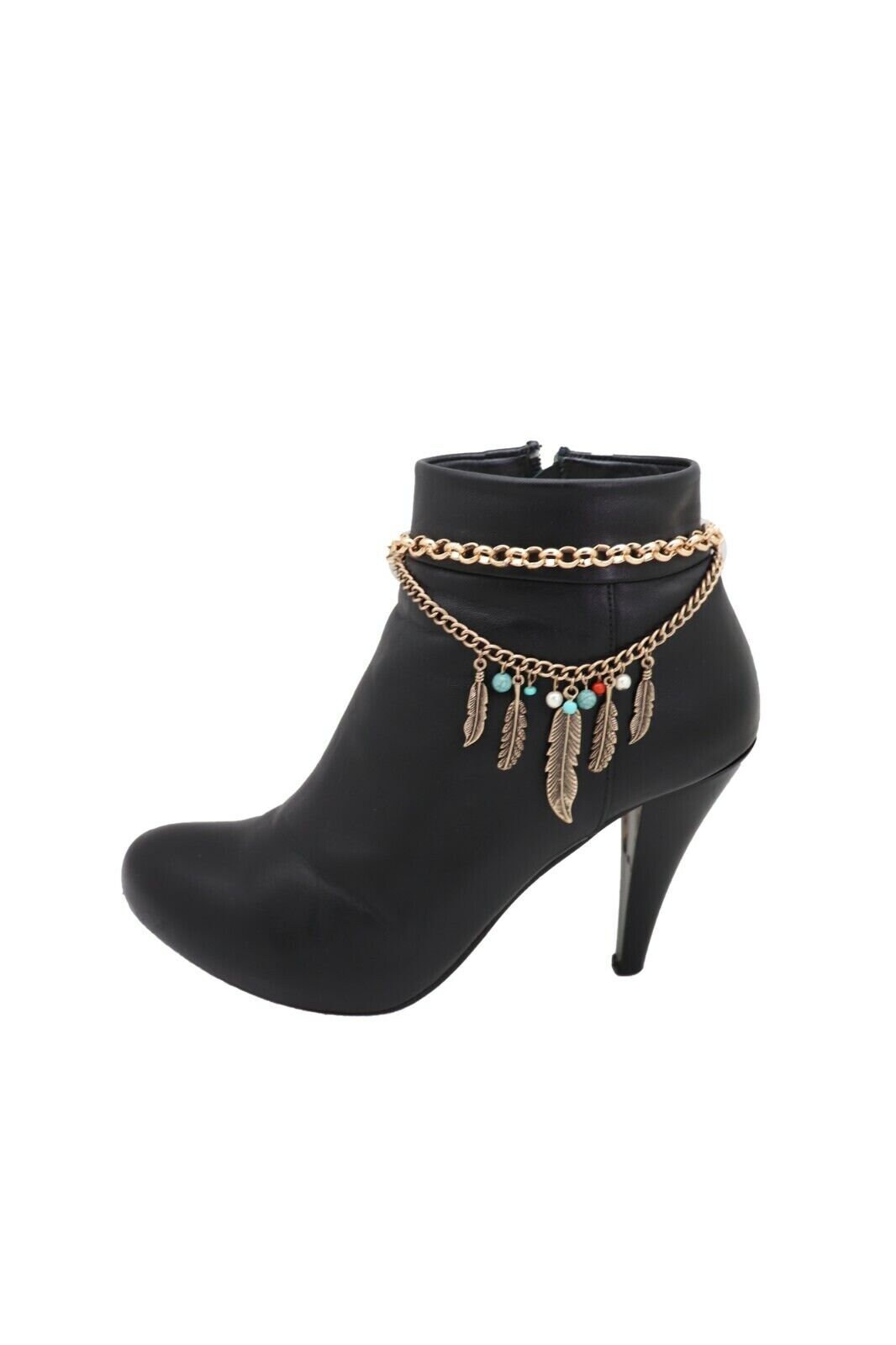 bc181 is a statement boot accessory designed to make your boots look styled in seconds. this pair of boot chain bracelets features a layered antique gold tone chain silhouette finished with long feather dangle charms and multicolor bead accents in turquoise, cream/white, and red. the look blends western energy with boho texture, giving your boots a detailed finish that works for concerts, line dancing, festival outfits, travel styling, and day-to-night looks.