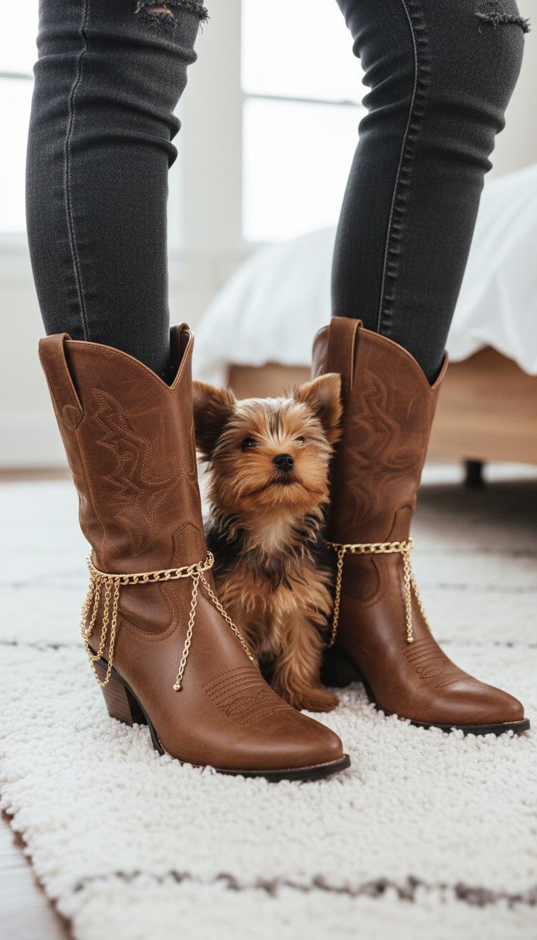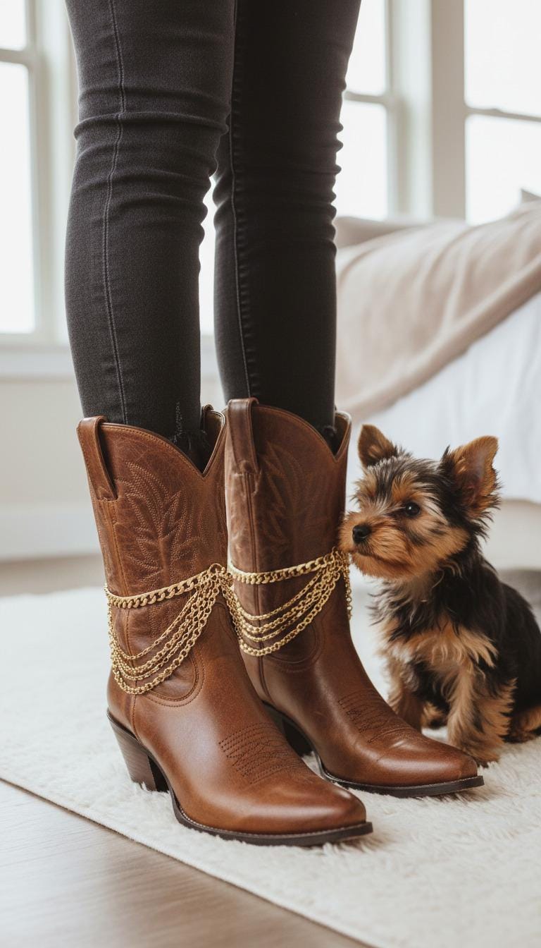 This listing is for one pair (2PCS) of boot chain anklets—one for each side—designed to wrap around the ankle/boot shaft area with a layered, draped chain look. The wave-style strands create movement and shine that looks amazing with cowboy boots, ankle boots, heeled booties, and even fashion sneakers when you want a fun twist.