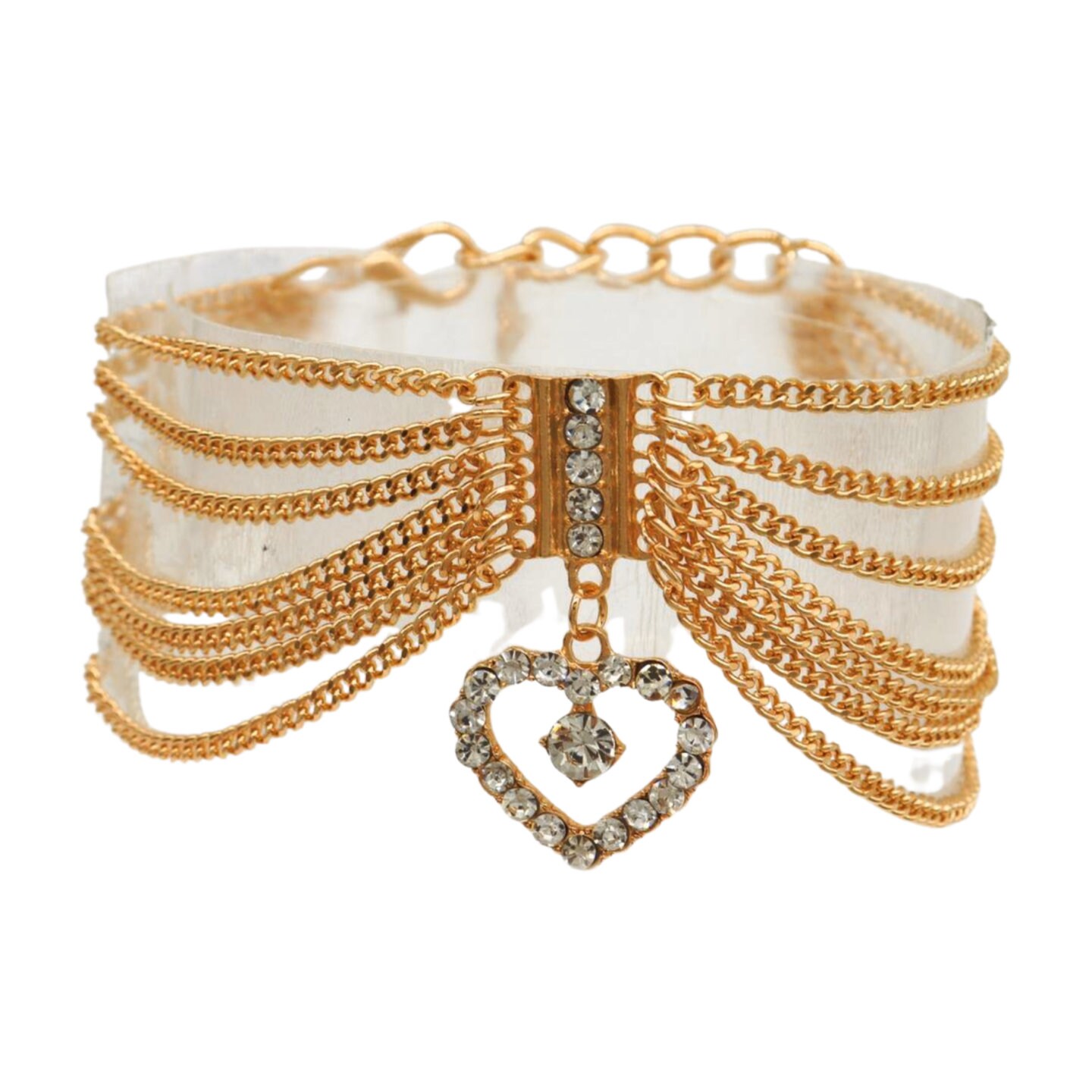 layered multi-wave drape in gold-tone chain with rhinestone heart charm