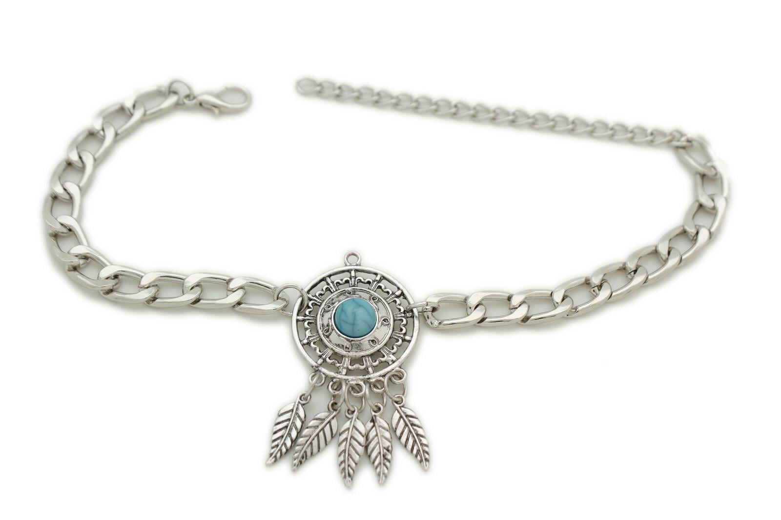 Silver Boot Chain Bracelets Pair, Dreamcatcher Charm Turquoise Feather Western Boho Boot Jewelry 2 Pcs, BC134