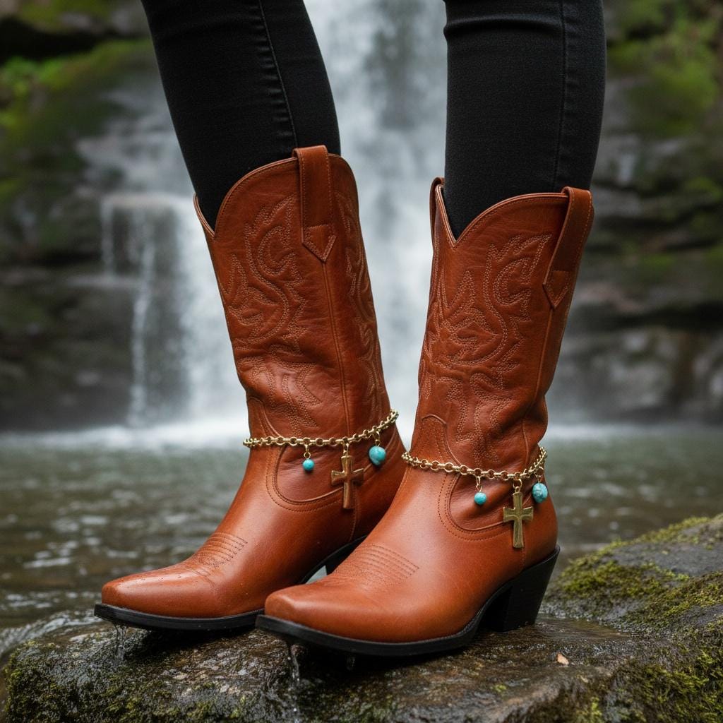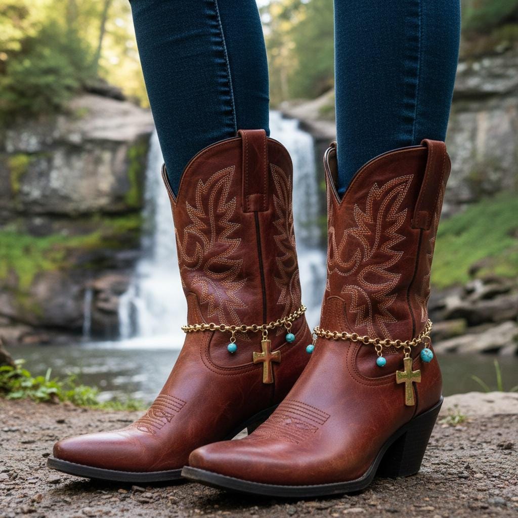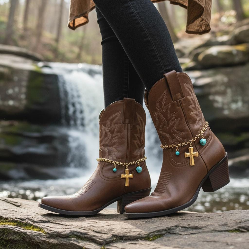This listing is for one pair (2pcs) of handmade boot chain bracelets—one chain for each boot—designed to add instant personality to your favorite footwear. The gold-tone chain gives a warm, polished shine, while the cross charm creates a bold centerpiece that stands out beautifully against black, brown, or neutral boots. Finished with turquoise-style bead accents, this set delivers a classic western-boho vibe that looks amazing in photos and even better in real life.