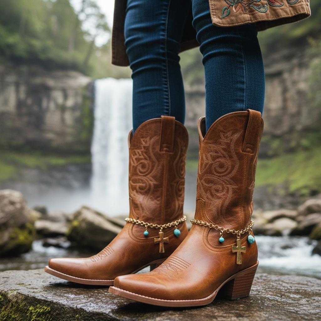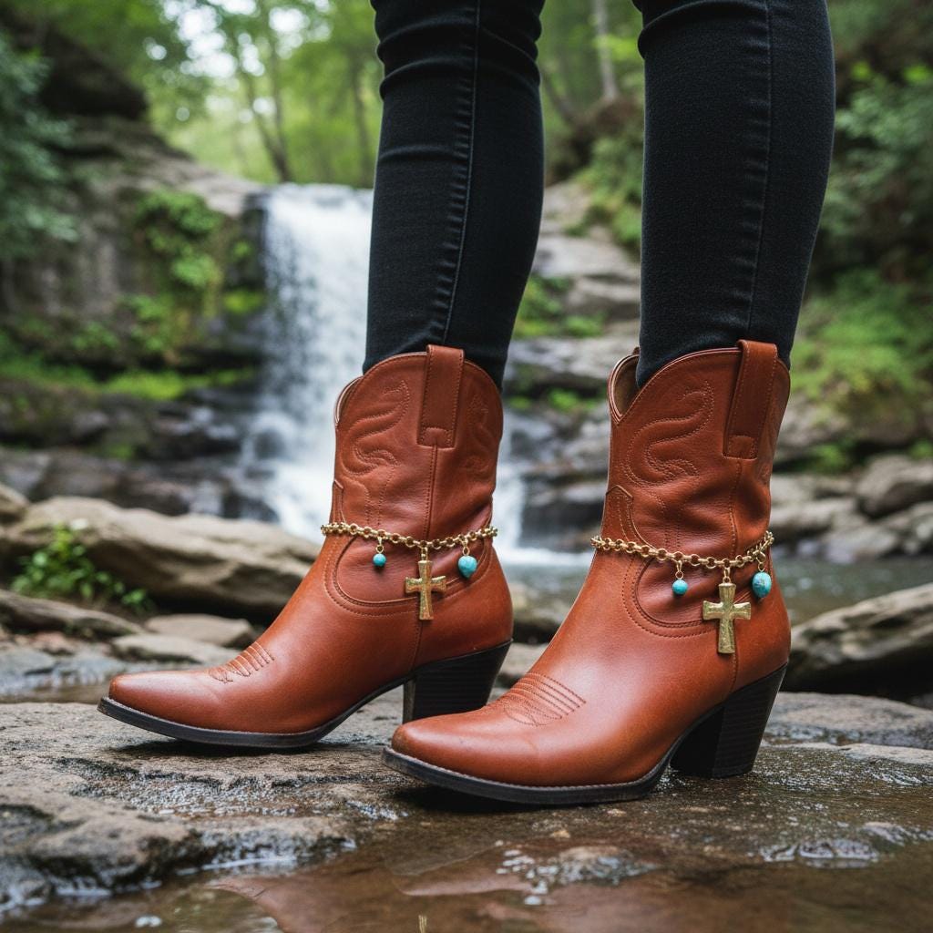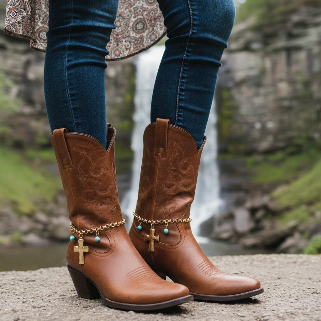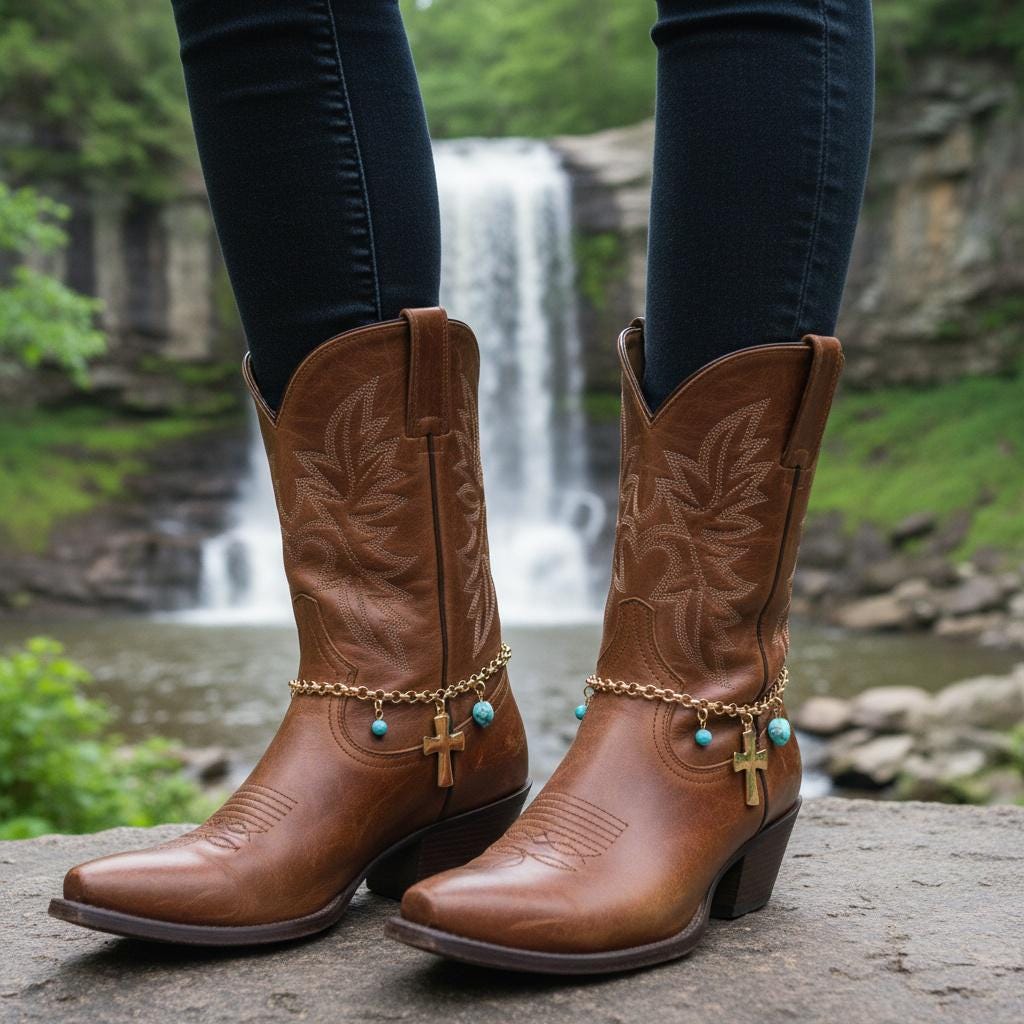 This listing is for one pair (2pcs) of handmade boot chain bracelets—one chain for each boot—designed to add instant personality to your favorite footwear. The gold-tone chain gives a warm, polished shine, while the cross charm creates a bold centerpiece that stands out beautifully against black, brown, or neutral boots. Finished with turquoise-style bead accents, this set delivers a classic western-boho vibe that looks amazing in photos and even better in real life.