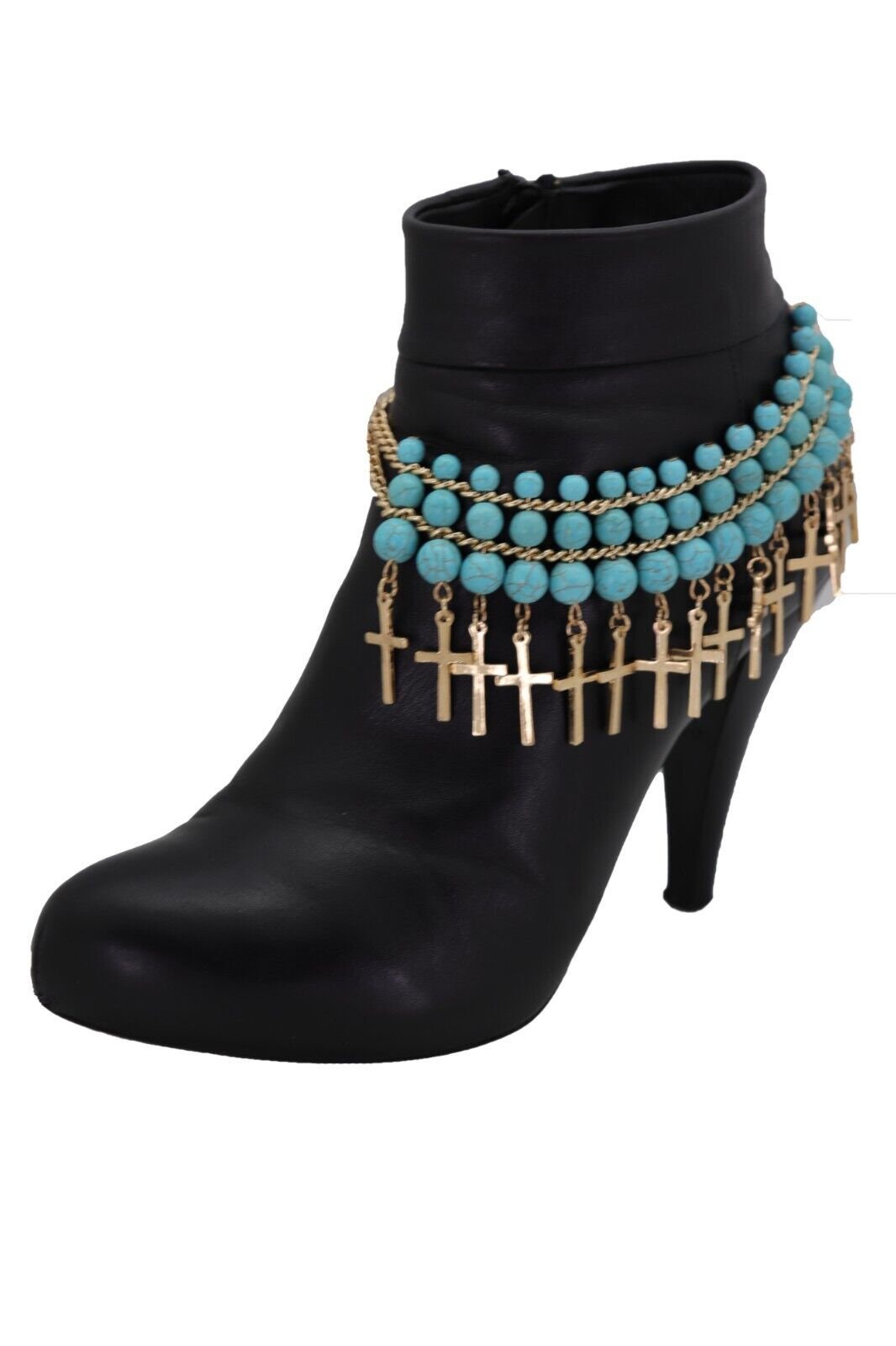 Western Bling Elegance: Infuse your boots with glamour using this single boot strap featuring gold metal chain links, charming charms, and eye-catching turquoise blue beads.