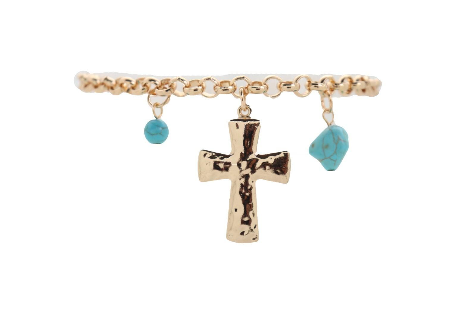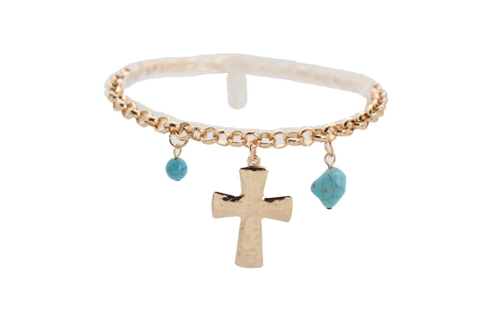 Color: Gold tone chain + turquoise-style bead accents + gold-tone cross charm