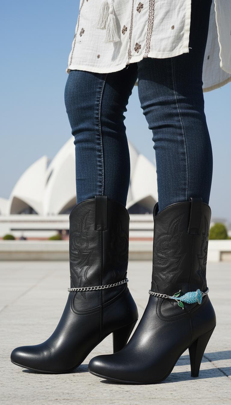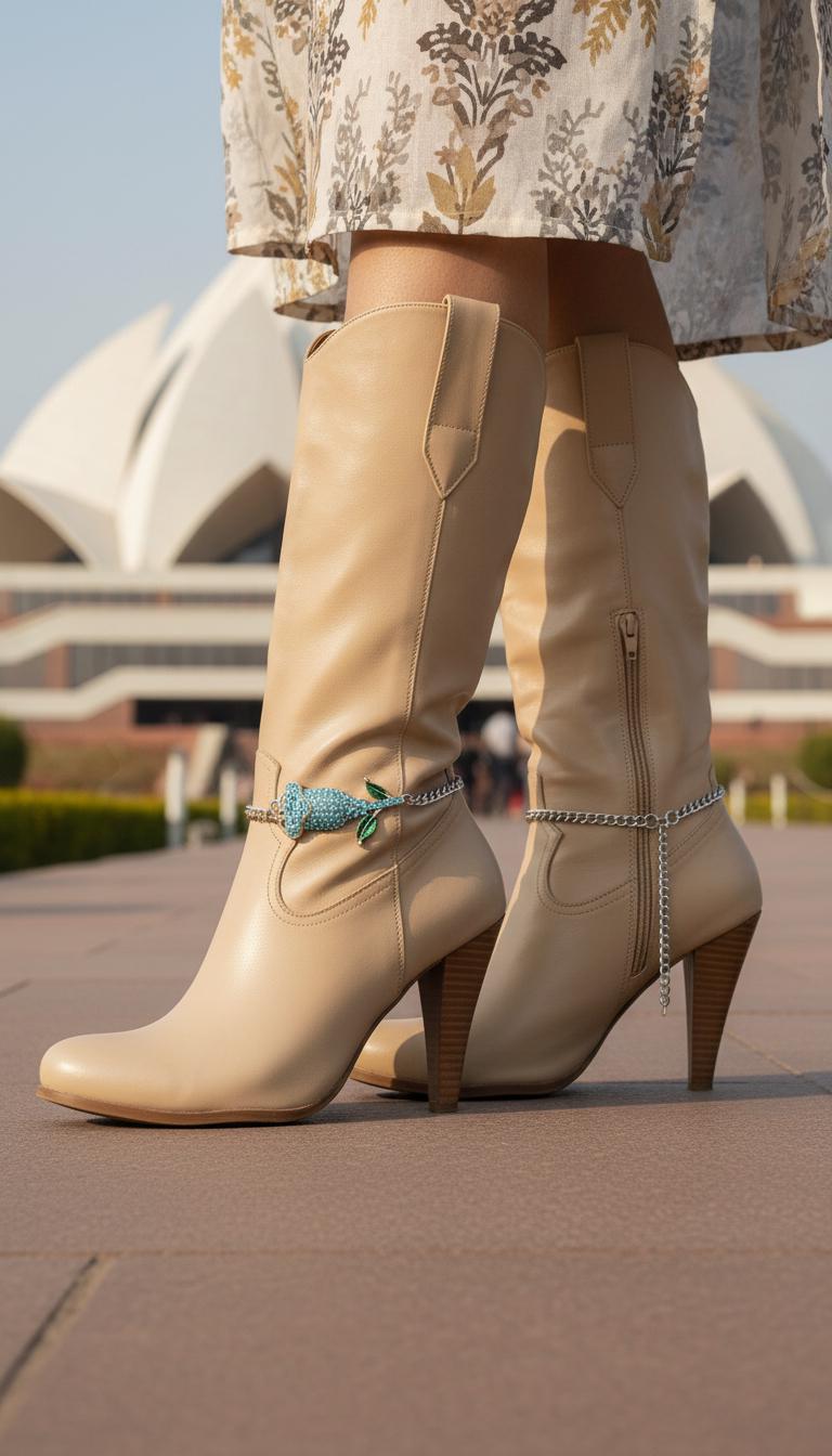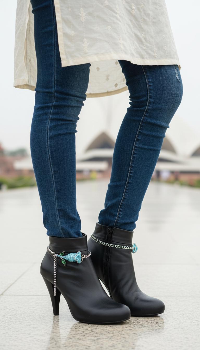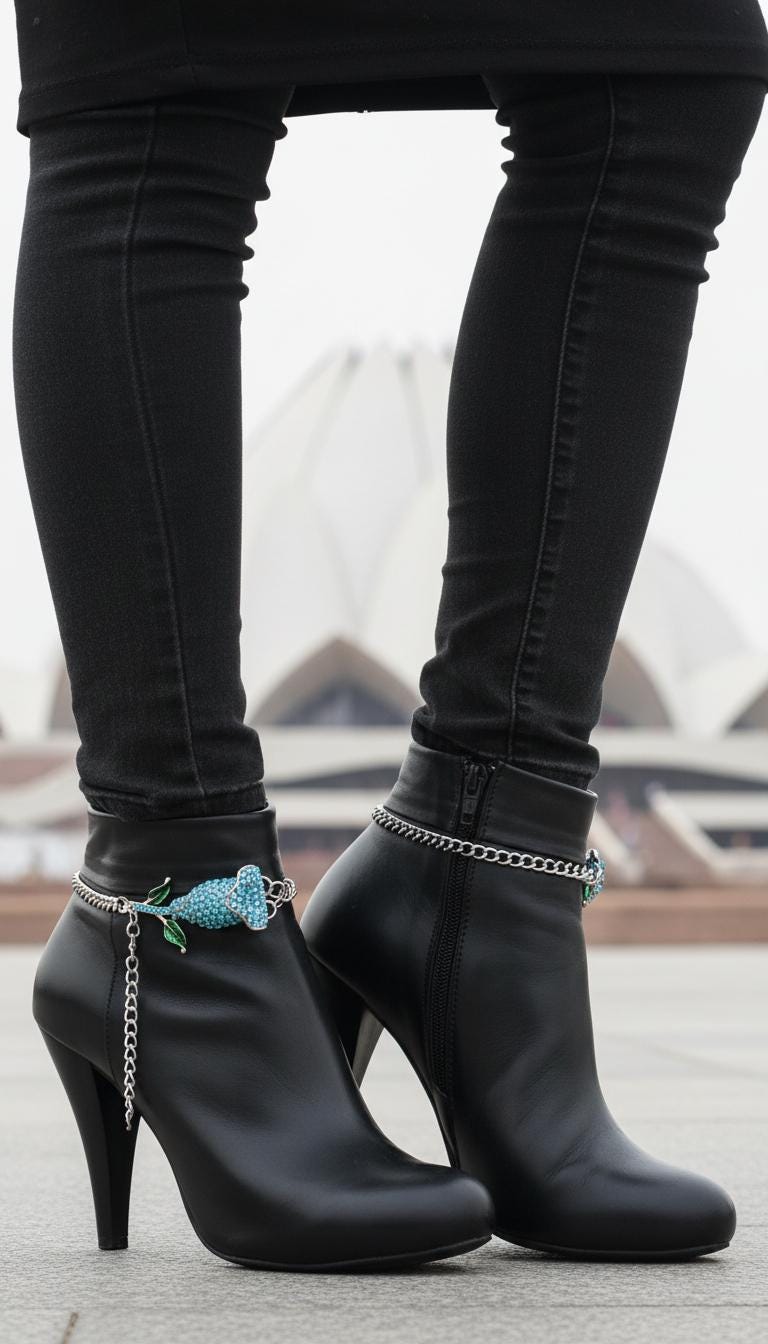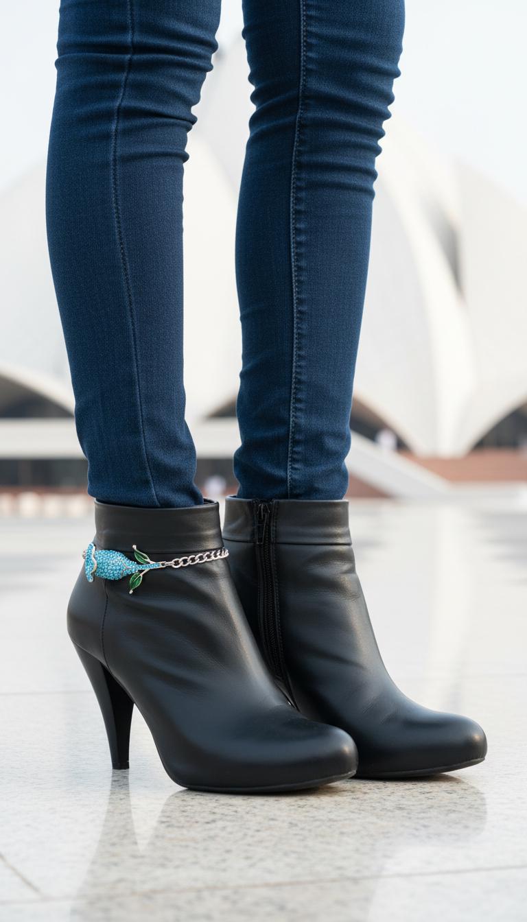 If you love styling outfits with little “wow” details, this is the piece that turns simple boots into a full fashion moment. The blue rhinestones catch light beautifully, while the green leaf accents keep the charm looking fresh, feminine, and fun. It works with black boots, brown boots, tan boots, booties—basically any pair that deserves compliments.