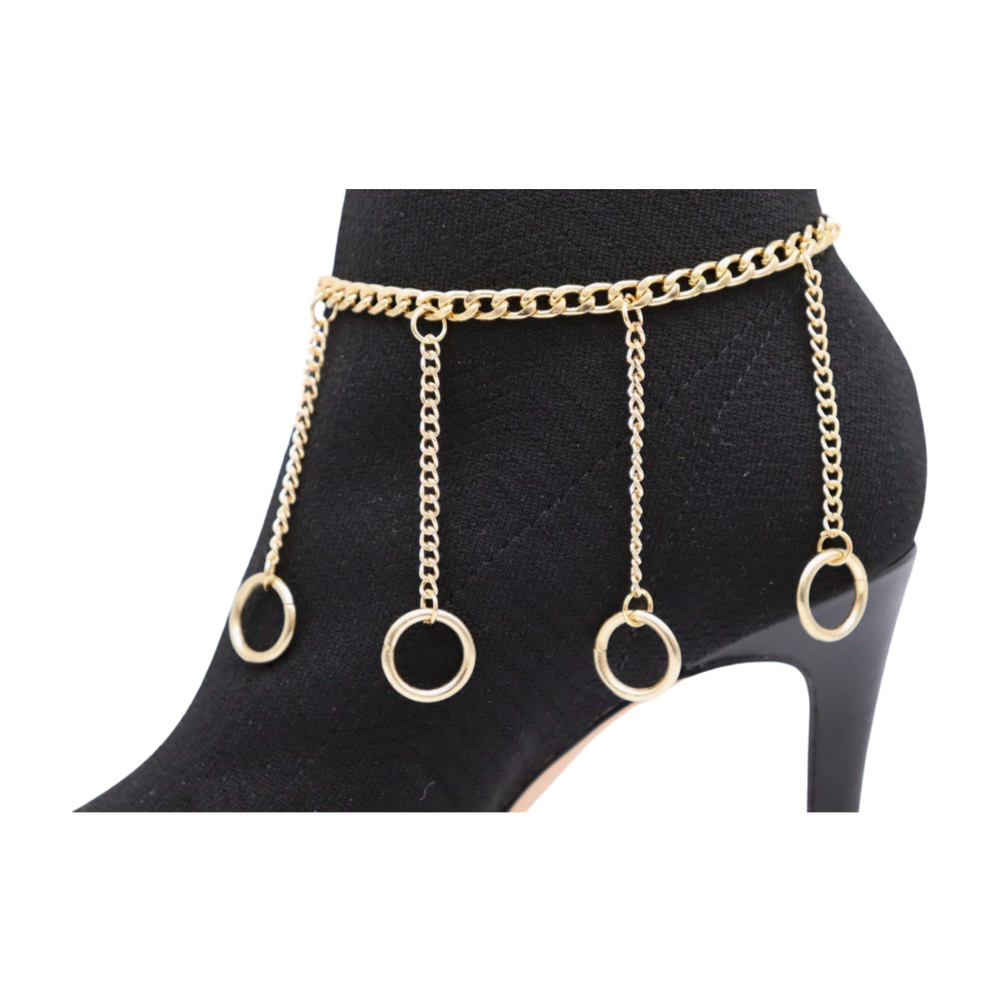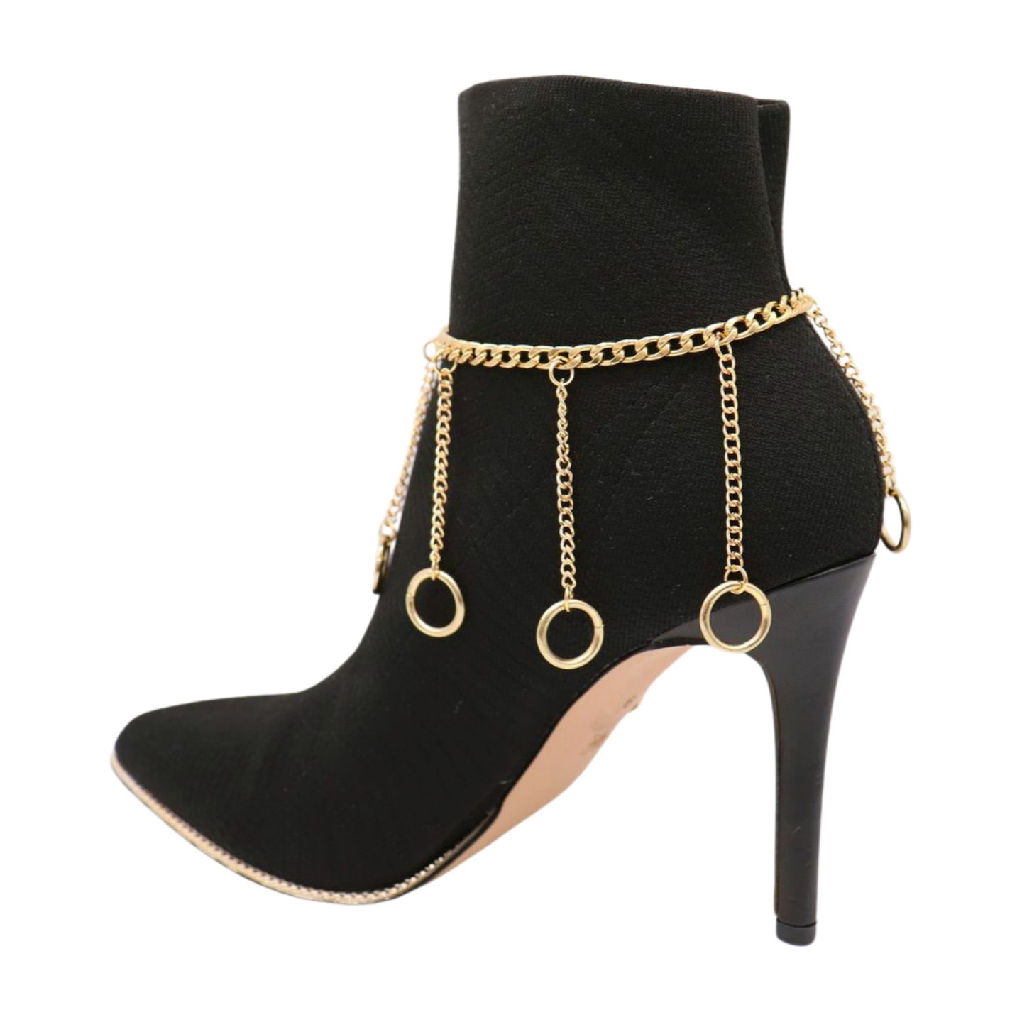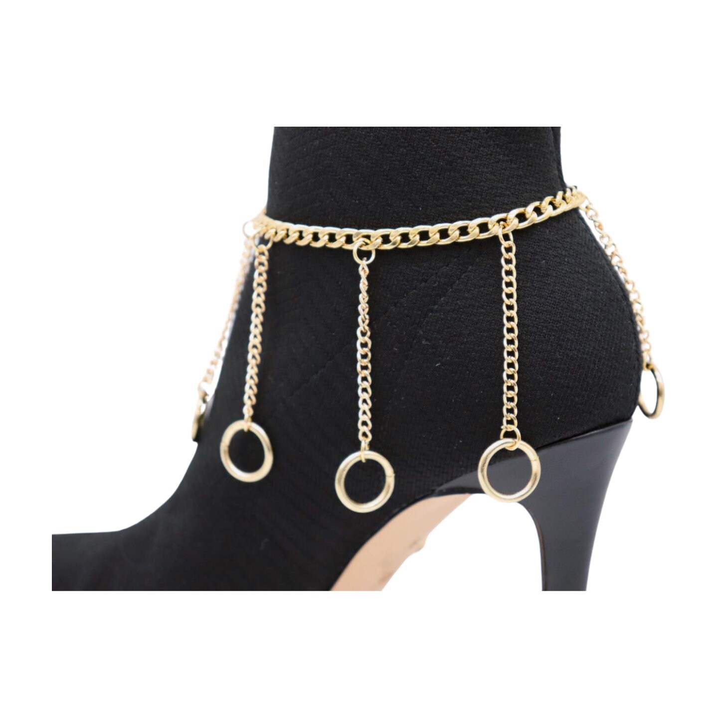 This listing is for a matching pair of gold tone boot chain anklets designed to wrap around your boots and instantly upgrade your outfit. Each piece features multiple dangling ring charms that sway as you walk (or dance, or dramatically enter the room like you own the place). The look is western-inspired, photo-friendly, and surprisingly easy to style with everything from jeans to dresses.
