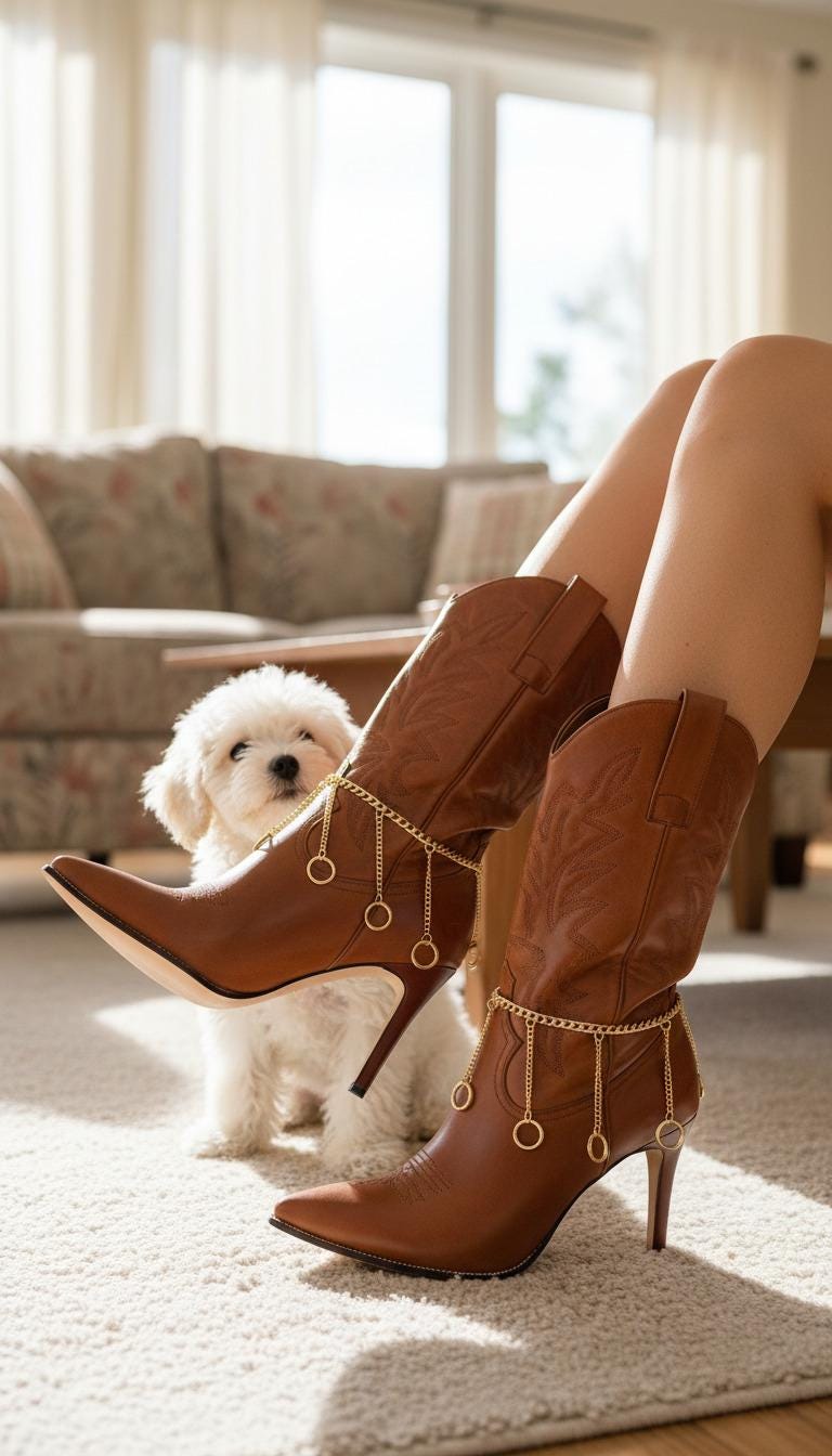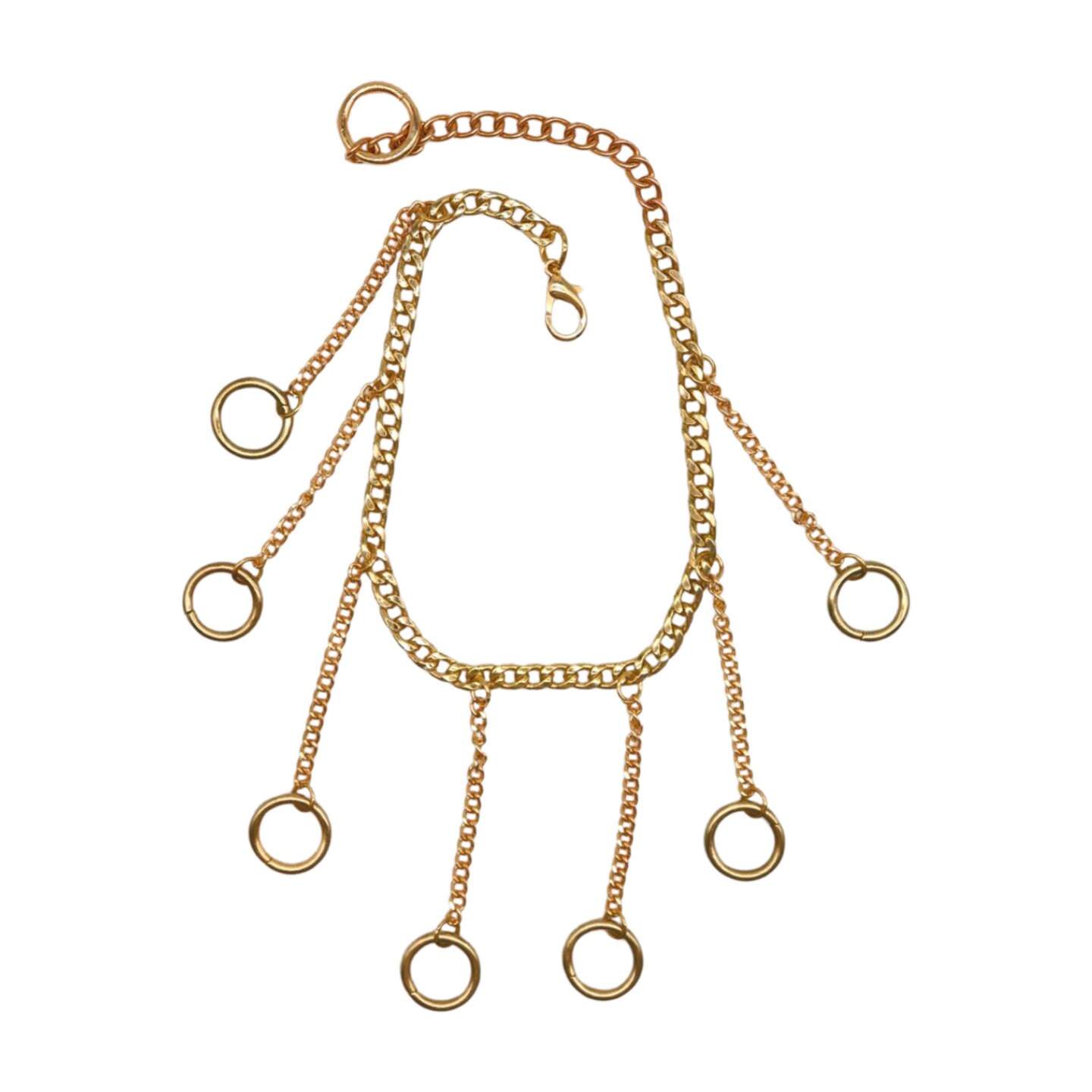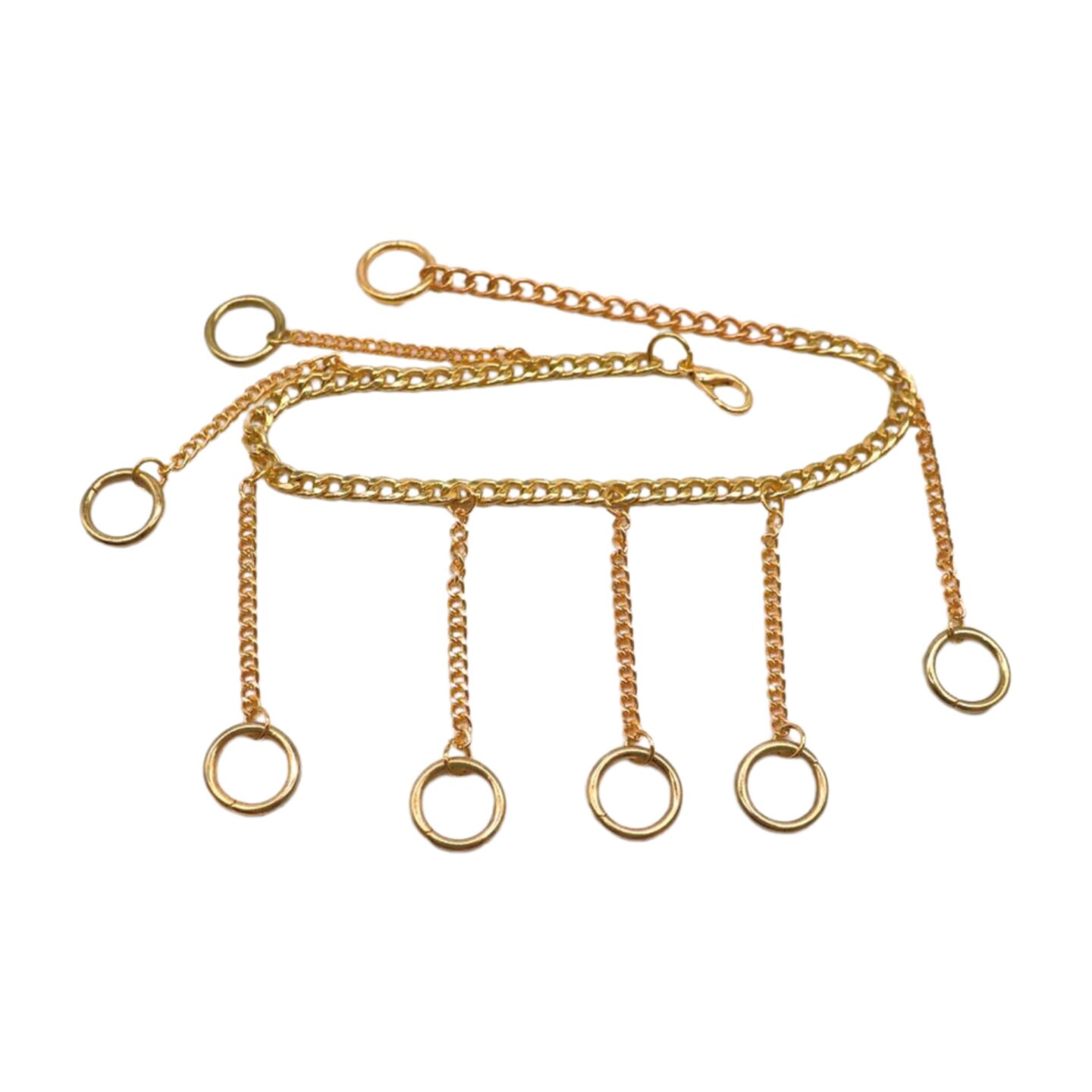 This listing is for a matching pair of gold tone boot chain anklets designed to wrap around your boots and instantly upgrade your outfit. Each piece features multiple dangling ring charms that sway as you walk (or dance, or dramatically enter the room like you own the place). The look is western-inspired, photo-friendly, and surprisingly easy to style with everything from jeans to dresses.