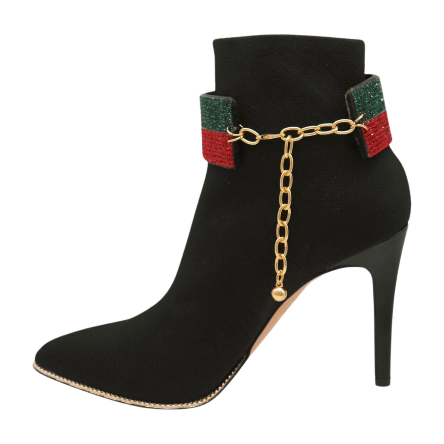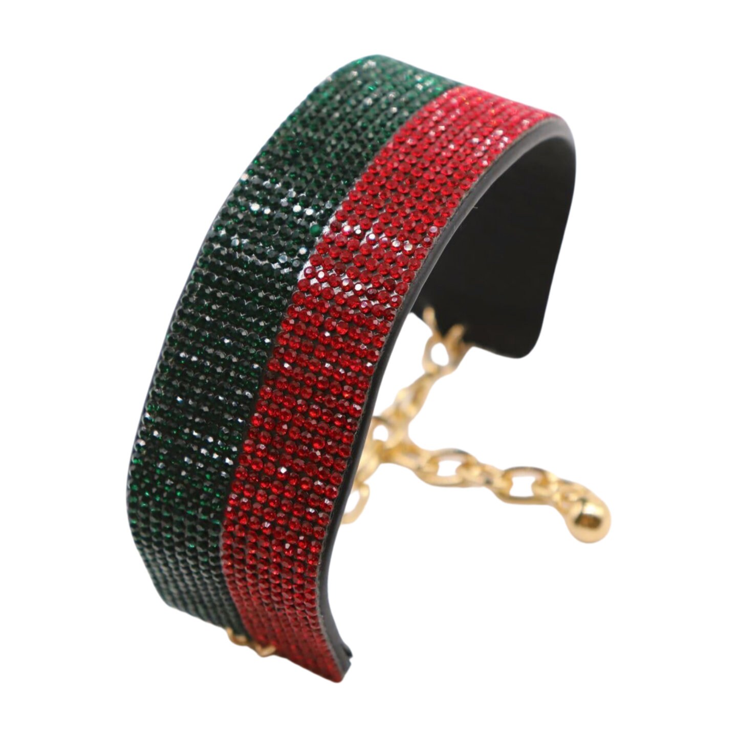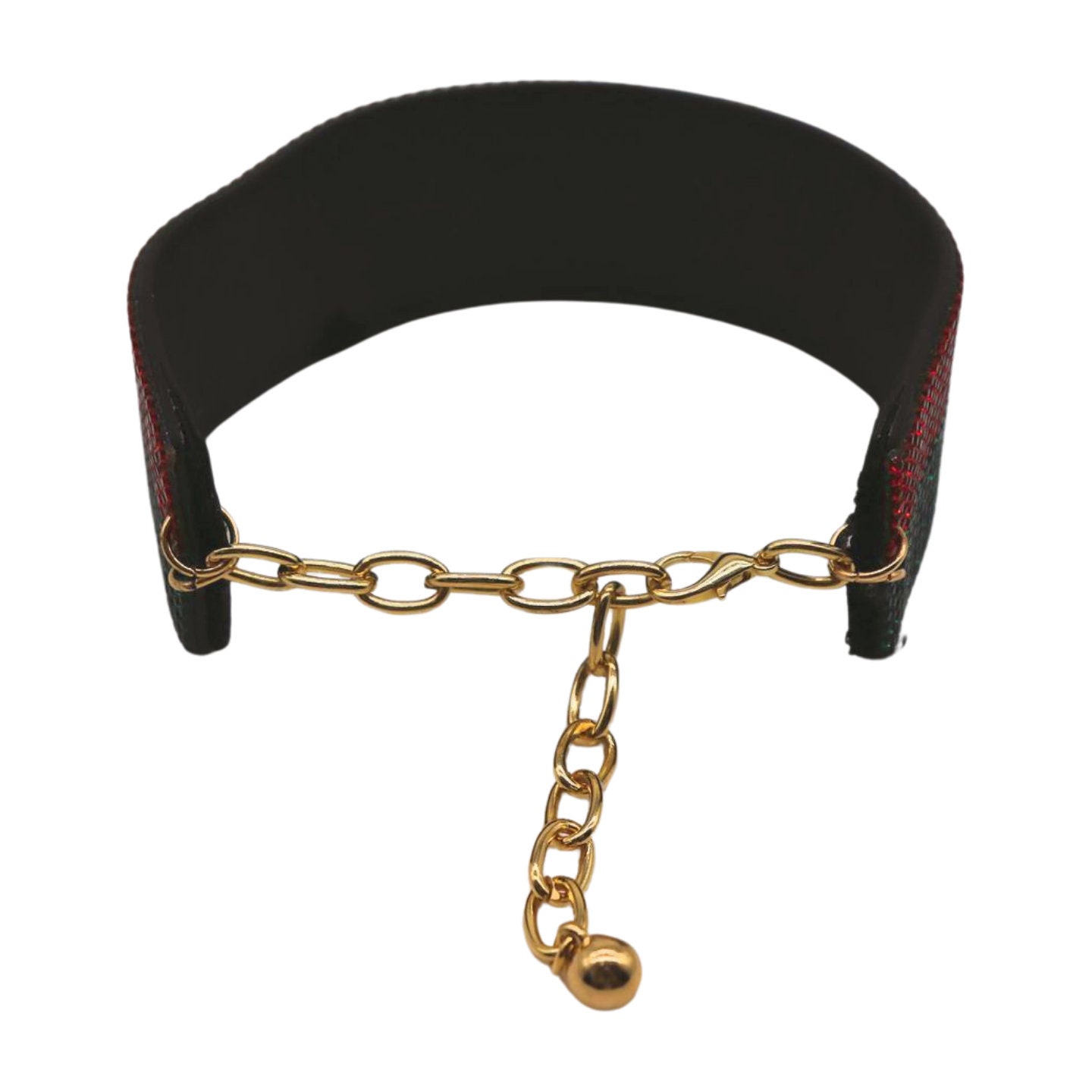 Color: Black faux leather strap band + gold metal chain links + red and green rhinestones
