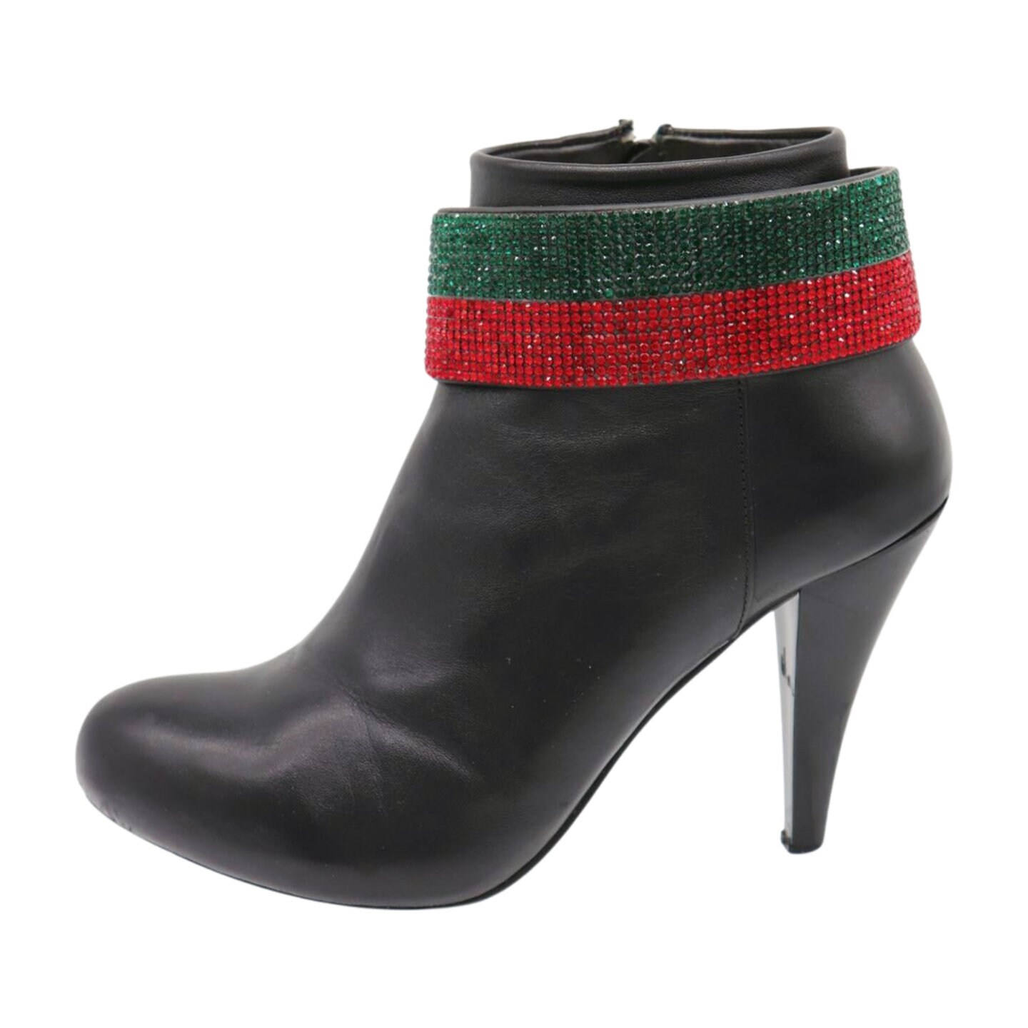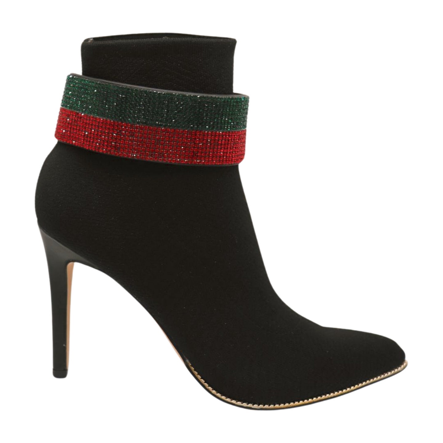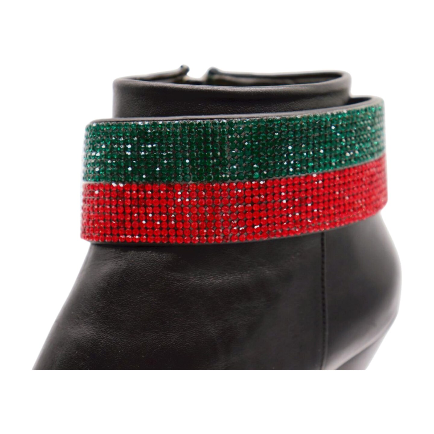 Color: Black faux leather strap band + gold metal chain links + red and green rhinestones