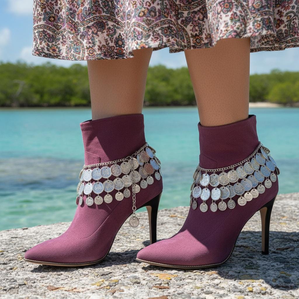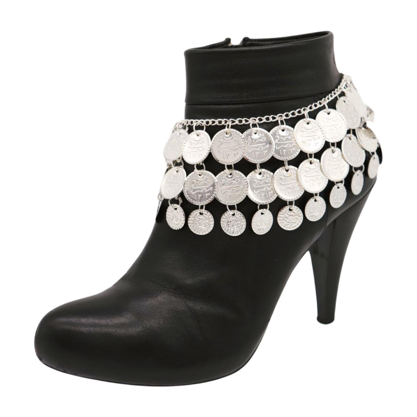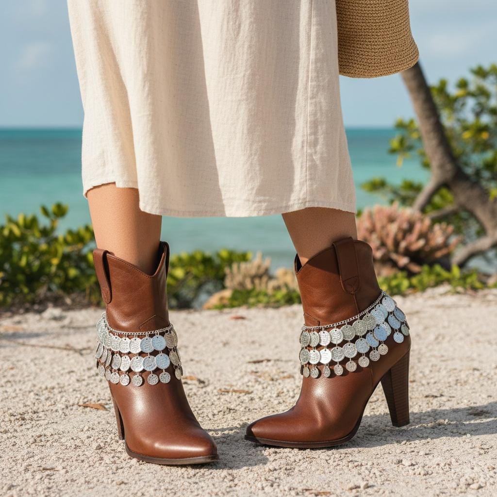 The silver tone chain creates a clean decorative line around the ankle, while the multiple coin charms create a fringe effect that catches light beautifully and moves with every step. These look especially striking with cowboy boots, ankle boots, heeled boots, dress boots, dark boots, neutral boots, and outfits that need one standout detail to tie everything together.