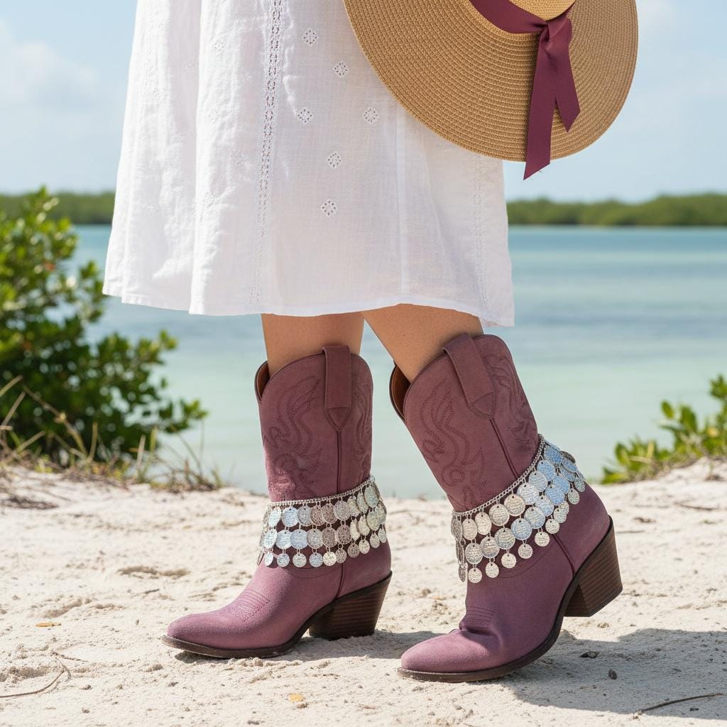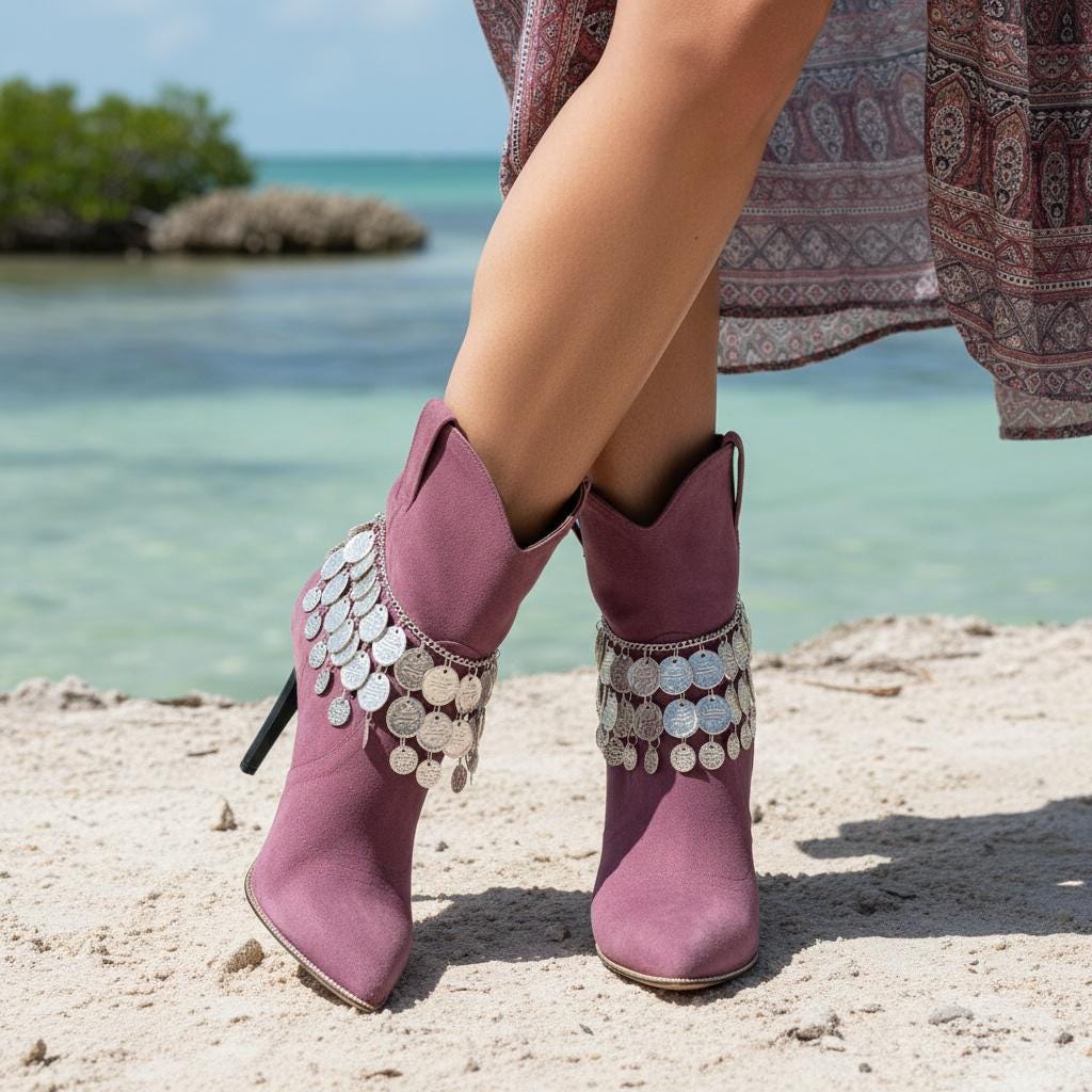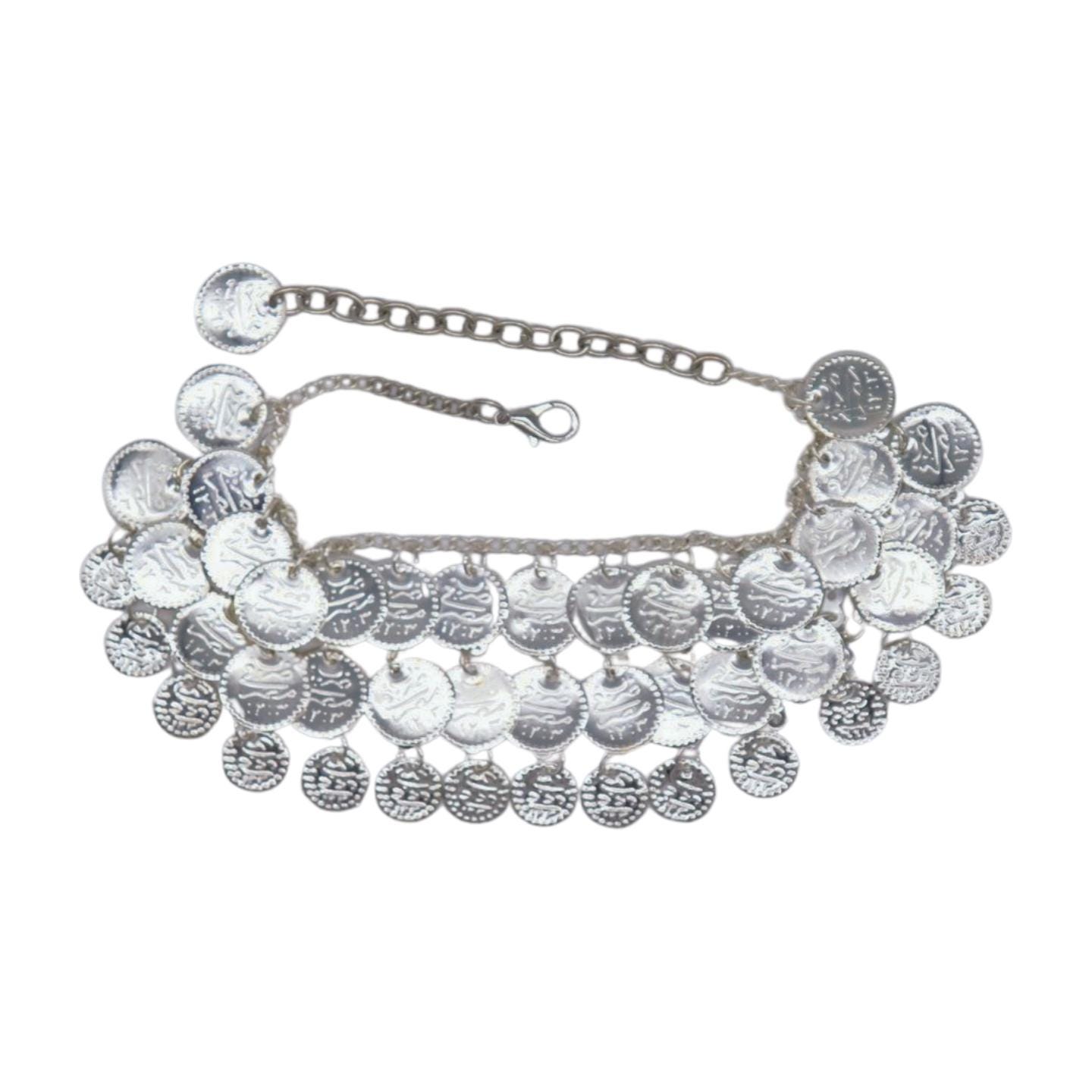The silver tone chain creates a clean decorative line around the ankle, while the multiple coin charms create a fringe effect that catches light beautifully and moves with every step. These look especially striking with cowboy boots, ankle boots, heeled boots, dress boots, dark boots, neutral boots, and outfits that need one standout detail to tie everything together.