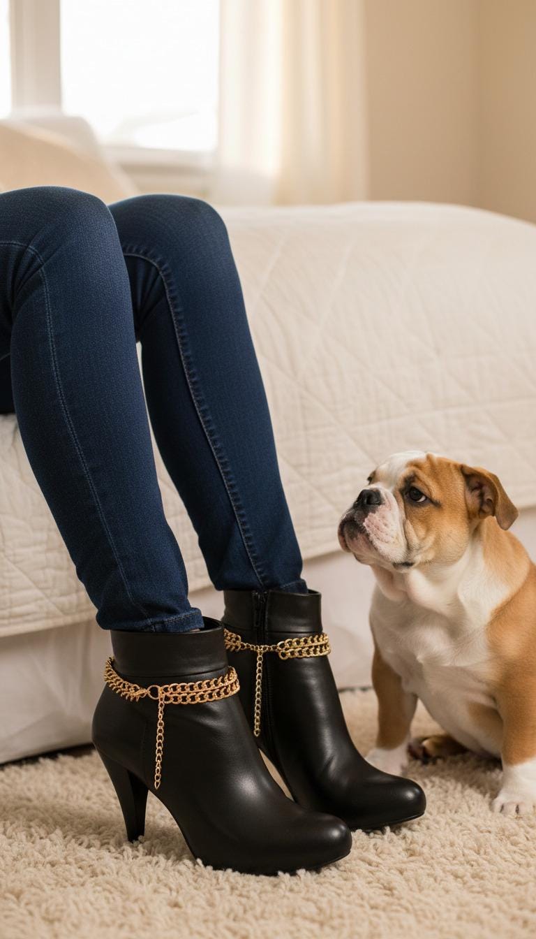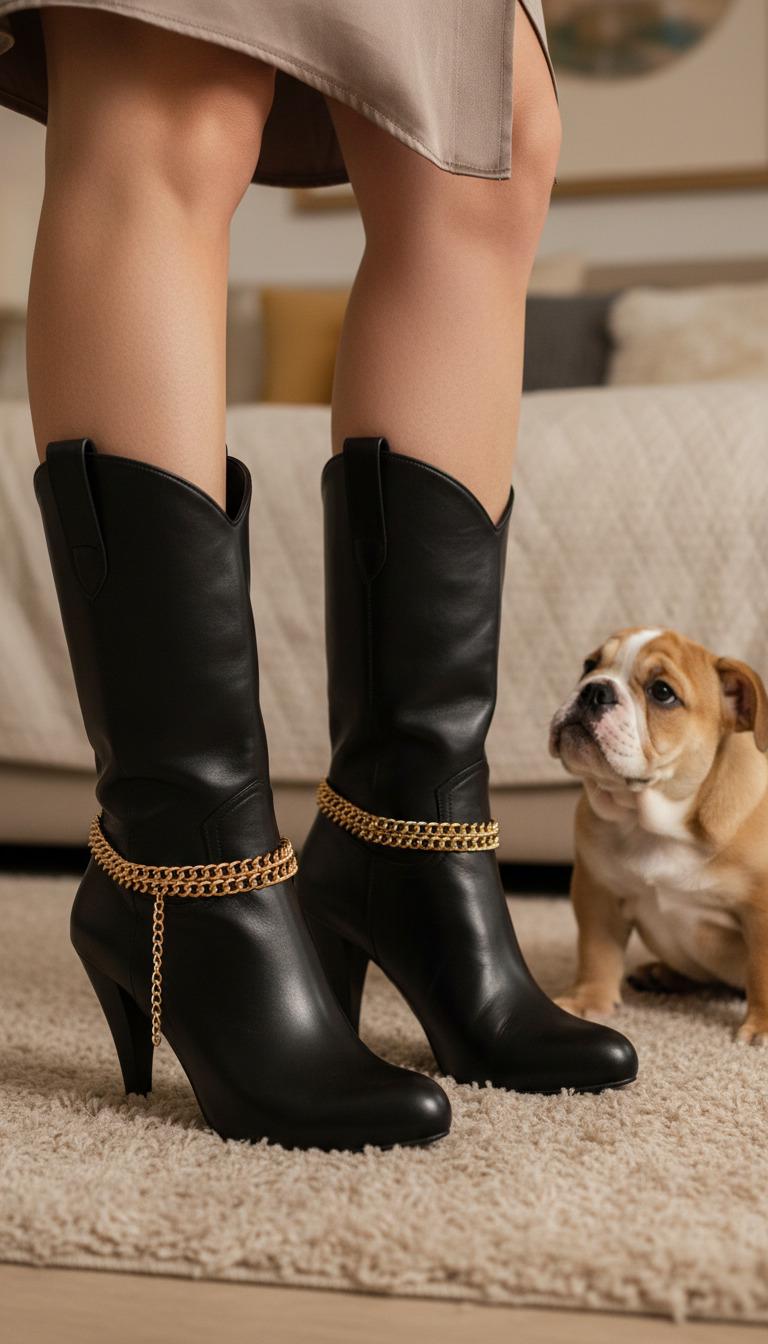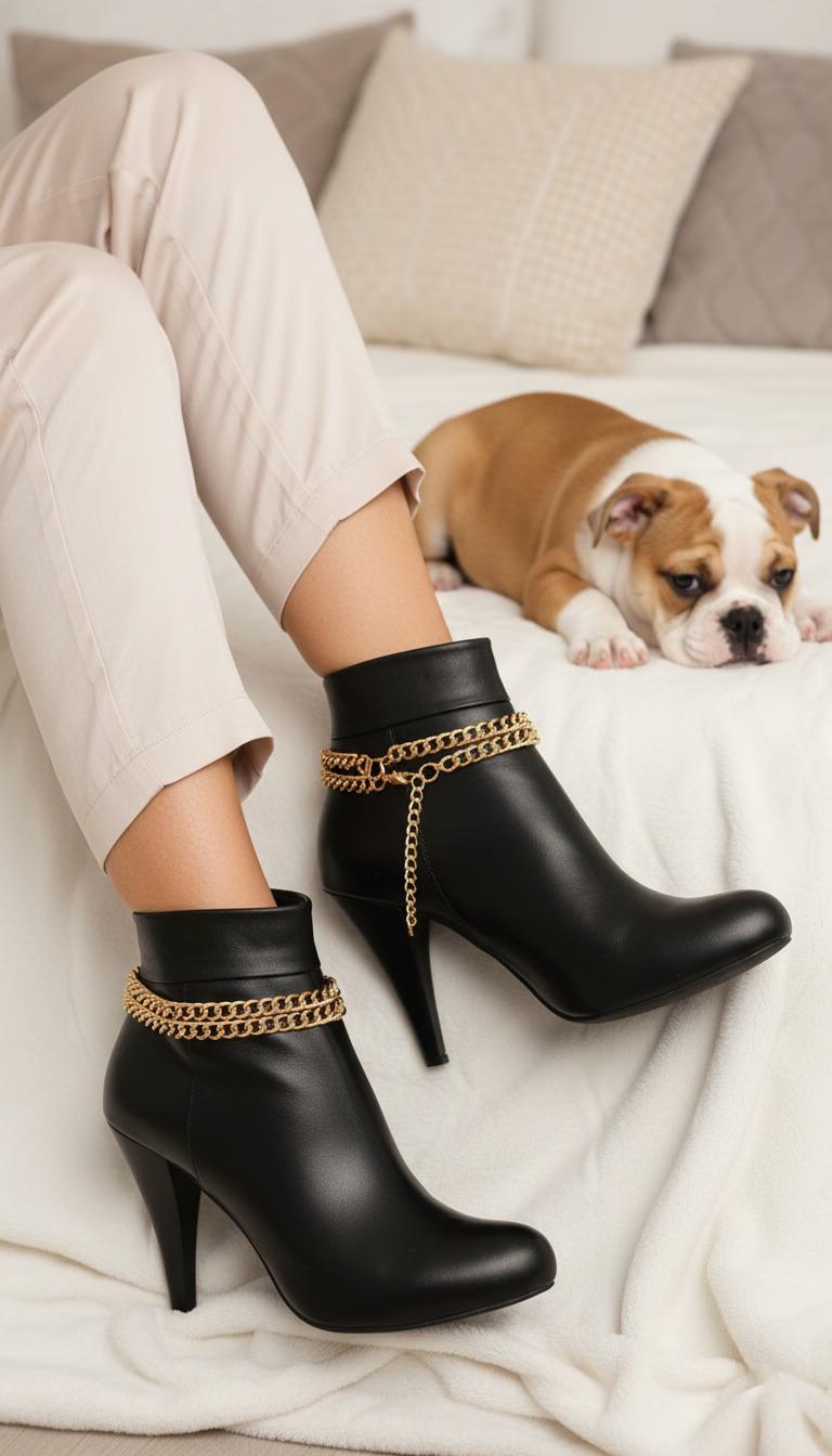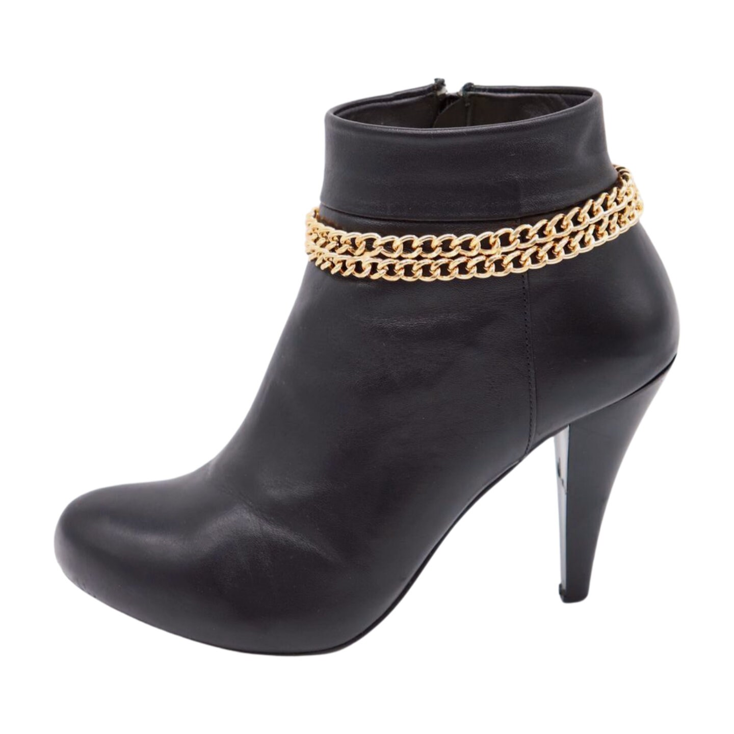 Meet BC97: the “my outfit is finished” accessory for your boots. This set is a pair of gold tone double-strand curb-link boot chain bracelets designed to sit around the ankle area of boots and booties. The look is sleek, modern, and versatile—perfect when you want a statement detail without rhinestones, charms, or anything fussy.