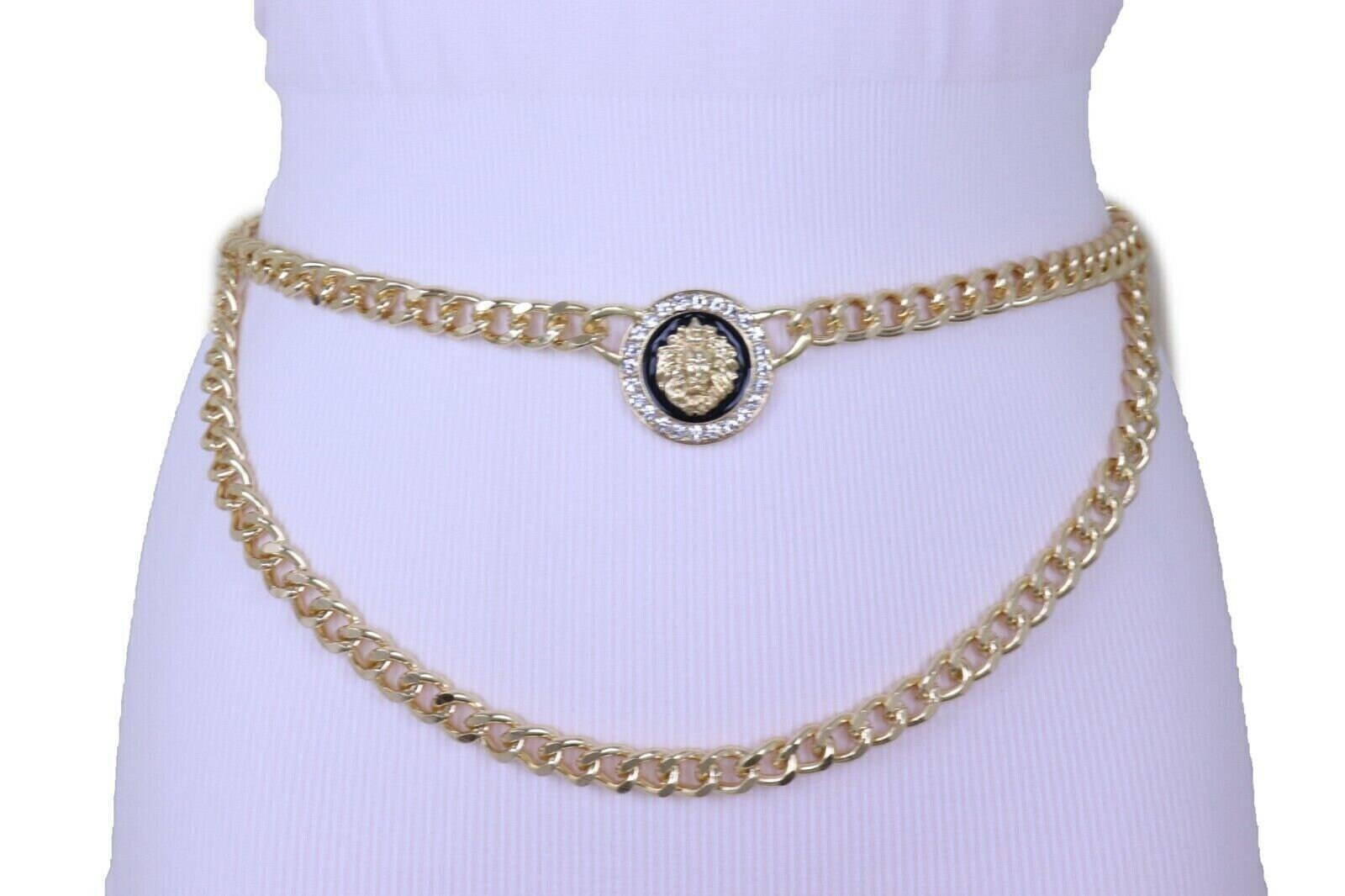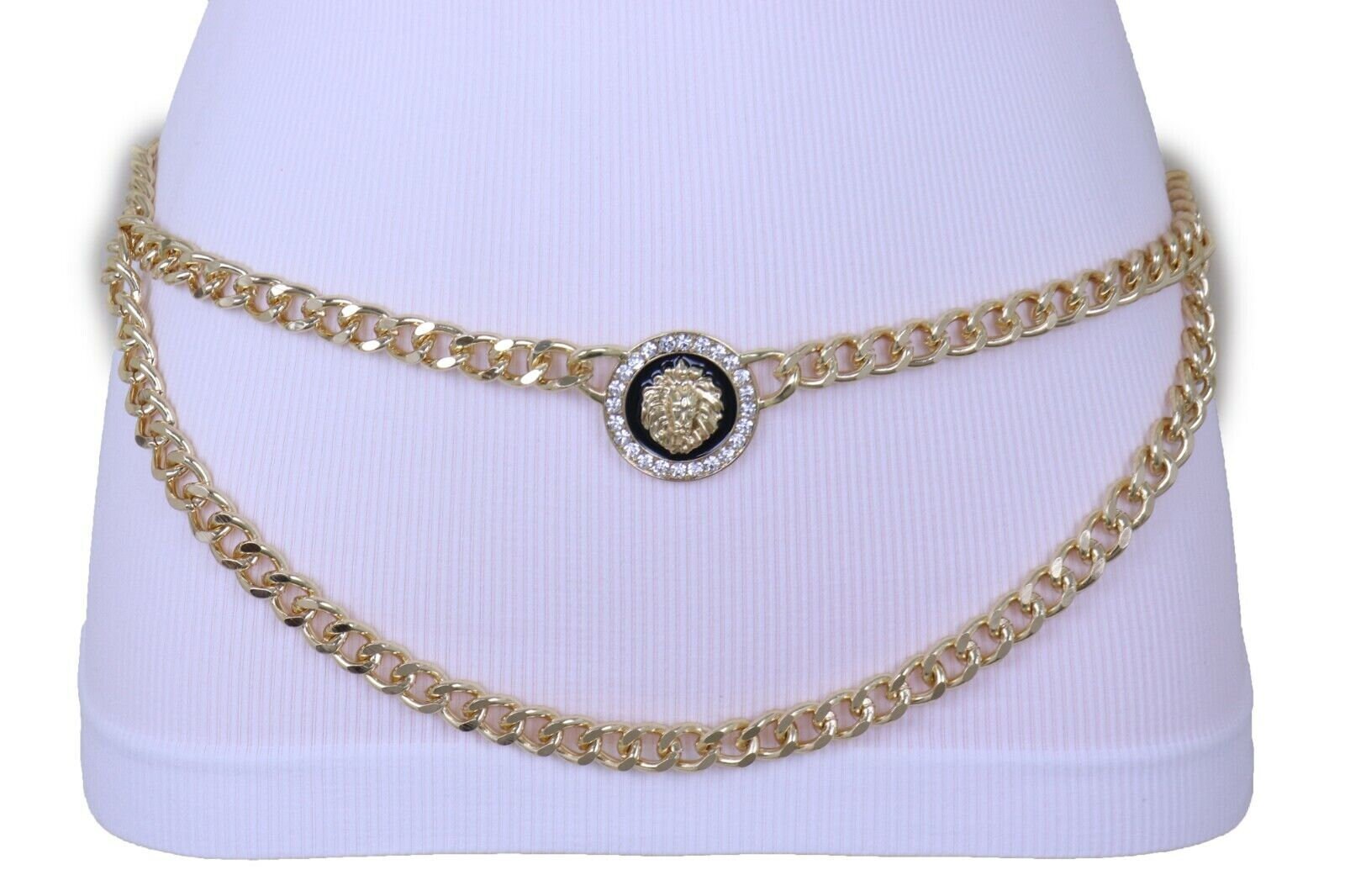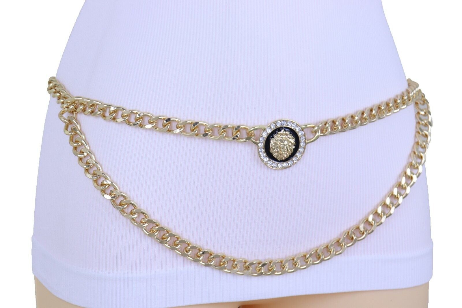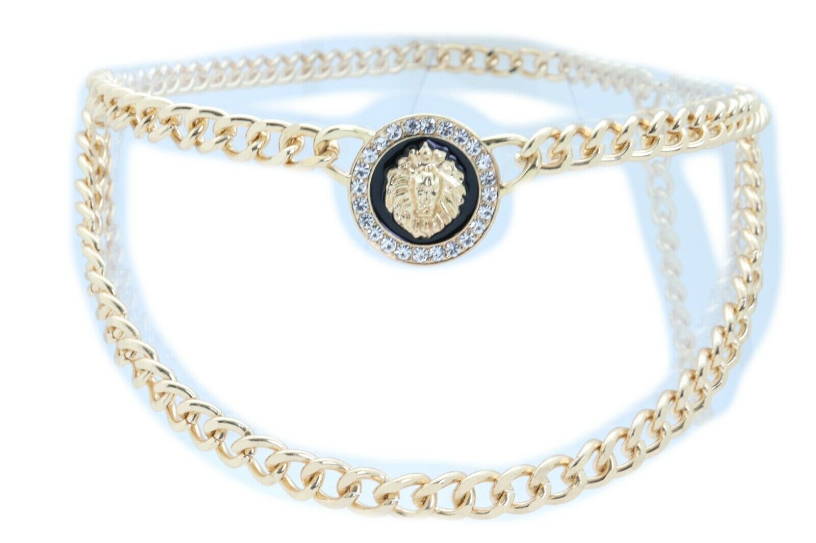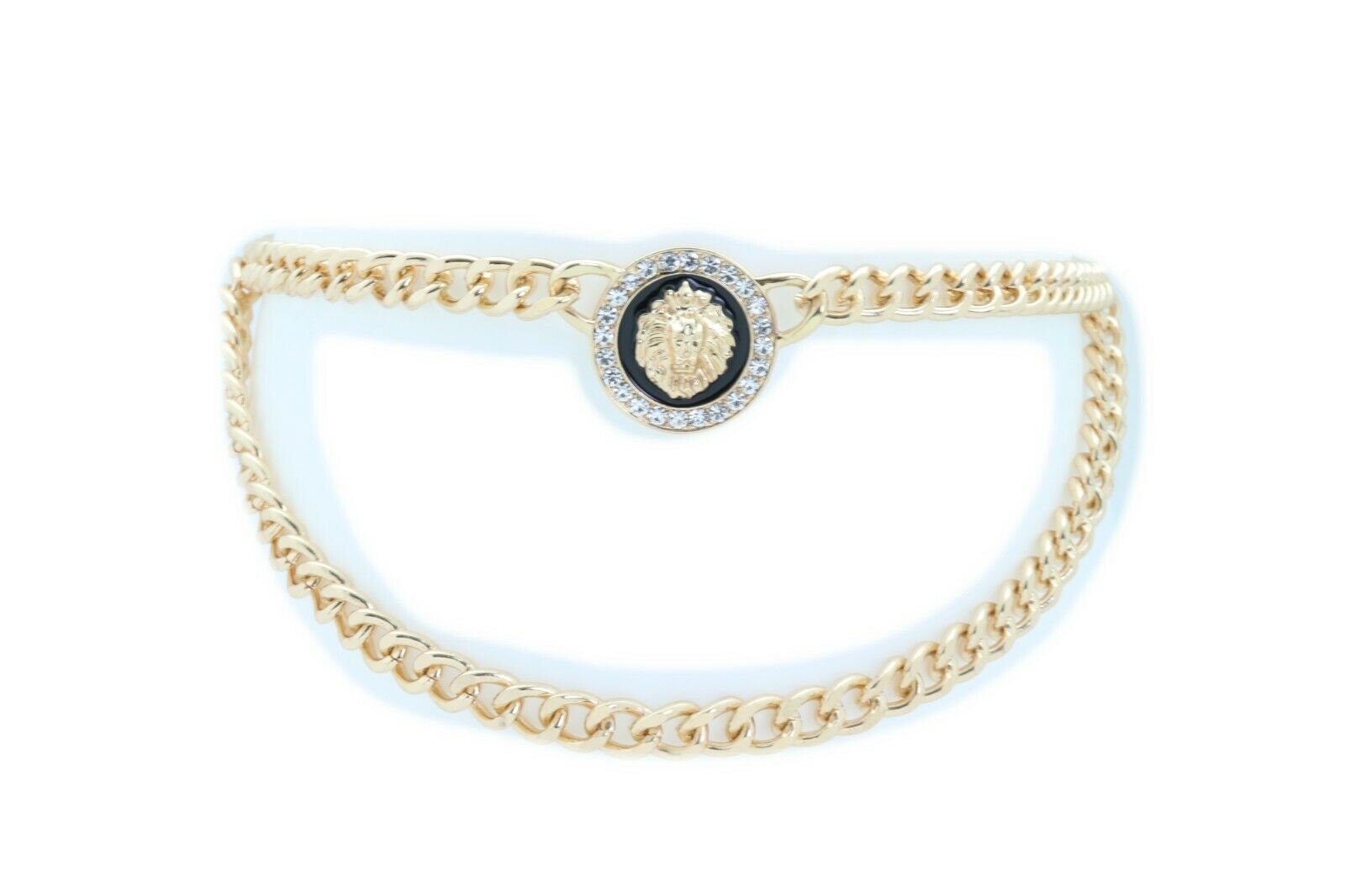 Color : Gold metal chain links waistband and charm + silver rhinestones + black paint detail