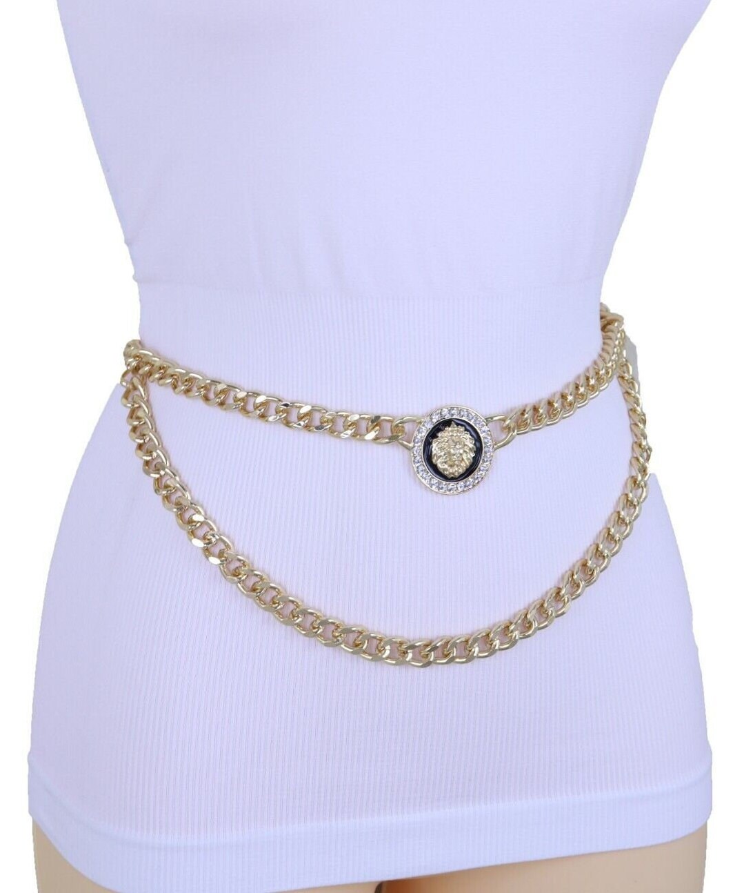 Radiant Gold Elegance: The gold metal chain links, adorned with silver rhinestones and black paint detail, create a radiant and opulent waistband.