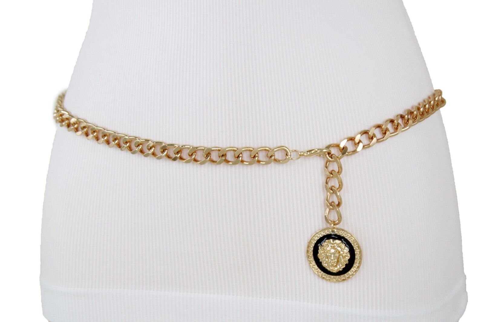 Gold Metal Chain Belt: Lion Coin Charm, Adjustable Waist