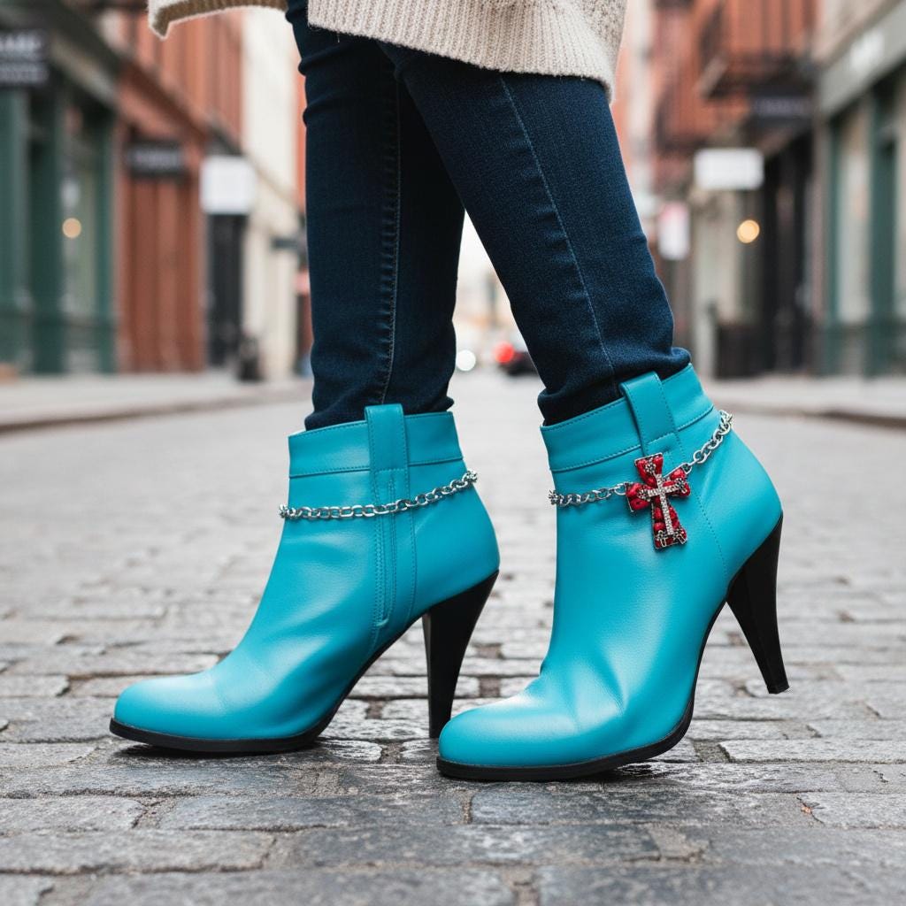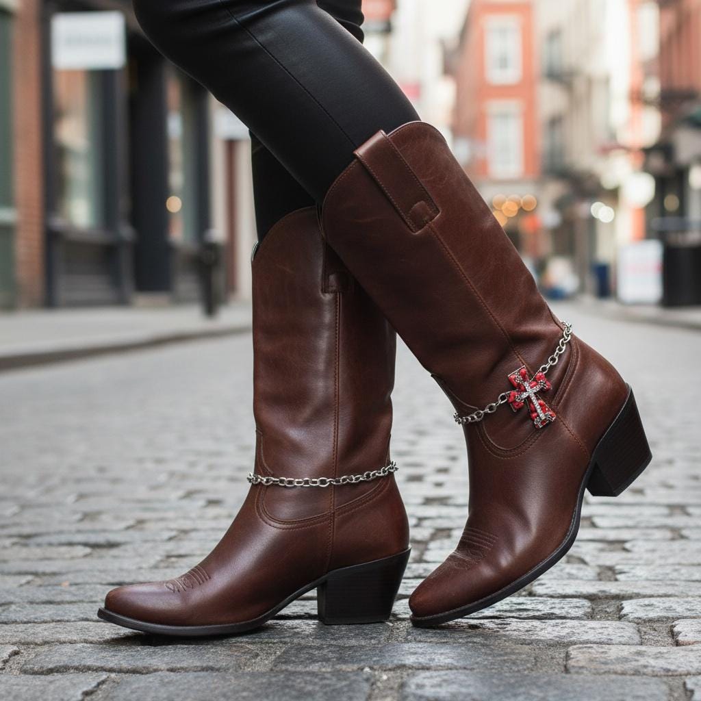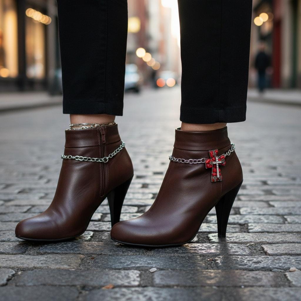 Meet the accessory that makes boots look “styled” in about five seconds. This listing is for a pair (2pcs) of silver-tone boot chain anklets featuring a bold red cross charm with sparkle accents. The chain wraps around the ankle area of your boot, adding shine, movement, and that satisfying little detail people notice when you walk by.