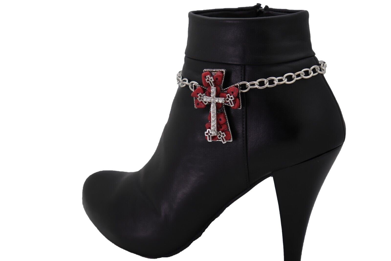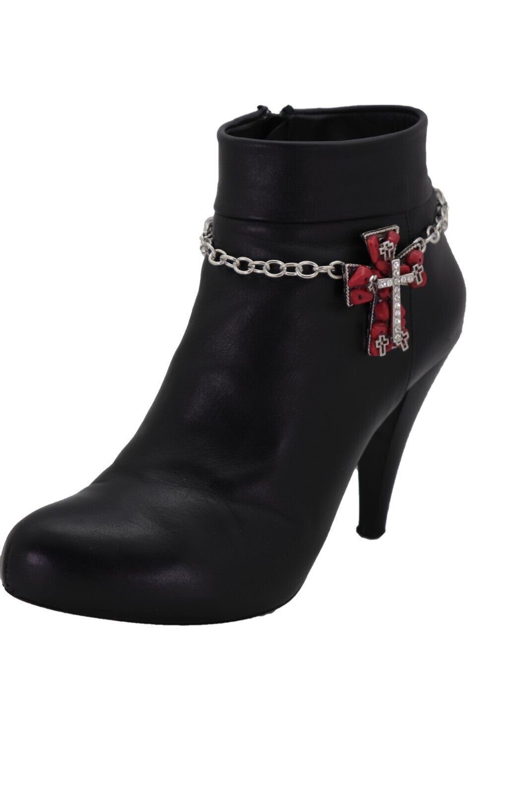 Color: Silver metal chain links and charm + red stone beads + silver rhinestones