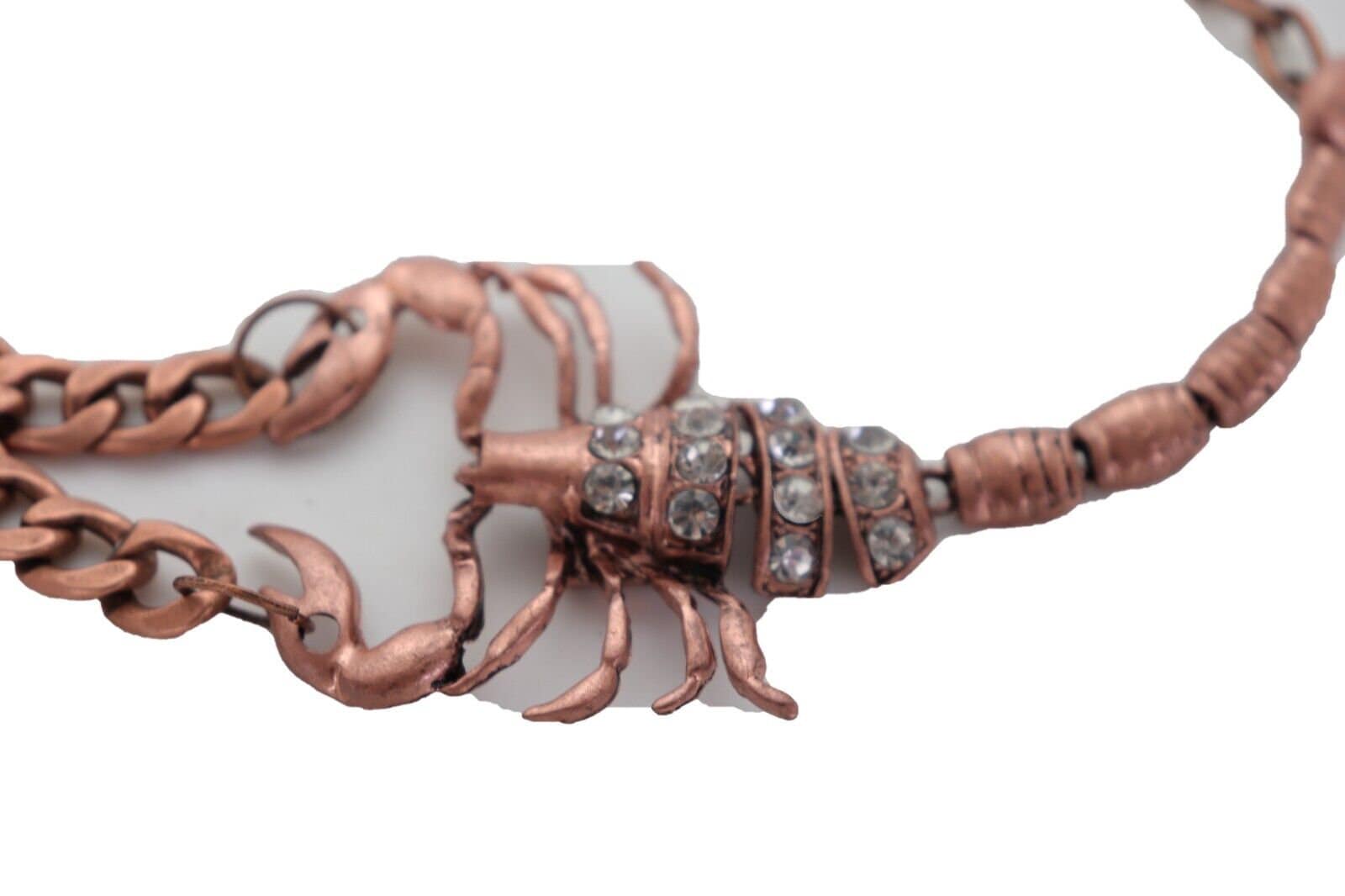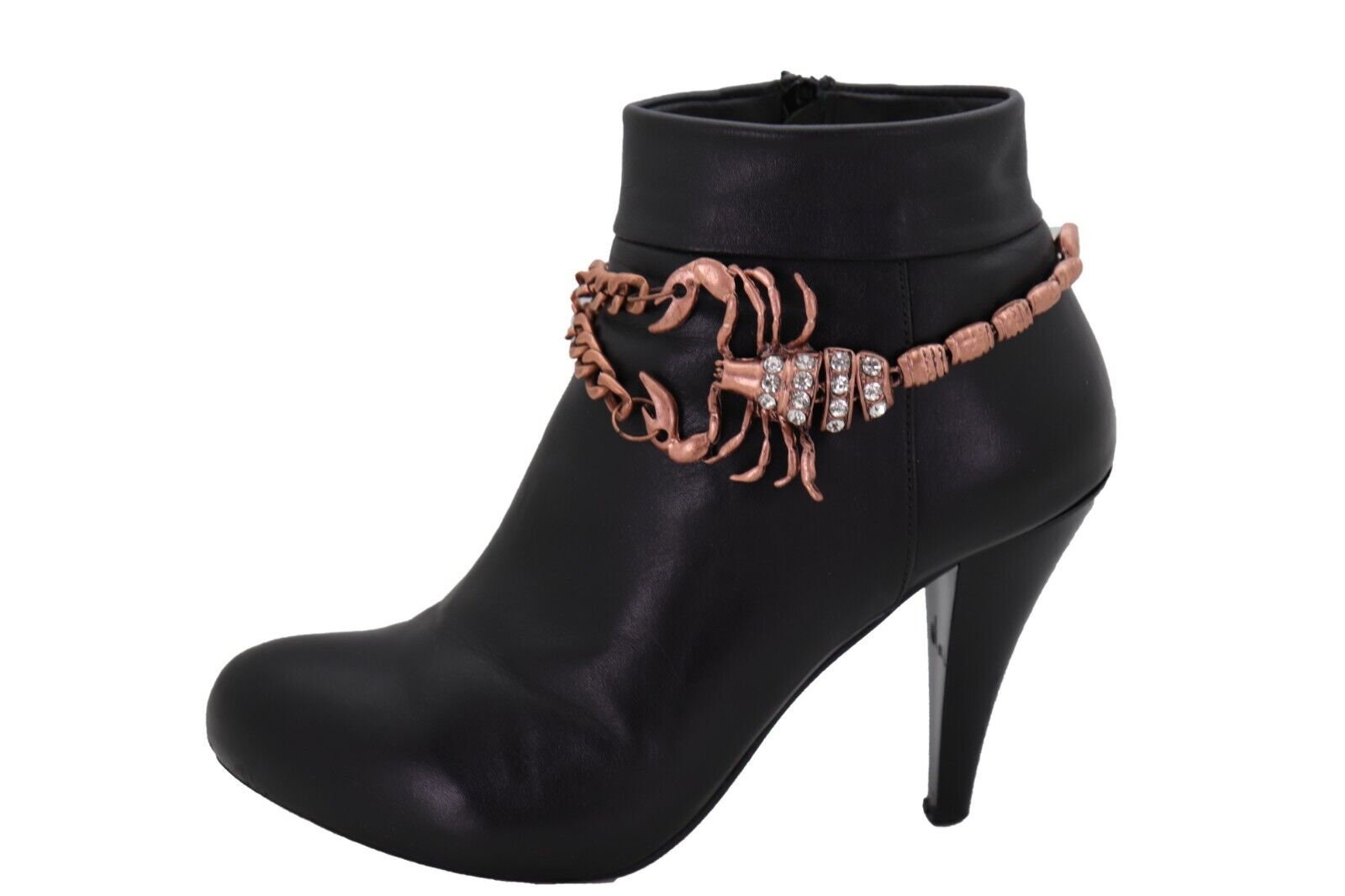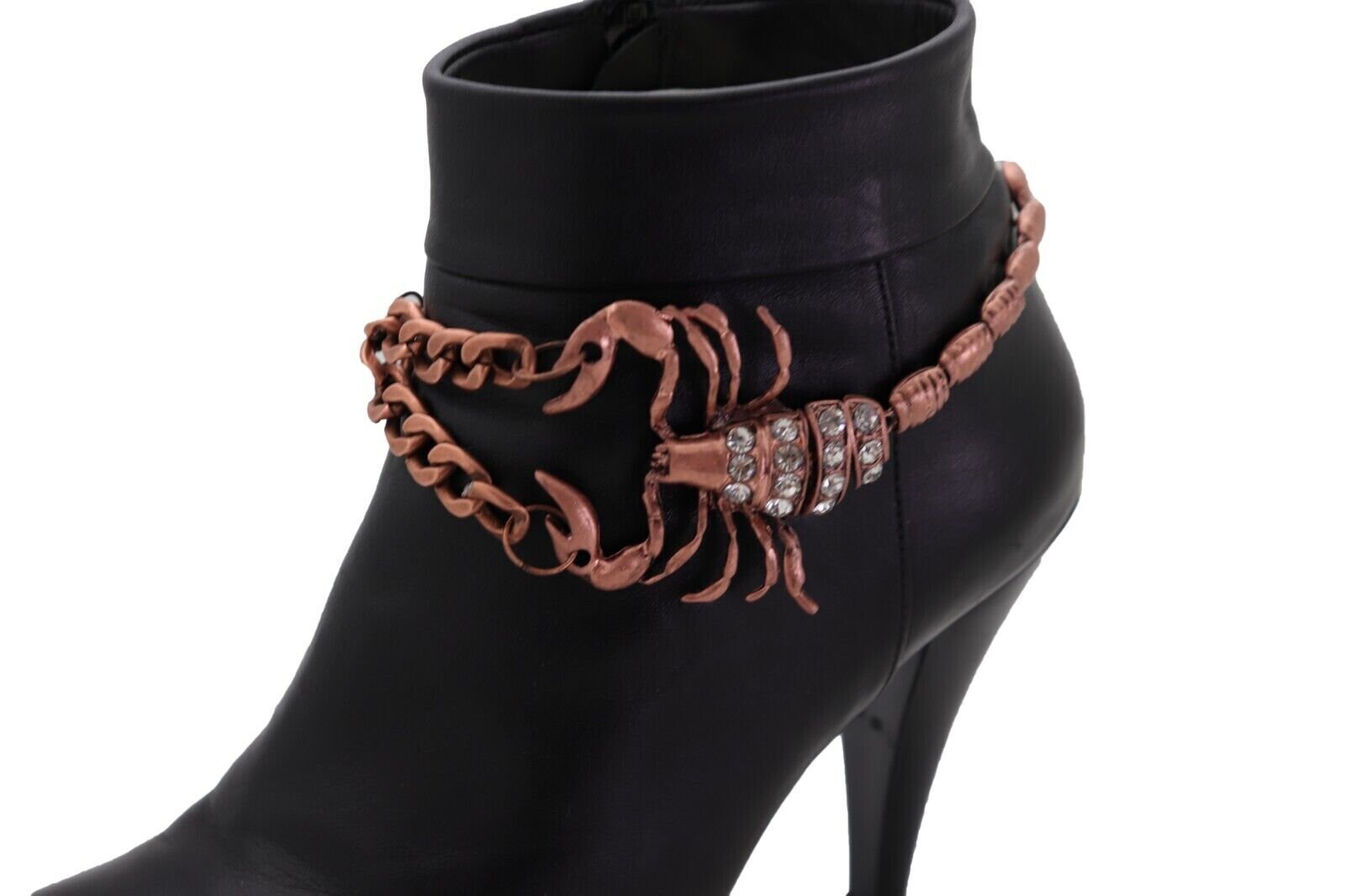 This pair of copper-brown boot chain anklets features a bold scorpion charm with rhinestone sparkle and a draped chain detail that instantly upgrades boots, booties, and ankle boots. Clip them on, let them drape, and suddenly your “simple outfit” looks like a styled look.