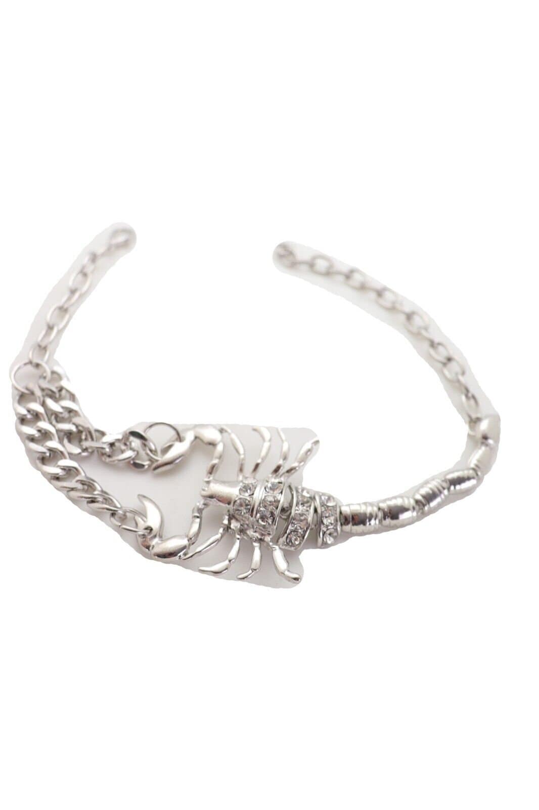 Shiny silver-tone metal chains with a detailed scorpion charm