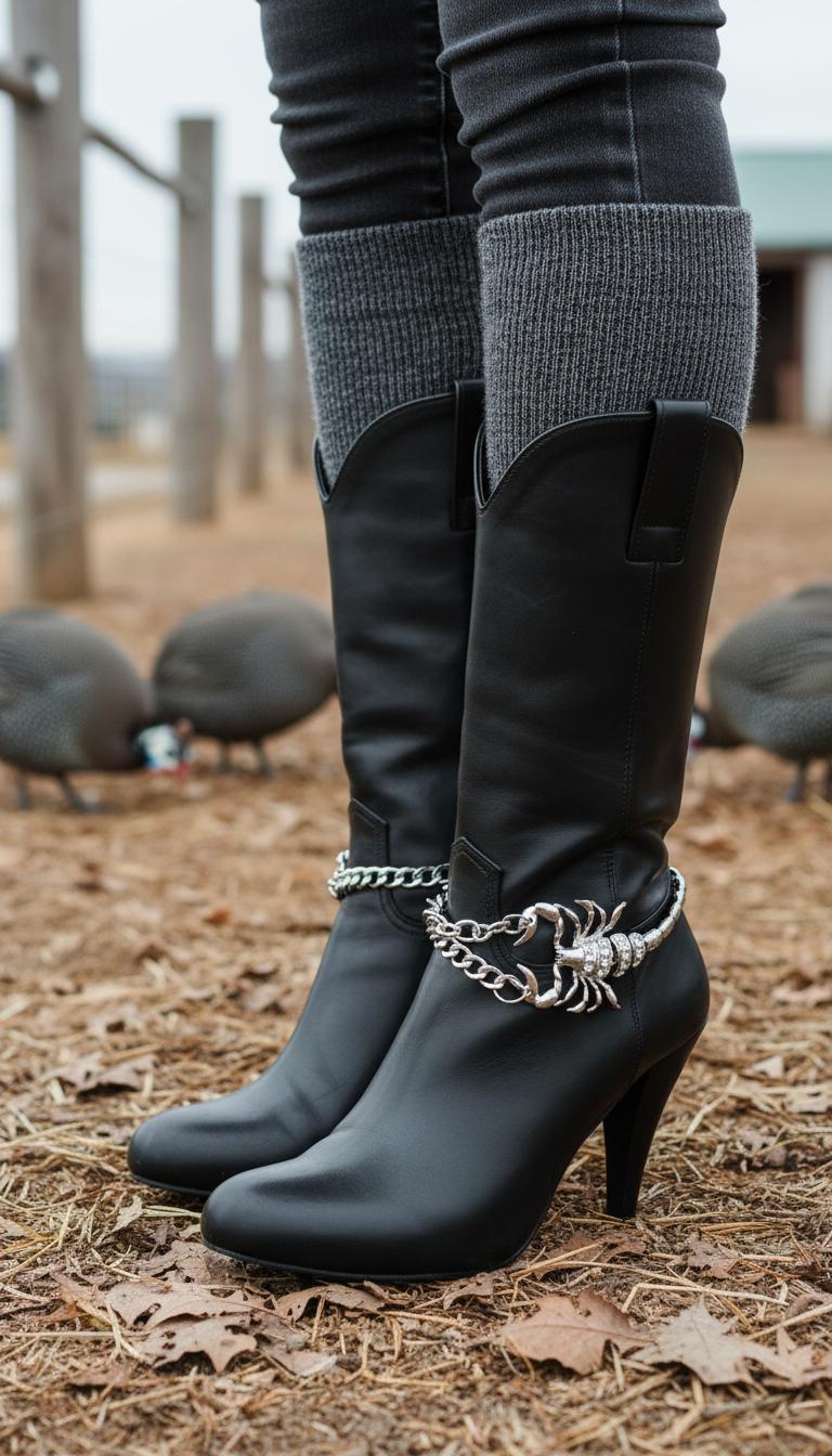 Slip the chain around the narrow part of your boot near the ankle, hook the clasp, and then slide it so the scorpion charm sits on the outer side of the boot.