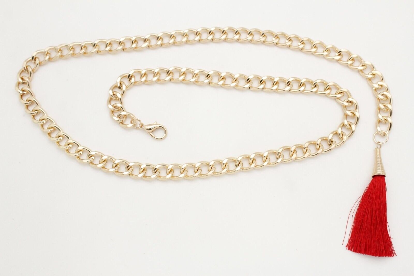 Step into Style with Our Gold Chain Links Waistband Belt – Featuring a Chic Red Fabric Tassel