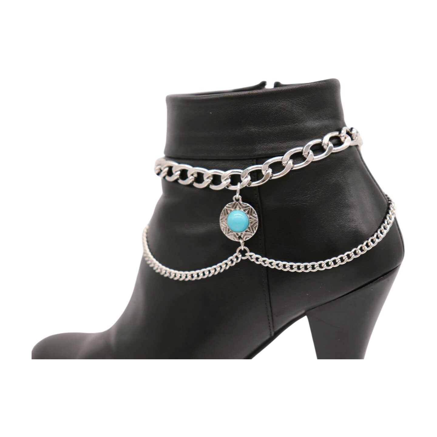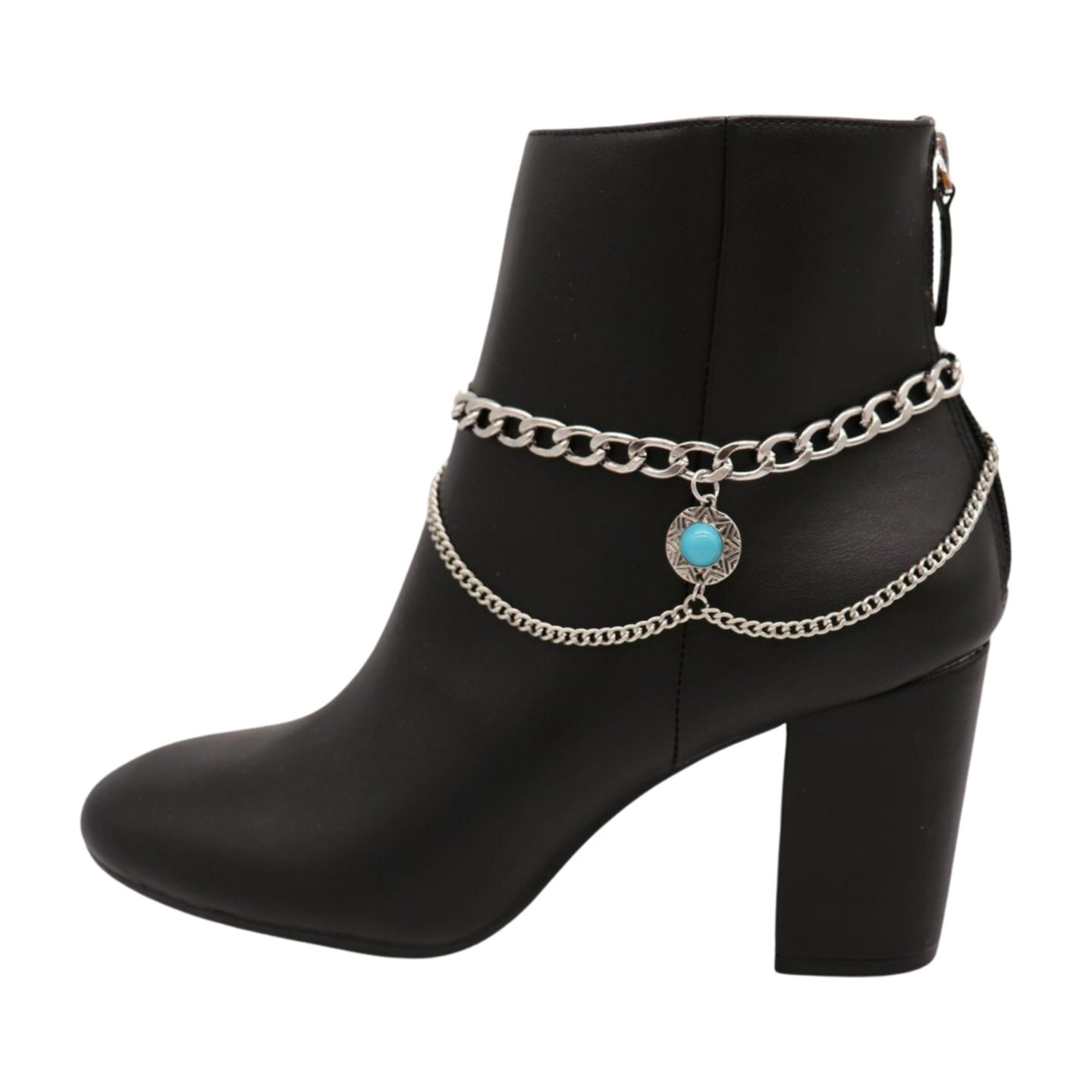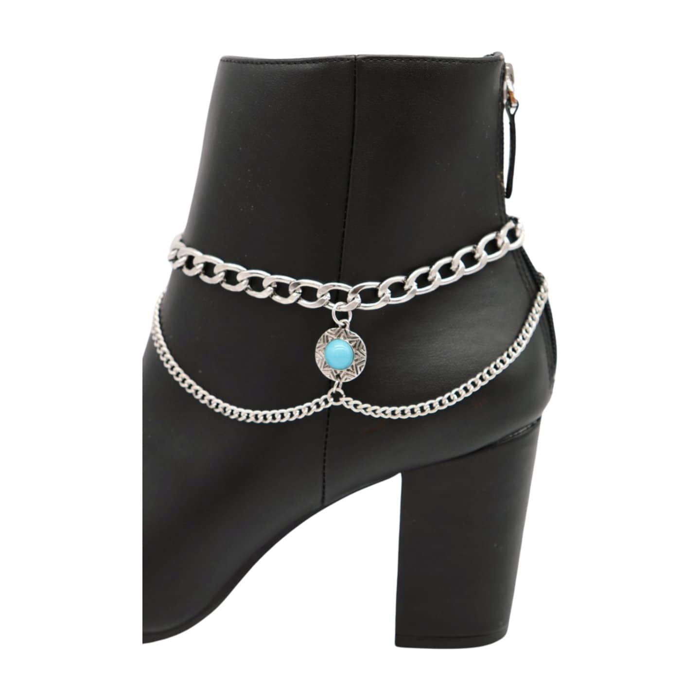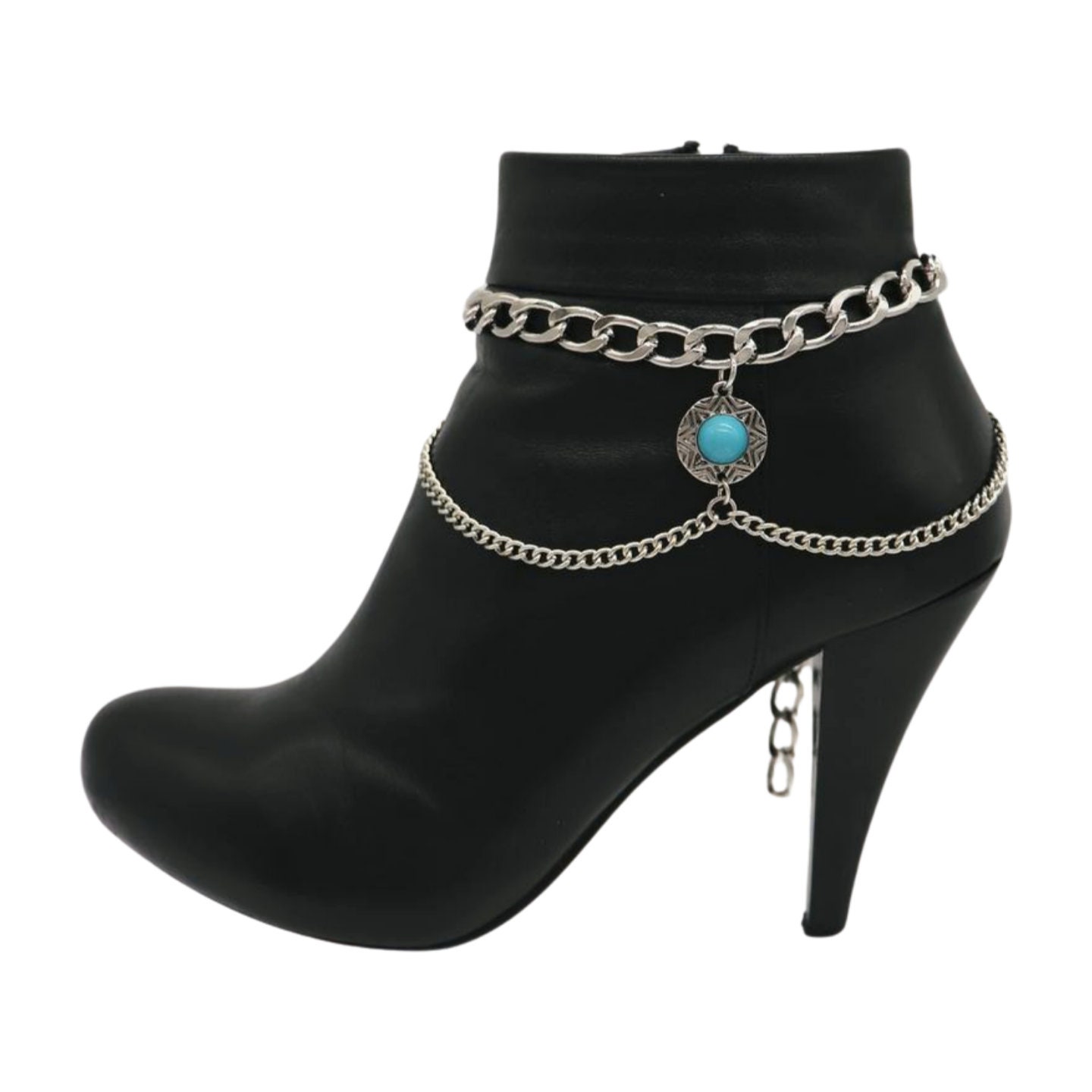 Style is in the details. This handmade pair of boot chain anklets adds an editorial finish with layered silver-tone chains and a turquoise coin charm that brings contrast and movement. Sold as a pair so both boots look balanced. Adjustable length lets you style with a gentle drape for comfort and a natural hang—perfect for photos, events, and standout outfits.